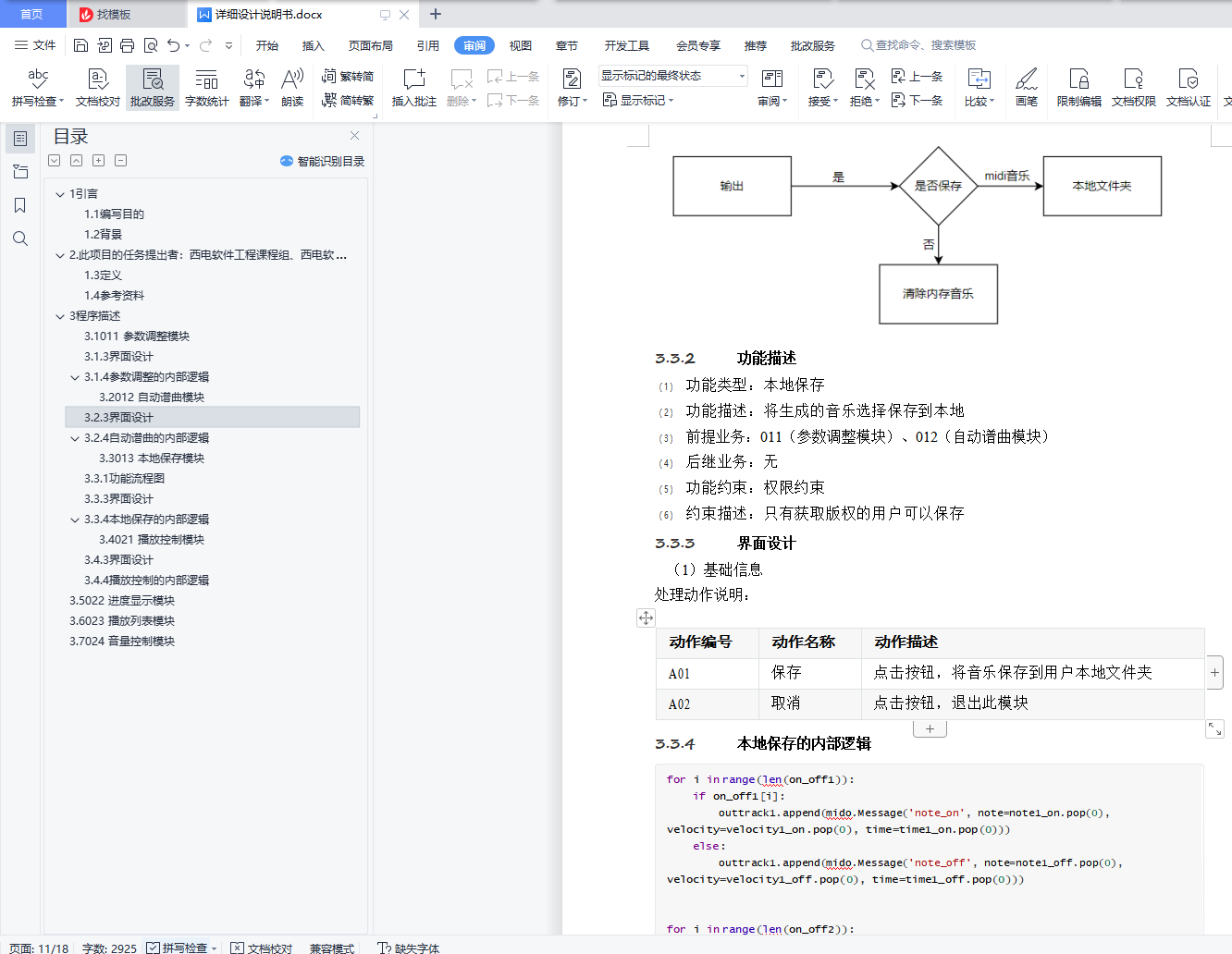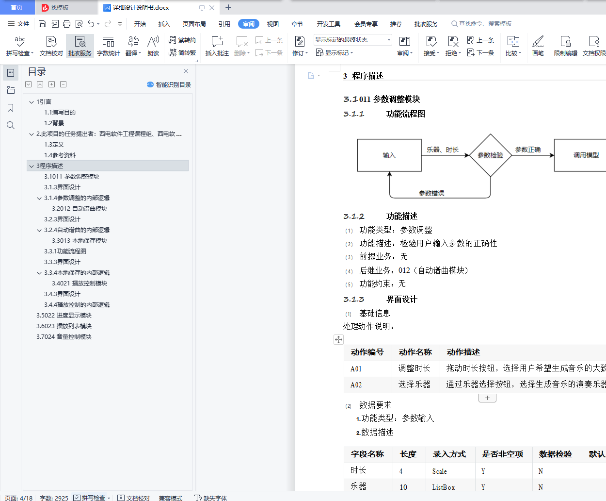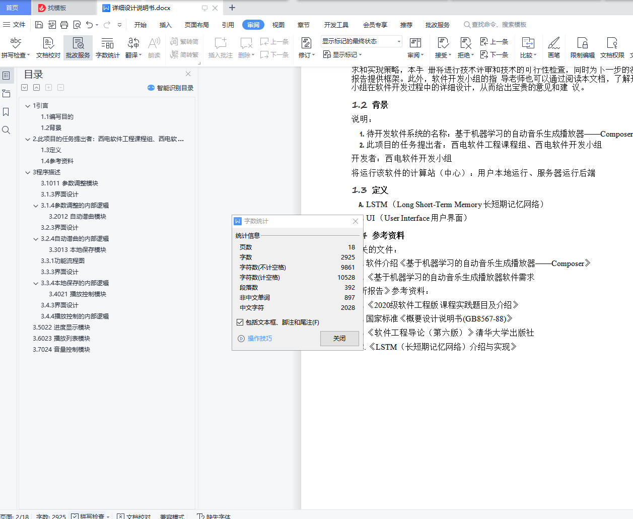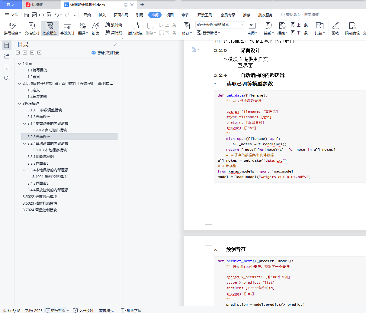 目录详细设计说明书 11 引言 11.1 编写目的 11.2 背景 12. 此项目的任务提出者:西电软件工程课程组、西电软件开发小组 11.3 定义 21.4 参考资料 23 程序描述 43.1 011 参数调整模块 43.1.3 界面设计 43.1.4 参数调整的内部逻辑 53.2 012 自动谱曲模块 63.2.3 界面设计 73.2.4 自动谱曲的内部逻辑 73.3 013 本地保存模块 93.3.1 功能流程图 93.3.3 界面设计 103.3.4 本地保存的内部逻辑 103.4 021 播放控制模块 113.4.3 界面设计 113.4.4 播放控制的内部逻辑 113.5 022 进度显示模块 123.6 023 播放列表模块 143.7 024 音量控制模块 151引言1.1编写目的本说明是基于机器学习的自动音乐生成软件――Composer软件产品的详细设计和实现说明,本文档记录了系统整体实现上技术层面上的考虑,并且以需求说明作为依据,同时该文档将作为产品实现、特性 要求和控制的依据。软件开发小组的每一位参与开发成员应该阅读本说明,以清楚产品在技术方面的要求和实现策略,本手 册将进行技术评审和技术的可行性检查,同时为下一步的测试报告提供框架。此外,软件开发小组的指 导老师也可以通过阅读本文档,了解开发小组在软件开发过程中的详细设计,从而给出宝贵的意见和建 议。1.2背景说明:1.待开发软件系统的名称:基于机器学习的自动音乐生成播放器――Composer2.此项目的任务提出者:西电软件工程课程组、西电软件开发小组开发者:西电软件开发小组将运行该软件的计算站(中心):用户本地运行、服务器运行后端1.3定义A.LSTM (Long Short-Term Memory 长短期记忆网络)B.UI (User Interface 用户界面)1.4参考资料相关的文件:A.软件介绍《基于机器学习的自动音乐生成播放器――Composer》B.《基于机器学习的自动音乐生成播放器软件需求分析报告》参考资料:A.《2020级软件工程版 课程实践题目及介绍》B.国家标准《概要设计说明书(GB8567-88)》C.《软件工程导论(第六版)》清华大学出版社C. 《LSTM(长短期记忆网络)介绍与实现》