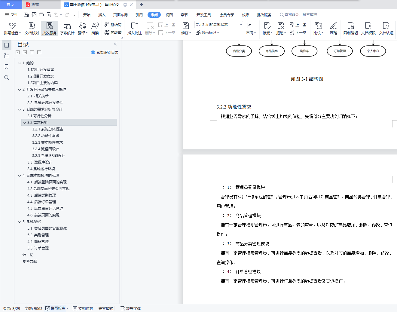 摘 要微信小程序在日常生活中应用越来越广,网上消费、游戏娱乐等成为了一种常见应用方式。为进一步了解和探索微信小程序在点餐系统中的潜在价值和意义,本文通过使用 Javascript 技术、Spring boot、vue、WXML、WXSS 等技术,开发了基于微信小程序的茶叶购买系统,实现了浏览商品、下单结算、分享等功能,基本满足了用户购物方面的需求,并且该系统具有随用随走,不需要下载 APP,使用方便等特点。这一小程序的开发能为以后开发类似的小程序提供借鉴和帮助,具有一定的理论和实际意义。关键词: 关键词:茶叶购买,Java,VUE,MYSQLWechat apps are more and more widely used in daily life, online consumption, games and entertainment have become a common way of application. In order to further understand and explore the potential value and significance of wechat applets in the ordering system, this paper uses javascript technology, spring boot, Vue, wxml, wxss The tea purchase system based on wechat applet is developed, which realizes the functions of Browsing Goods, ordering settlement, sharing and so on, and basically meets the needs of users in terms of shopping. Moreover, the system has the characteristics of "go with you", no need to download app, and easy to use. The development of this small program can provide reference and help for the future development of similar small programs, which has certain theoretical and practical significance.Key words: tea purchase, Java, Vue, MySQL目录1 绪论 31.1 项目开发背景 41.2 项目开发意义 41.3 项目主要的内容 42 开发环境及相关技术概述 42.1 相关技术 42.2 系统环境开发条件 63 系统的需求分析与设计 63.1可行性分析 63.2需求分析 63.2.1系统总体概述 63.2.2功能性需求 73.2.3非功能性需求 73.2.4流程图设计 83.2.5系统ER图设计 103.3 数据库设计 123.4系统运行环境 154 系统功能模块的实现 154.1 后端登陆页面的实现 164.2后端商品列表页面实现 174.3 后端类别管理 184.4 后端订单管理 194.5 后端留言评论管理 194.6 前端页面的实现 20商品前端展示列表部分代码如下: 215 系统测试 225.1 登陆页面的实现测试 235.2 类别管理 235.4 商品管理 245.5 订单管理 24结 论 24参考文献 25