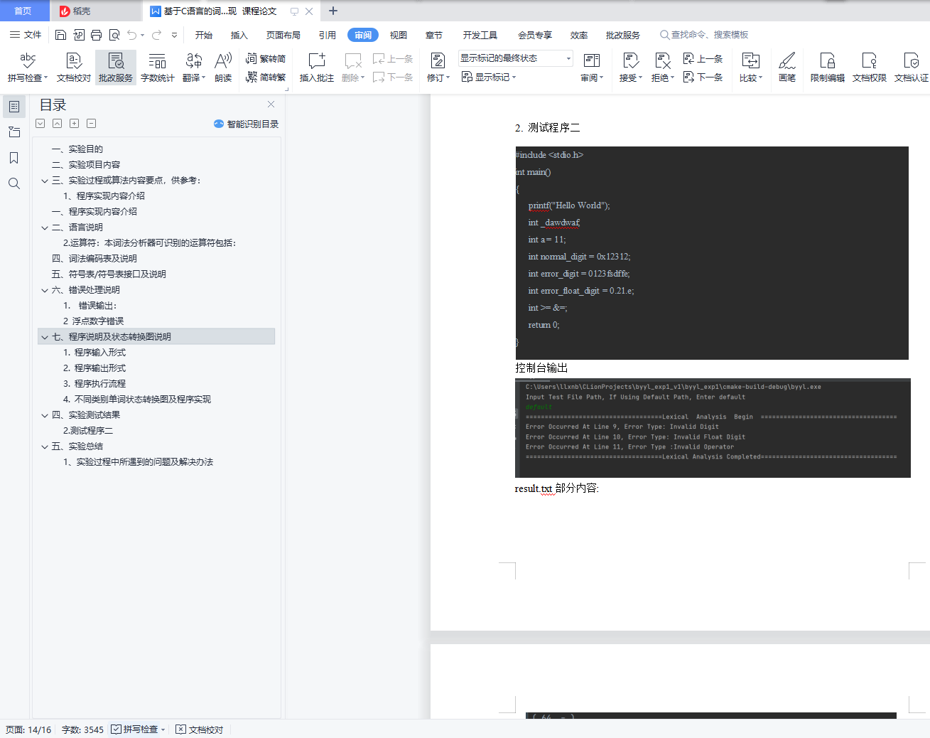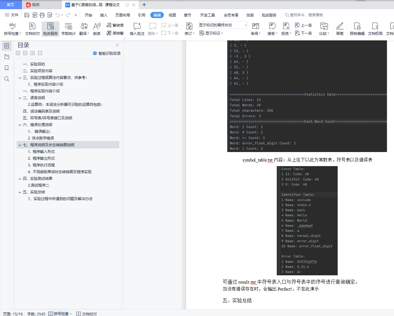 3) 检查源程序中存在的词法错误,并报告错误所在的位置;