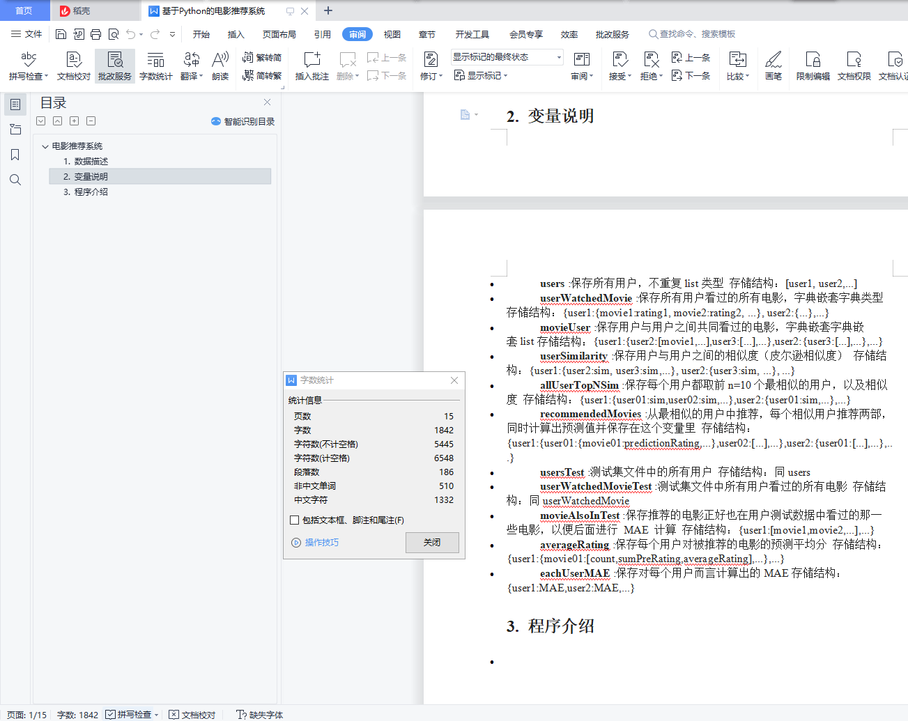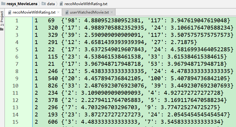 ・ recommendedMovies :从最相似的用户中推荐,每个相似用户推荐两部,同时计算出预测值并保存在这个变量里 存储结构:{user1:{user01:{movie01:predictionRating,...},user02:[...],...},user2:{user01:[...],...},...}