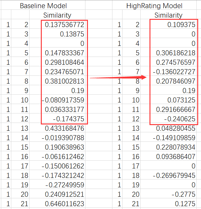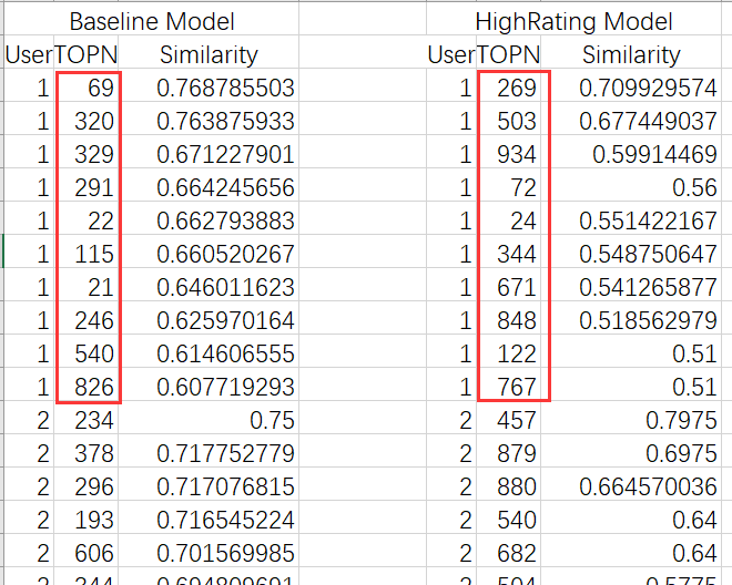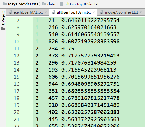 ・ allUserTopNSim :保存每个用户都取前 n=10 个最相似的用户,以及相似度 存储结构:{user1:{user01:sim,user02:sim,...},user2:{user01:sim,...},...}