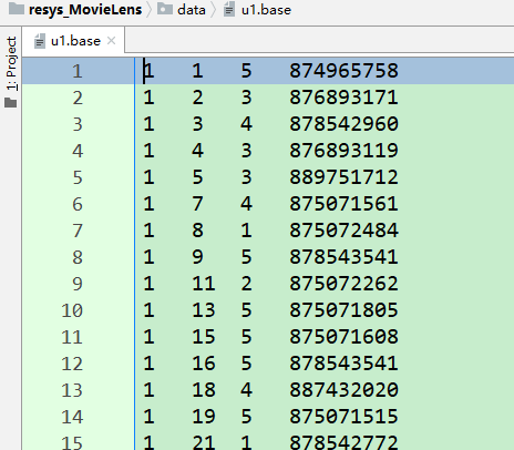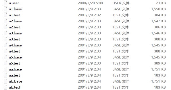 数据集来源于MovieLens|GroupLens网站。完整的数据集是由 943 个用户对 1682 个项目的 100000 个评分组成。每位用户至少对 20 部电影进行了评分。用户和项从 1 开始连续编号。数据是随机排列的。这是一个以选项卡分隔的:用户id|项id|分级|时间戳 列表。从 1970年1月1日 UTC 开始,时间戳是unix时间戳。在这些数据集的基础上,small-movielens 还包括 u1-u5,ua,ub 等七组测试集 (*.base)/训练集 (*.test) 数据。其中,u1-u5 是以 8:2 的比例随机生成互斥的训练集和测试集;ua、ub 是按照 9:1 的比例随机生成的互斥的训练集和测试集,不同的是,这两组数据的测试集中每个用户是对正好 10 部不同电影进行了评分。数据集如下图所示。