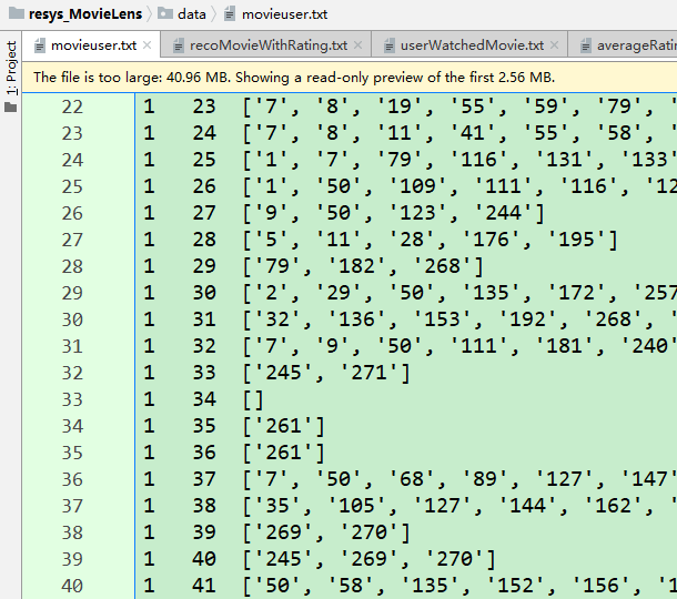 ・ movieUser :保存用户与用户之间共同看过的电影,字典嵌套字典嵌套 list 存储结构:{user1:{user2:[movie1,...],user3:[...],...},user2:{user3:[...],...},...}