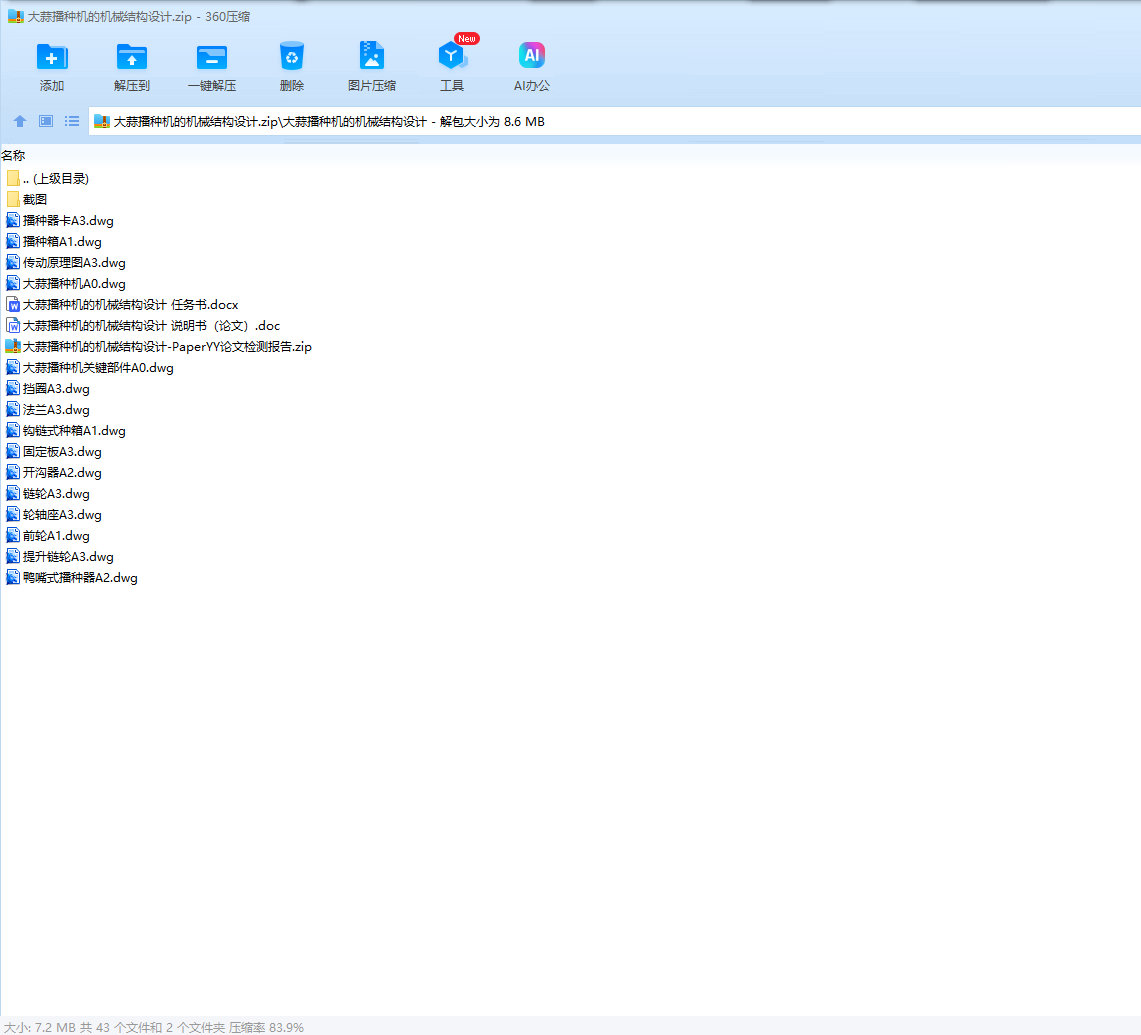 随着农业现代化的推进,自动化、机械化播种技术已经成为提高农业生产效率、减轻劳动力负担的重要途径。大蒜作为我国重要的蔬菜作物之一,其播种过程中的自动化水平相对较低,仍存在大量依赖人工操作的环节。因此,开发一款高效、实用的大蒜播种机具有重要的现实意义和应用价值。此外,市场上的大型大蒜播种机虽然功能较为完善,但往往价格昂贵,对于一般种植户而言难以承受。因此,设计一款结构合理、性价比高的大蒜播种机,可以满足更多种植户的需求,推动大蒜种植业的健康发展。在选题过程中,通过查阅相关文献资料、了解市场需求和技术发展趋势,发现大蒜播种机的机械结构设计是一个具有挑战性和创新性的课题。通过深入研究和实践,可以探索出更加高效、实用的机械结构设计方案,为大蒜播种机的研发和推广提供技术支持和参考。