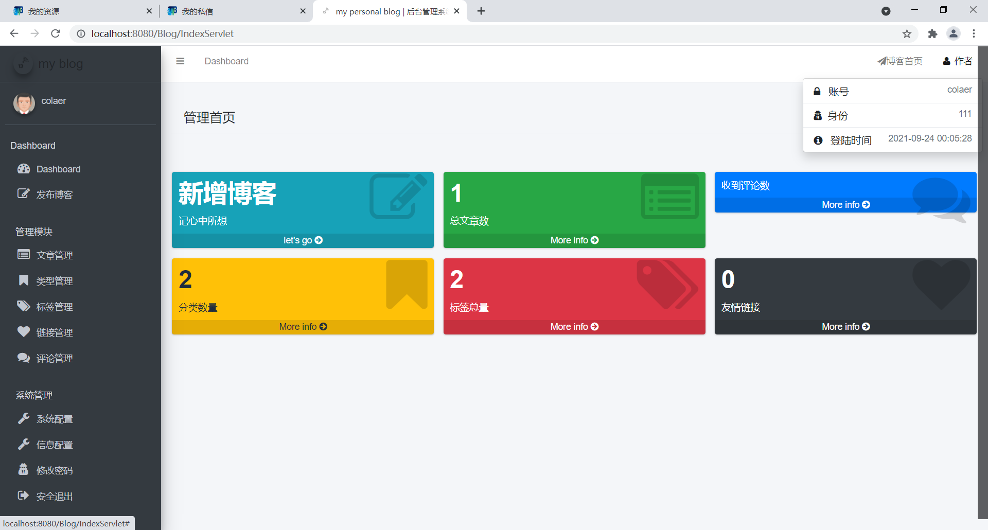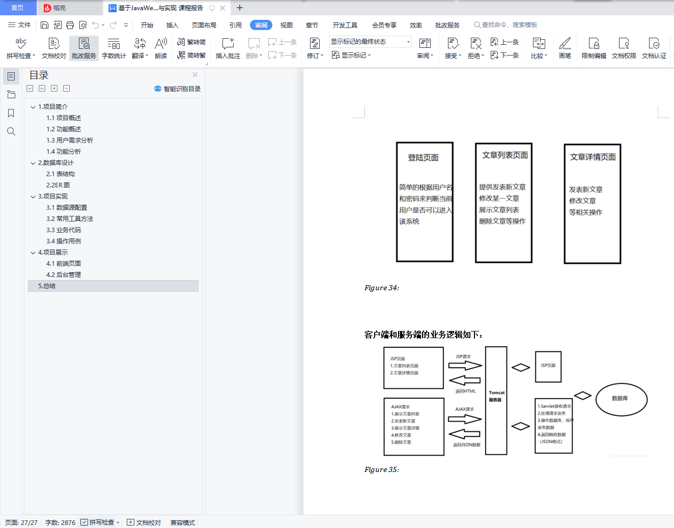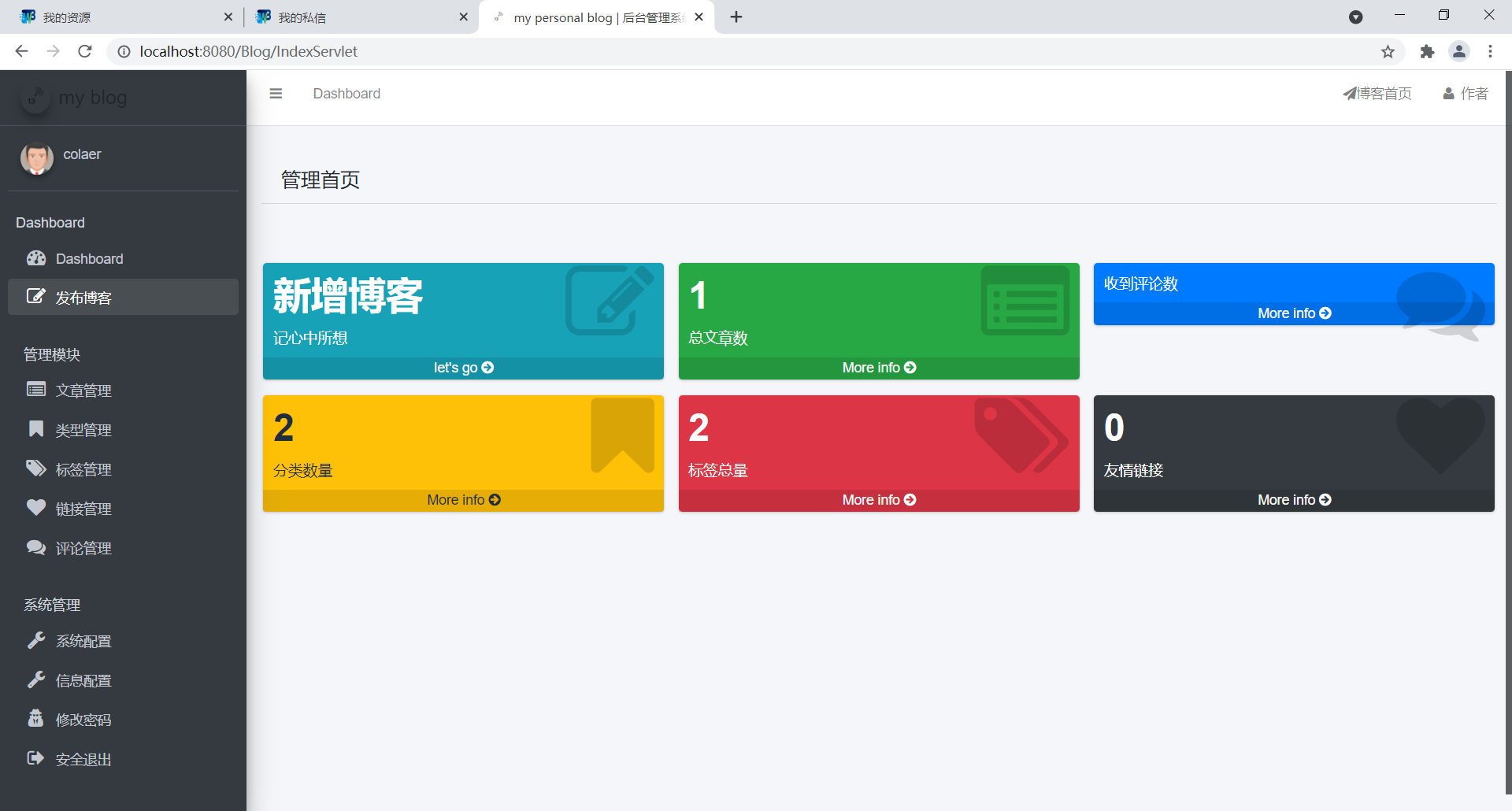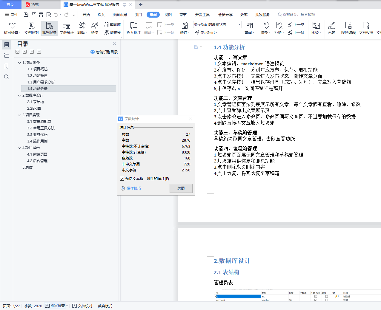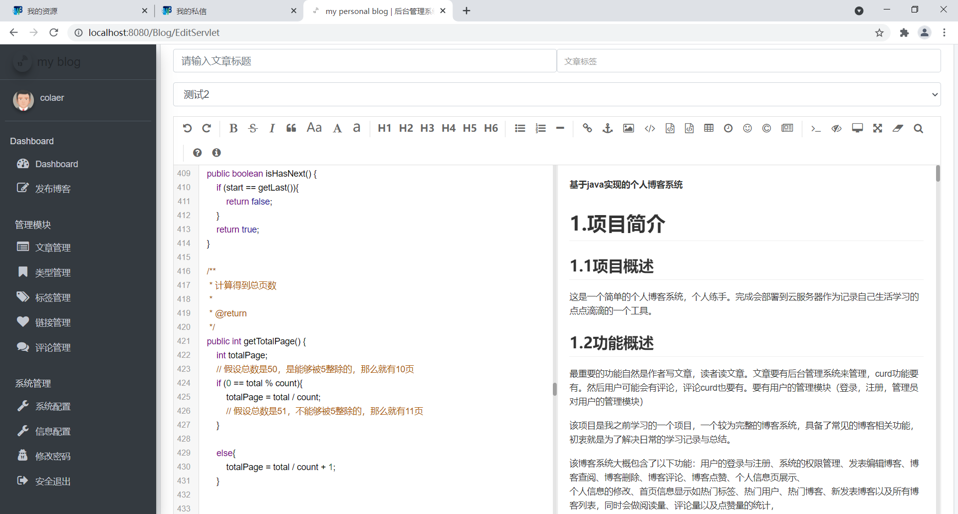 基于java实现的个人博客系统目录1.项目简介 11.1项目概述 11.2功能概述 21.3用户需求分析 21.4功能分析 32.数据库设计 42.1表结构 42.2ER图 83.项目实现 83.1数据源配置 83.2常用工具方法 93.3业务代码 143.4操作用例 154.项目展示 164.1前端页面 164.2后台管理 205.总结 261.项目简介1.1项目概述这是一个简单的个人博客系统,个人练手。完成会部署到云服务器作为记录自己生活学习的点点滴滴的一个工具。1.2功能概述最重要的功能自然是作者写文章,读者读文章。文章要有后台管理系统来管理,curd功能要有。然后用户可能会有评论,评论curd也要有。要有用户的管理模块(登录,注册,管理员对用户的管理模块)该项目是我之前学习的一个项目,一个较为完整的博客系统,具备了常见的博客相关功能,初衷就是为了解决日常的学习记录与总结。该博客系统大概包含了以下功能:用户的登录与注册、系统的权限管理、发表编辑博客、博客查阅、博客删除、博客评论、博客点赞、个人信息页展示、个人信息的修改、首页信息显示如热门标签、热门用户、热门博客、新发表博客以及所有博客列表,同时会做阅读量、评论量以及点赞量的统计,还支持全文搜索,可以快速查找出想要的内容。当然还为管理员提供了后台管理系统,用来管理与维护博客系统,如用户管理,博客管理等。
