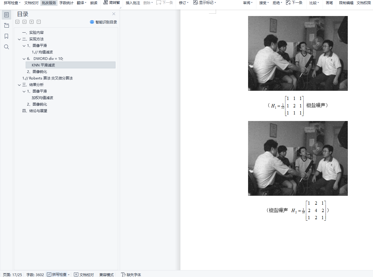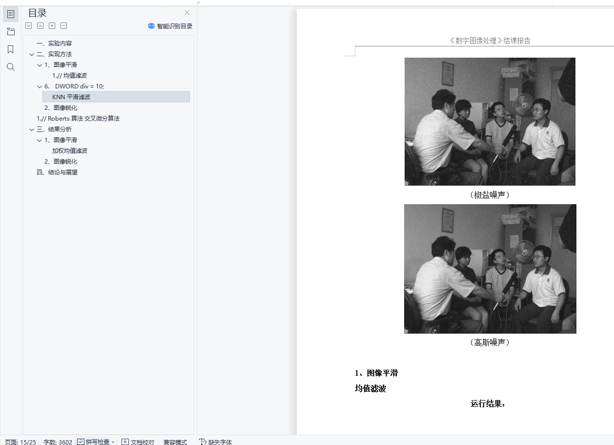1) 图像平滑: 均值滤波、加权均值滤波、中值滤波、KNN平滑滤波(主要分析模板系数、大小、形状、滤波次数以及k值(KNN)对最终结果的影响)