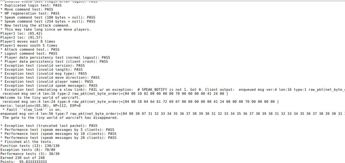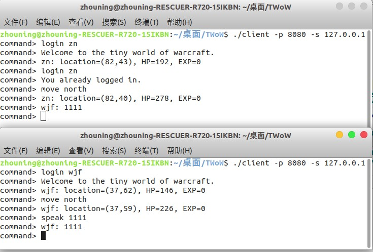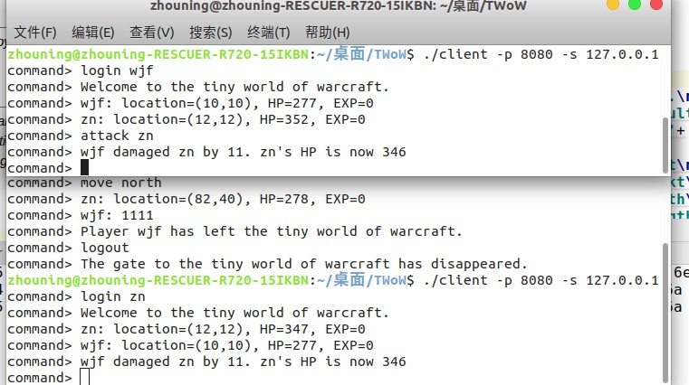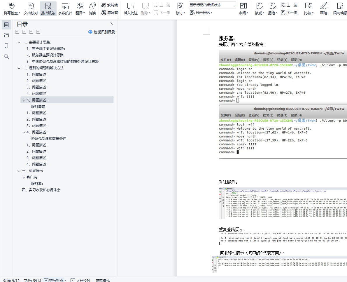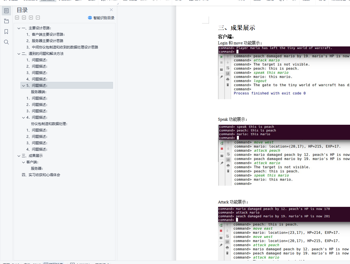 目录一、主要设计思路: 21、客户端主要设计思路: 22、服务器主要设计思路 33、中间协议包制造和收到的数据处理设计思路 4二、遇到的问题和解决方法 41、问题描述: 42、问题描述: 53、问题描述: 54、问题描述: 55、问题描述: 5服务器端: 51.问题描述: 52.问题描述: 53.问题描述: 64.问题描述: 6协议包制造和数据处理: 61、问题描述: 62、问题描述: 63、问题描述: 64、问题描述: 6三、成果展示 7客户端: 7服务器: 9四、实习收获和心得体会 11一、主要设计思路:我们选择 Tcp 协议进行传输,之所以采用 tcp,首先是因为 tcp 传输稳定, 相比于 udp 不稳定的传输,tcp 能确保消息一定传输出去。然后是 tcp 有服务器,相比于 p2p 无服务器模型,tcp 可以记录数据,方便用于商用而且也比较安全。1、客户端主要设计思路:基于 TCP 协议,实现发送消息给服务器和从服务器接收消息。要实现“迷你魔兽世界” 客户端的基本框架主要分为以下几个部分:(1)、指令,根据输入的指令,比如 login,move,attack 等,客户端要判断指令的有效指令设计,输入指令 login playername,客户端向服务器发送登录请求,输入指令 movedirection,客户端向服务器发送移动请求,输入指令 attcak playername,客户端发送攻击另一位玩家的请求,输入指令 speak message,表示该玩家要发言,内容为 message,同样要向服务器发送请求,输入指令 logout,表示退出登陆。无效指令,如果输入的不是约定好的指令以及指令结构不正确,则客户端不向服务器发送请求。第一,登陆时玩家名不能有空格;第二,move 指令后面的方向必须在 north,south,west 和 east 这几个方向中,如果为其他内容,则输出无效的方向的提示;第三,输入 attack 指令后要判断被攻击玩家是否在该玩家视野范围内,如果不在视野范围内,则输出错误信息“The target is not visible”,玩家视野范围为(x-5,x+5),(y-5,y+5),x 和 y 为玩家坐标;第四,speak 生成的数据中可以有空格;第五,logout 指令,没有参数。(2)、发送请求,根据输入的有效指令得到消息类型和消息内容,按照协议打包成字节发送给服务器。(3)、处理应答,客户端接收到来自服务器的包,根据协议,先解析出消息类型,再根据不同消息类型的包的结构解析出包中的数据,再根据这些数据输出消息。(4)、线程问题,客户端必须和服务器端进行异步通信。例如,当其他玩家生成一个speak 命令,客户端将会收到 SPEAK_NOTIFY 信息从服务器端,尽管客户端没有请求这个消息。这意味着客户端不能阻塞用户的输入。所以将输入指令发送请求和接收广播/应答的函数设为两个线程,其中一个通过一个死循环,输入指令并处理,另一个也是通过死循环不停接收广播/应答并处理。(5)、异常处理,当遇到一些特殊情况时需要做异常处理。如果服务器端不可用并且连接不能生成,客服端必须退出,且显示错误信息”The gate to the tiny world of warcraft is not ready.”。要实现这一点,需要通过 try/except连接地址和端口号的时候检测异常。如果客户端从服务器端收到一个异常消息,客户端必须退出,然后输出错误消息”Meteor is striking the world.”。即如果客户端收到的包的长度不符合规范,或者解析到的消息类型不存在或与包的长度不匹配,说明客户端收到了一个异常消息。如果客户端和服务器端的连接被异常中断,客服端必须退出,然后显示一个错误消息” The gate to the tiny world of warcraft has disappeared.”。由于 python 中的套接字断开连接时不会出现异常,而是会不断接收到空字符,所以在接收消息的地方做一个判断, 如果接收到的消息长度为 0,说明连接断开,则执行该异常处理。