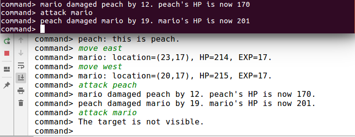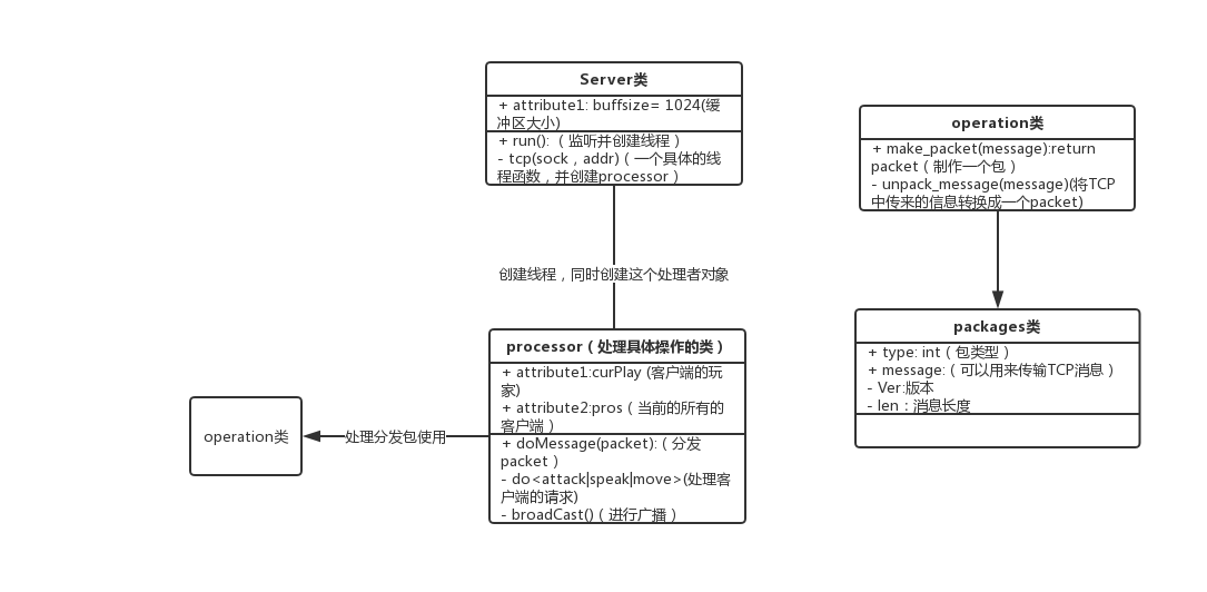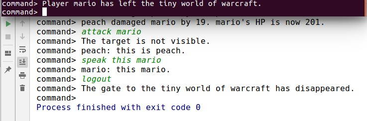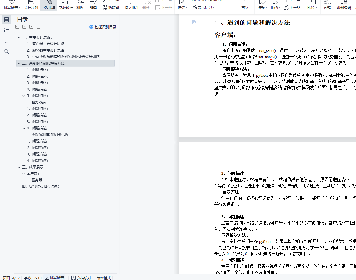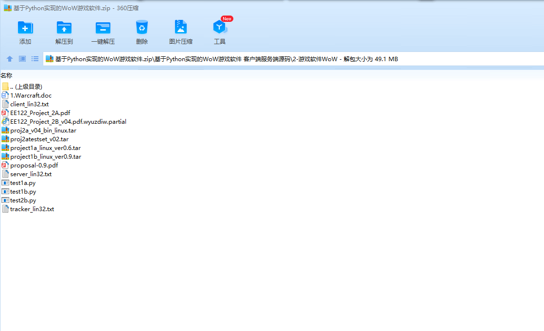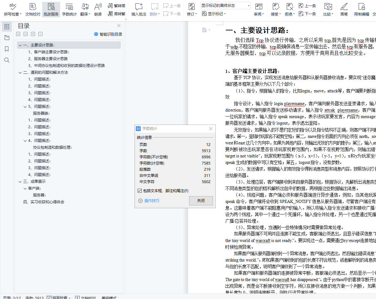 目录一、主要设计思路: 21、客户端主要设计思路: 22、服务器主要设计思路 33、中间协议包制造和收到的数据处理设计思路 4二、遇到的问题和解决方法 41、问题描述: 42、问题描述: 53、问题描述: 54、问题描述: 55、问题描述: 5服务器端: 51.问题描述: 52.问题描述: 53.问题描述: 64.问题描述: 6协议包制造和数据处理: 61、问题描述: 62、问题描述: 63、问题描述: 64、问题描述: 6三、成果展示 7客户端: 7服务器: 9四、实习收获和心得体会 11一、主要设计思路:我们选择 Tcp 协议进行传输,之所以采用 tcp,首先是因为 tcp 传输稳定, 相比于 udp 不稳定的传输,tcp 能确保消息一定传输出去。然后是 tcp 有服务器,相比于 p2p 无服务器模型,tcp 可以记录数据,方便用于商用而且也比较安全。1、客户端主要设计思路:基于 TCP 协议,实现发送消息给服务器和从服务器接收消息。要实现“迷你魔兽世界” 客户端的基本框架主要分为以下几个部分:(1)、指令,根据输入的指令,比如 login,move,attack 等,客户端要判断指令的有效指令设计,输入指令 login playername,客户端向服务器发送登录请求,输入指令 movedirection,客户端向服务器发送移动请求,输入指令 attcak playername,客户端发送攻击另一位玩家的请求,输入指令 speak message,表示该玩家要发言,内容为 message,同样要向服务器发送请求,输入指令 logout,表示退出登陆。无效指令,如果输入的不是约定好的指令以及指令结构不正确,则客户端不向服务器发送请求。第一,登陆时玩家名不能有空格;第二,move 指令后面的方向必须在 north,south,west 和 east 这几个方向中,如果为其他内容,则输出无效的方向的提示;第三,输入 attack 指令后要判断被攻击玩家是否在该玩家视野范围内,如果不在视野范围内,则输出错误信息“The target is not visible”,玩家视野范围为(x-5,x+5),(y-5,y+5),x 和 y 为玩家坐标;第四,speak 生成的数据中可以有空格;第五,logout 指令,没有参数。(2)、发送请求,根据输入的有效指令得到消息类型和消息内容,按照协议打包成字节发送给服务器。(3)、处理应答,客户端接收到来自服务器的包,根据协议,先解析出消息类型,再根据不同消息类型的包的结构解析出包中的数据,再根据这些数据输出消息。(4)、线程问题,客户端必须和服务器端进行异步通信。例如,当其他玩家生成一个speak 命令,客户端将会收到 SPEAK_NOTIFY 信息从服务器端,尽管客户端没有请求这个消息。这意味着客户端不能阻塞用户的输入。所以将输入指令发送请求和接收广播/应答的函数设为两个线程,其中一个通过一个死循环,输入指令并处理,另一个也是通过死循环不停接收广播/应答并处理。(5)、异常处理,当遇到一些特殊情况时需要做异常处理。如果服务器端不可用并且连接不能生成,客服端必须退出,且显示错误信息”The gate to the tiny world of warcraft is not ready.”。要实现这一点,需要通过 try/except连接地址和端口号的时候检测异常。如果客户端从服务器端收到一个异常消息,客户端必须退出,然后输出错误消息”Meteor is striking the world.”。即如果客户端收到的包的长度不符合规范,或者解析到的消息类型不存在或与包的长度不匹配,说明客户端收到了一个异常消息。如果客户端和服务器端的连接被异常中断,客服端必须退出,然后显示一个错误消息” The gate to the tiny world of warcraft has disappeared.”。由于 python 中的套接字断开连接时不会出现异常,而是会不断接收到空字符,所以在接收消息的地方做一个判断, 如果接收到的消息长度为 0,说明连接断开,则执行该异常处理。