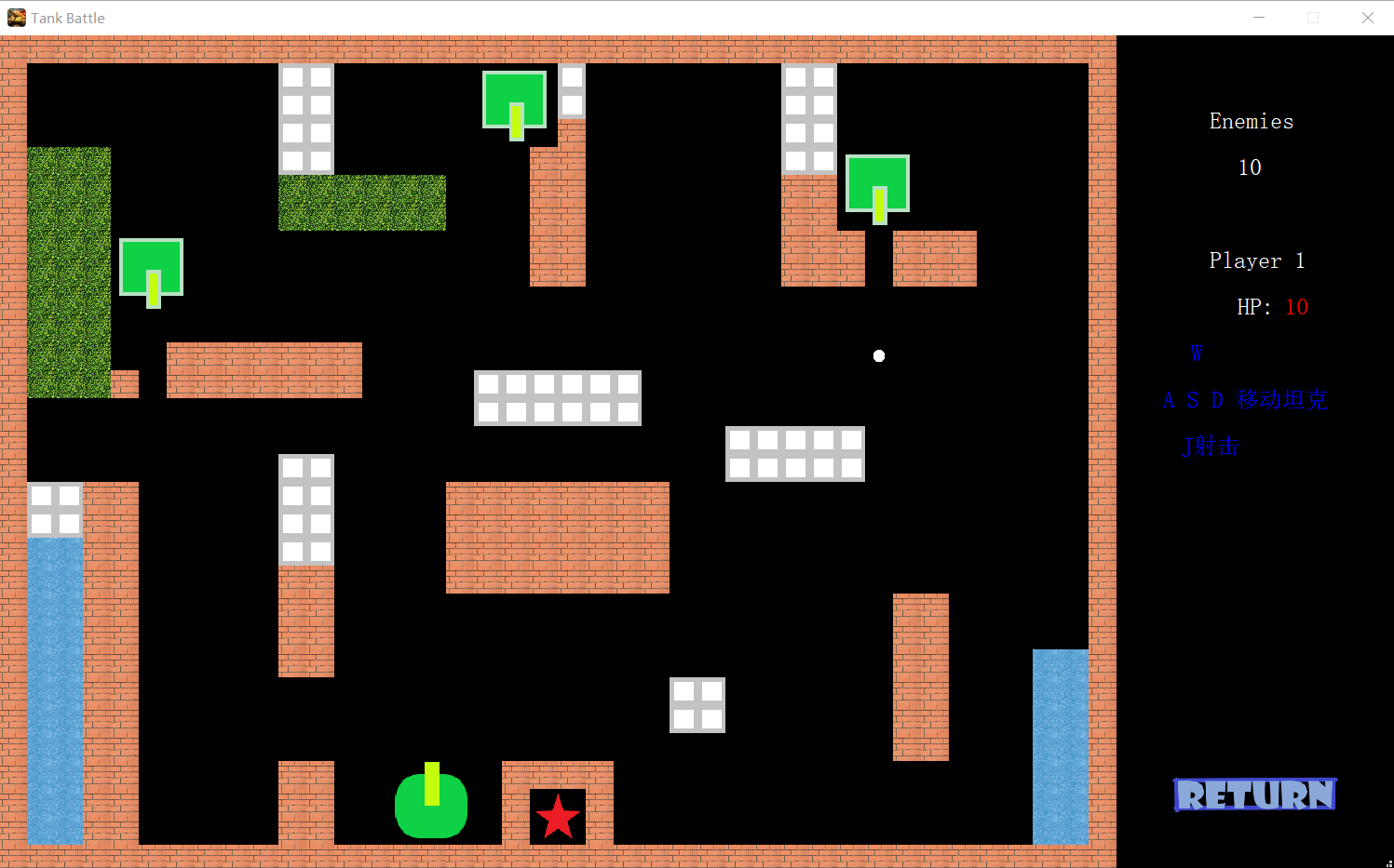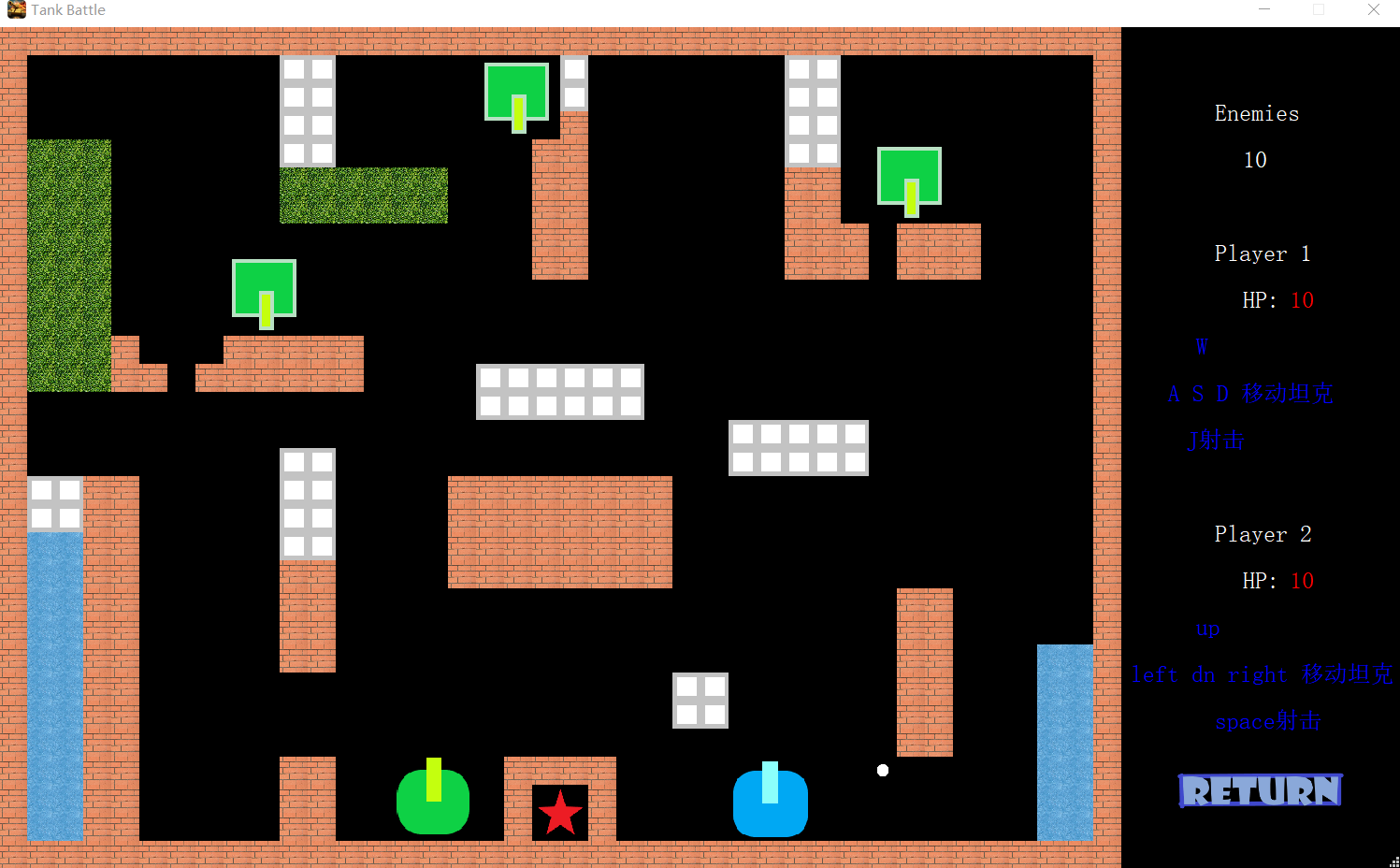 森林:坦克和子弹均可穿越,但显示上会被森林覆盖基地:“★”表示基地中心,被打中则游戏结束