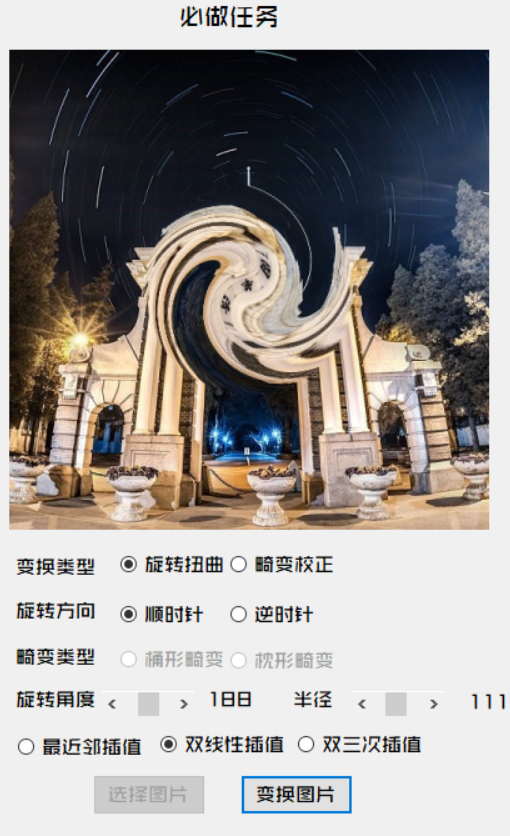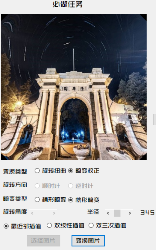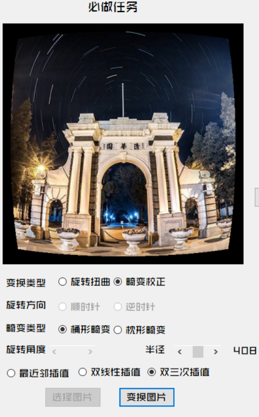 必做任务要求对给定图像(清华二校门)分别以最近邻、双线性和双三次插值方法实现旋转扭曲和畸变校正两种变换。其中旋转扭曲要求可以调整旋转角度和半径两个参数;畸变校正要求实现桶形和枕形两种畸变,同时可以调整半径。