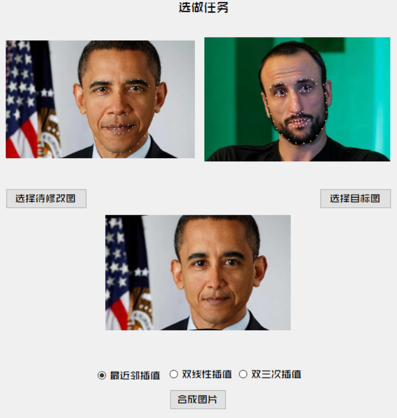 选做任务需两张人脸图片,下面分别称为“待修改人脸”和“目标人脸”。分别给出两张脸上的68个关键点,要求利用TPS网格变形把待修改人脸的关键点特征变成目标人脸的特征。注意此处TPS变形后得到的只是一个坐标映射关系,仍需要通过插值得到最终的“修改后人脸”,这里可以利用必做部分的函数。