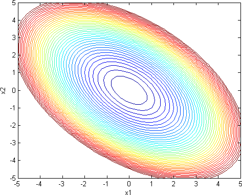 可以看出如果在x=1的约束下,也就是一个原点为中心的圆形,这个圆形与等高线交点中y的最小值恰好 是较小特征向量的位置[-0.7071;0.7071],也是等高线变化最稀疏的位置。如果将维度推广到三维时,