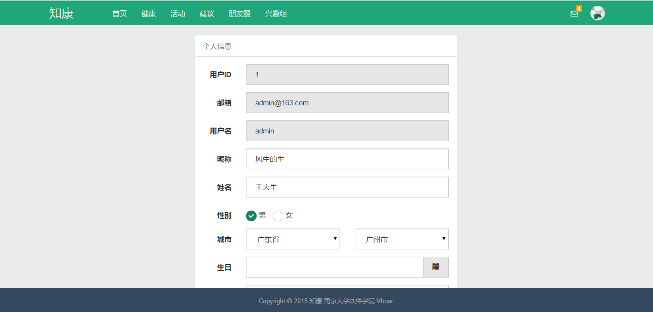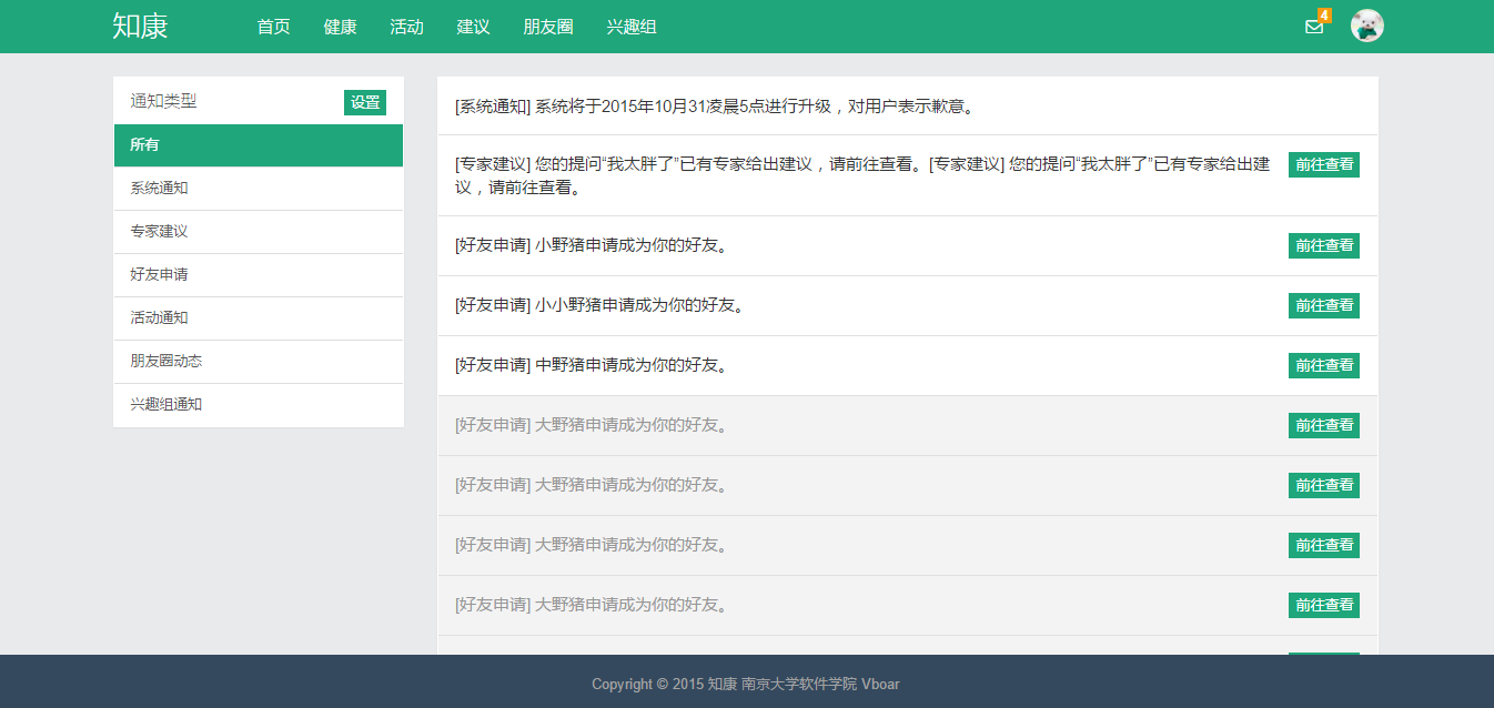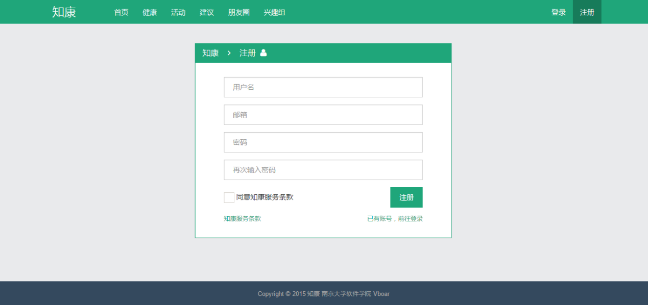 “知康”是一款关注个人健康的WEB应用,分为浏览器端(前端)和服务器端(后端)两个部分。前端使用Html、CSS、JavaScript语言编写,采用Bootstrap前端框架,并且使用Ajax技术。后端使用PHP语言编写,采用Laravel 5.1框架,其中数据库方面使用SQLite 3。