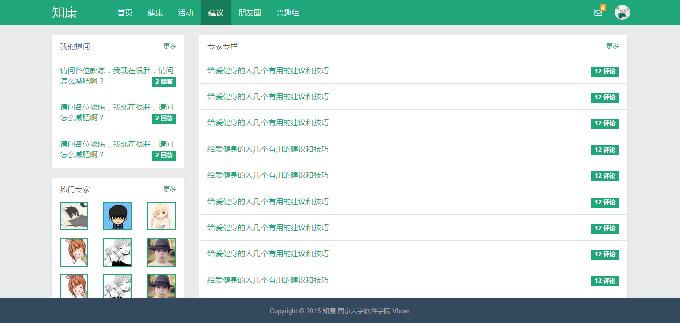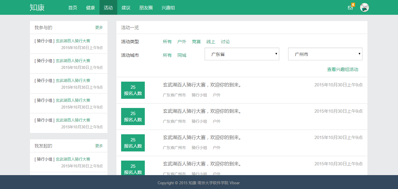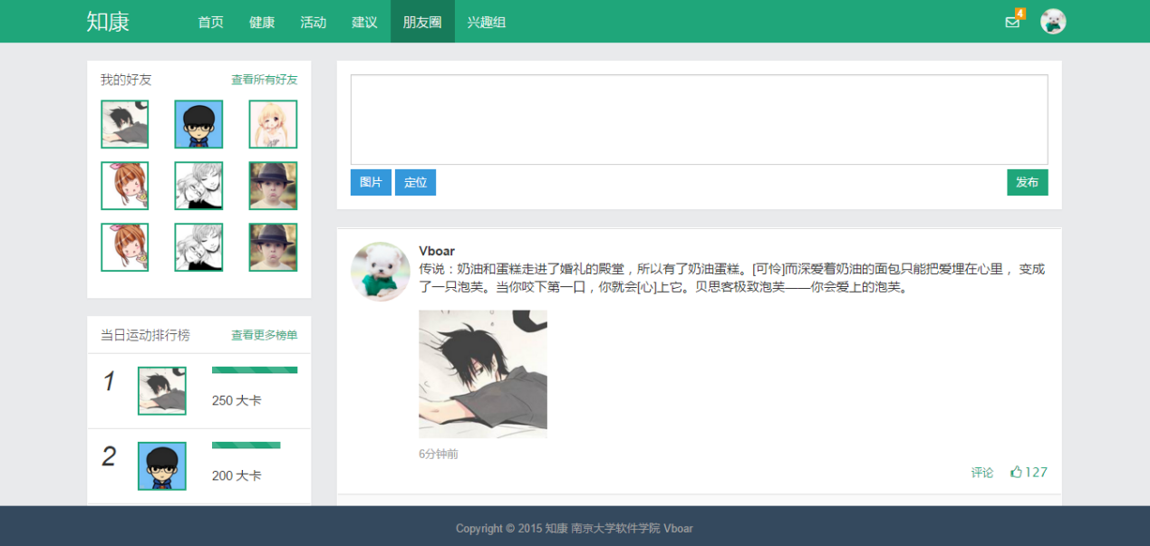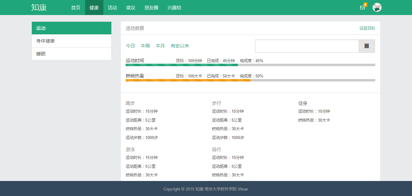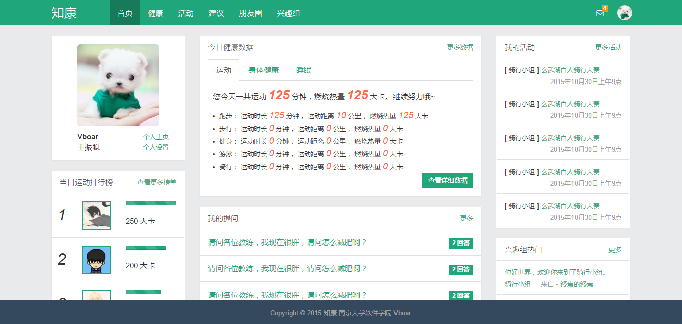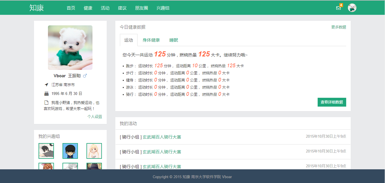 “知康”是一款关注个人健康的Web2.0应用,它结合了当下流行的互联网社交元素,加上原本的常规运动健康项目,以此来关注个人健康。“知康”主要包括以下几个模块:运动健身和个人健康数据采集和数据统计分析;活动、朋友圈、兴趣组等社交行为;教练和医生提供健康建议;等等。