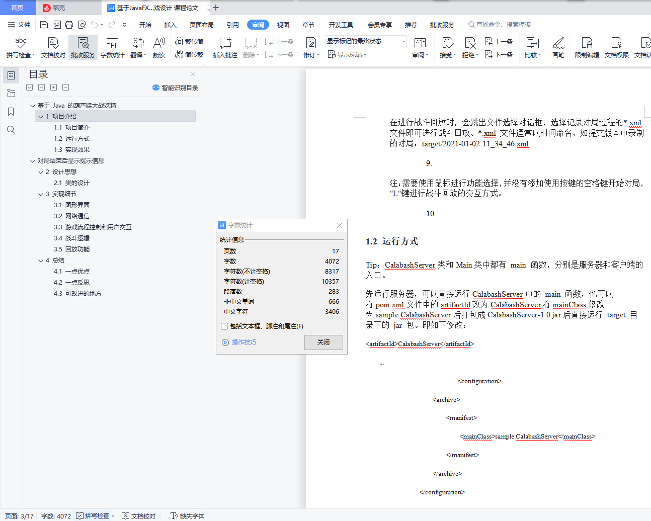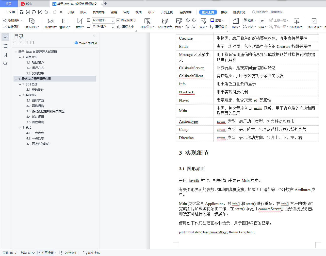 基于 Java 的葫芦娃大战妖精目录基于 Java 的葫芦娃大战妖精 11 项目介绍 11.1 项目简介 11.2 运行方式 21.3 实现效果 3对局结束后显示提示信息 62 设计思想 62.1 类的设计 63 实现细节 73.1 图形界面 73.2 网络通信 83.3 游戏流程控制和用户交互 113.4 战斗逻辑 123.5 回放功能 144 总结 164.1 一点优点 164.2 一点反思 164.3 可改进的地方 161 项目介绍1.1 项目简介本项目使用 Java 语言编程,运用图形框架 JavaFX,结合网络编程(C/S 架构),实现可供多名玩家在线匹配的 1v1 联机游戏《葫芦娃大战妖精》。游戏规则:1.玩家首先要输入运行服务器的主机 IP 地址与服务器连接,在成功连接服务器后可以通过鼠标点击选择:1)匹配玩家:选择当前已连接服务器的某一玩家 id(最小为 0)并发送对战邀请,如果对方同意则可以直接进入游戏;相应的,在接受其他玩家发出的对战邀请后也可以直接进入游戏。2)战斗回放:选择某一用于记录战局的*.xml 文件(文件名为对局时间)可以读取文件内容,并按文件中记录的内容进行战斗回放。3)退出游戏在成功匹配玩家后,游戏在 5*9 的二维空间战场上进行,分为葫芦娃阵营和妖精阵营。游戏开始时葫芦娃阵营(包含七兄弟、老爷爷和穿山甲)与妖精阵营(包括蛇精、蝎子精和小喽啰等)以特定阵型在左右两侧分列站队。玩家可以用键盘的“1”-“9”键选中对应编号的游戏角色;使用"W", "S", ”A", "D"键控制角色进行上,下,左,右方向的移动;使用“J”键进行攻击(仅能攻击人物朝向的相邻位置的角色),使敌方角色掉血;人物上方的红色血条显示人物剩余血量,血量为 0 时角色死亡,当某一方生物全部死亡时,游戏结束,对局过程将保存到文件中,同时有弹窗提示对局结果。在进行战斗回放时,会跳出文件选择对话框,选择记录对局过程的*.xml 文件即可进行战斗回放。*.xml 文件通常以时间命名,如提交版本中录制的对局:target/2021-01-02 11_34_46.xml注:需要使用鼠标进行功能选择,并没有添加使用按键的空格键开始对局,"L"键进行战斗回放的交互方式。