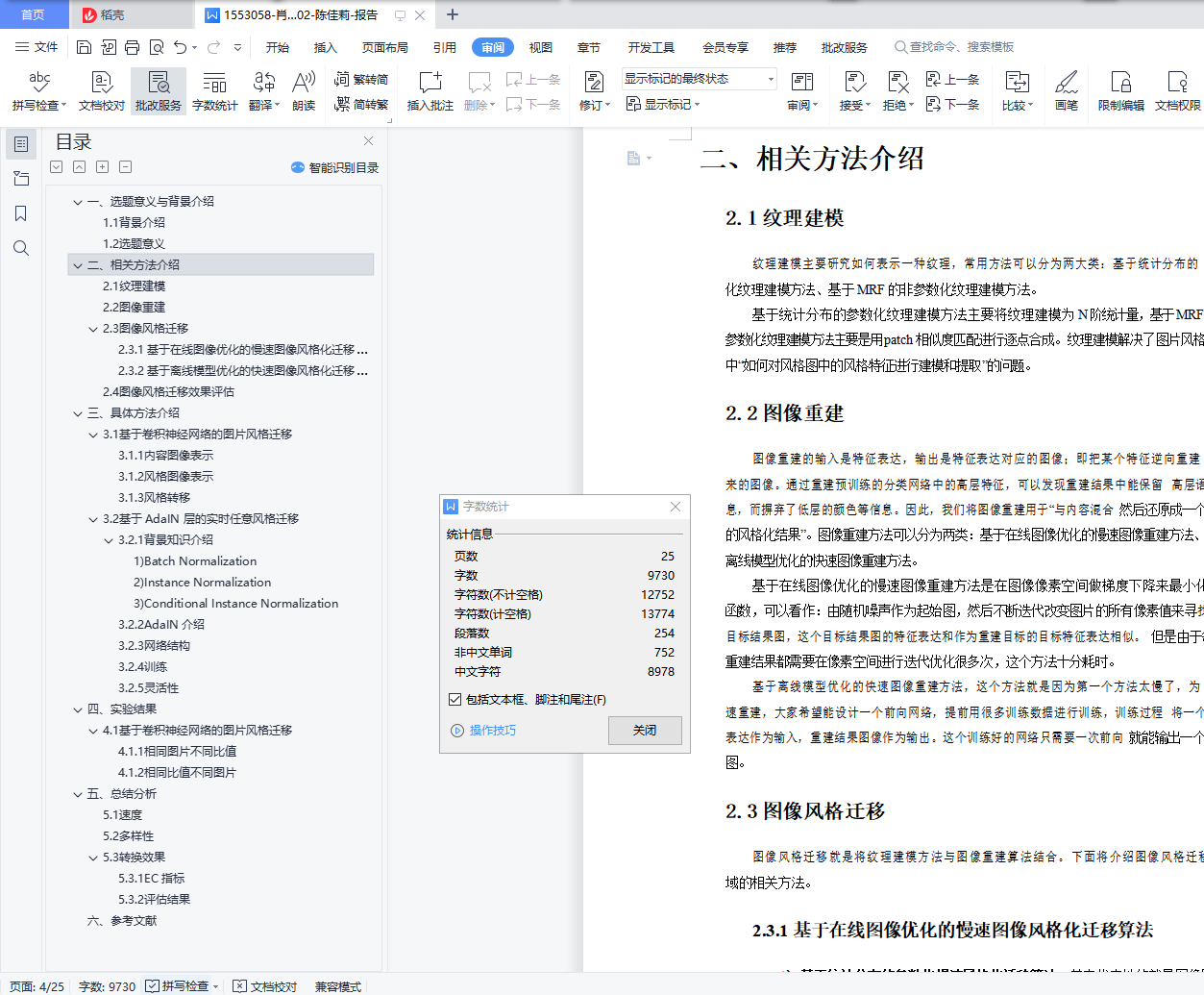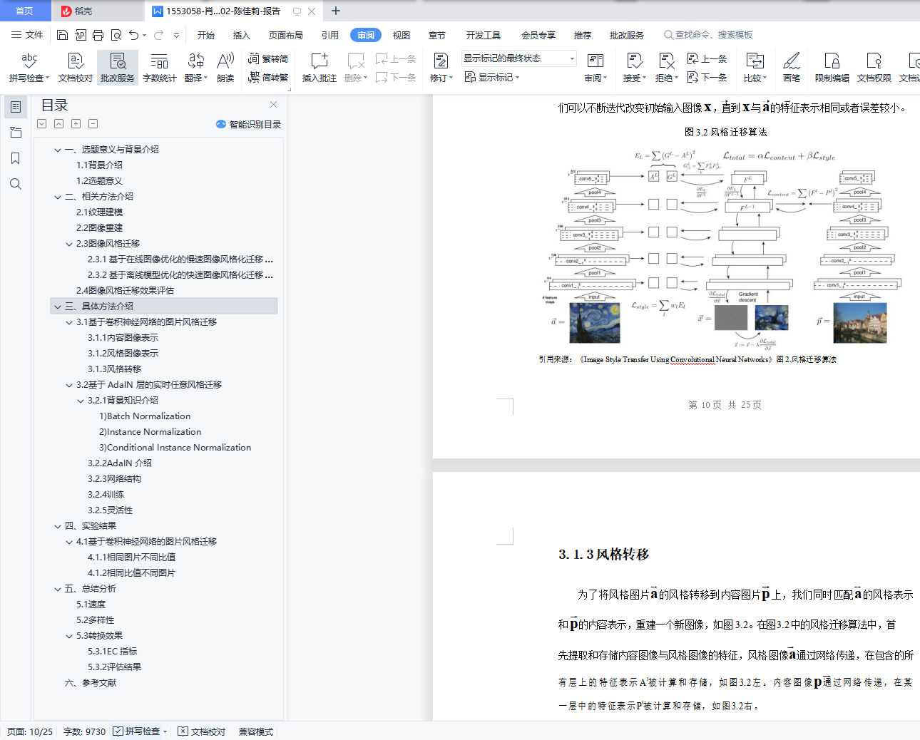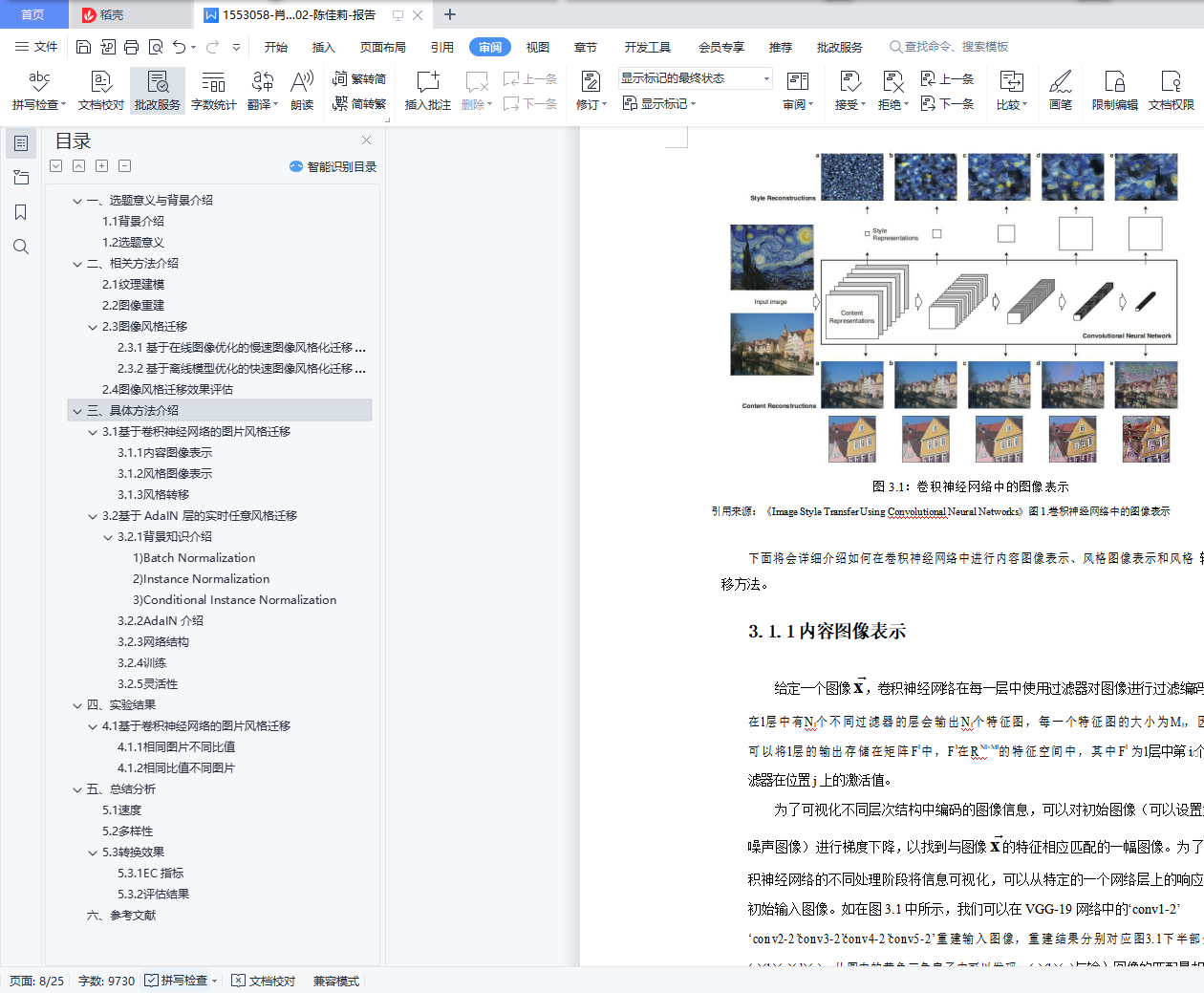 目录一、选题意义与背景介绍 31.1背景介绍 31.2选题意义 3二、相关方法介绍 42.1纹理建模 42.2图像重建 42.3图像风格迁移 42.3.1基于在线图像优化的慢速图像风格化迁移算法 42.3.2基于离线模型优化的快速图像风格化迁移算法 52.4图像风格迁移效果评估 6三、具体方法介绍 73.1基于卷积神经网络的图片风格迁移 73.1.1内容图像表示 83.1.2风格图像表示 93.1.3风格转移 113.2基于 AdaIN 层的实时任意风格迁移 113.2.1背景知识介绍 123.2.2AdaIN 介绍 133.2.3网络结构 133.2.4 训练 143.2.5 灵活性 15四、实验结果 164.1基于卷积神经网络的图片风格迁移 164.1.1相同图片不同比值 164.1.2相同比值不同图片 174.2基于 AdaIN 层的实时任意风格迁移 184.2.1相同图片不同比值 184.2.2相同比值不同图片 19五、总结分析 205.1 速度 205.2多样性 205.3转换效果 215.3.1EC 指标 215.3.2评估结果 23六、参考文献 25一、选题意义与背景介绍1.1背景介绍图像风格迁移是一种用不同风格渲染图像语义内容的图像处理方法。图像风格迁移 算法的输入有二,分别是内容图与风格图;输出为一个,为风格迁移后的结果图。在非真实感图形学领域,图像风格迁移技术可以大体分为基于笔触渲染的方法、基于图像类比的方法、基于图像滤波的方法。但是这些图形学技术却都没有大规模落地, 它们无法大规模落地的原因如下:基于笔触渲染的方法,在算法设计之前就会确定某一风格,即每一个基于笔触渲染的算法一般只对应于一个风格,不能简单地扩展到其他风格;基于图像类比的方法,需要很多成对的原图和风格结果图作为训练集,但是对所有风格图都找到大量成对的数据集不现实;基于图像滤波的方法,这个方法的速度快且效果稳定,是可以落地实现的,但是这个方法能模拟的风格种类有限。在视觉领域,图像风格迁移一般被认为是纹理合成的一个扩展问题。(纹理合成是给定一个纹理图,去合成更多的类似的纹理结构,最终组成一个大的纹理图)风格迁移中的风格图实际上就可以看作是一种纹理,所以当时的图像风格迁移叫纹理迁移。但是由于纹理迁移是基于低层次的图像特征实现的,没有考虑语义信息,因此结果不尽人意。在非真实感图形学领域和视觉领域提及的方法都距大规模落地有一段距离,但是还 好很多前人依旧继续扎实的基础研究,最终总结得出纹理建模的方法与图像重建的方法。 图像风格迁移也就是源于纹理建模与图像重建,在神经网络深度学习的基础上发展起来, 纹理建模与图像重建的方法将会在相关方法中介绍。1.2选题意义基于深度学习的图像风格迁移的发展,使得图像风格迁移的效果得到很大的提升, 具有广阔的应用前景。目前,基于深度学习的图像风格迁移可以用于以下几个方向:1)图像处理:图像风格迁移可以用于图像美化,传统的图像处理技术只能对图像进行模式较固定的处理,而基于深度学习的图像风格迁移可以给图像风格设计带来更多的可能性。比如:可以用于图像修复、用于给漫画草图上色等。最常见的应用是 Prisma, 这是免费提供基于深度学习的图像风格迁移服务的 App。2)风格设计的辅助工具:图像风格迁移也可以在艺术绘画创作、建筑艺术设计、服 装艺术设计等场景中充当有效的辅助工具。3)视频处理:可以将图像风格迁移技术用于影视特效技术的创作,用于对电影进行 风格化等。