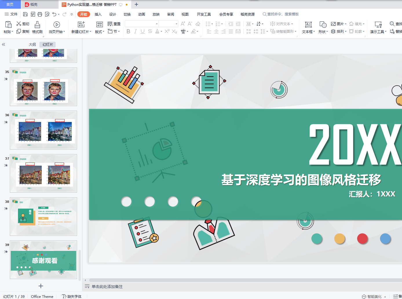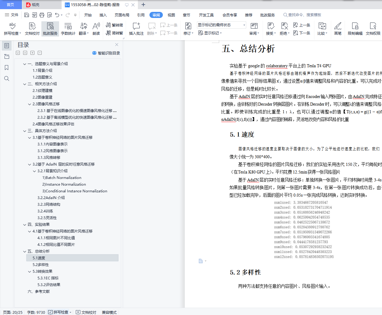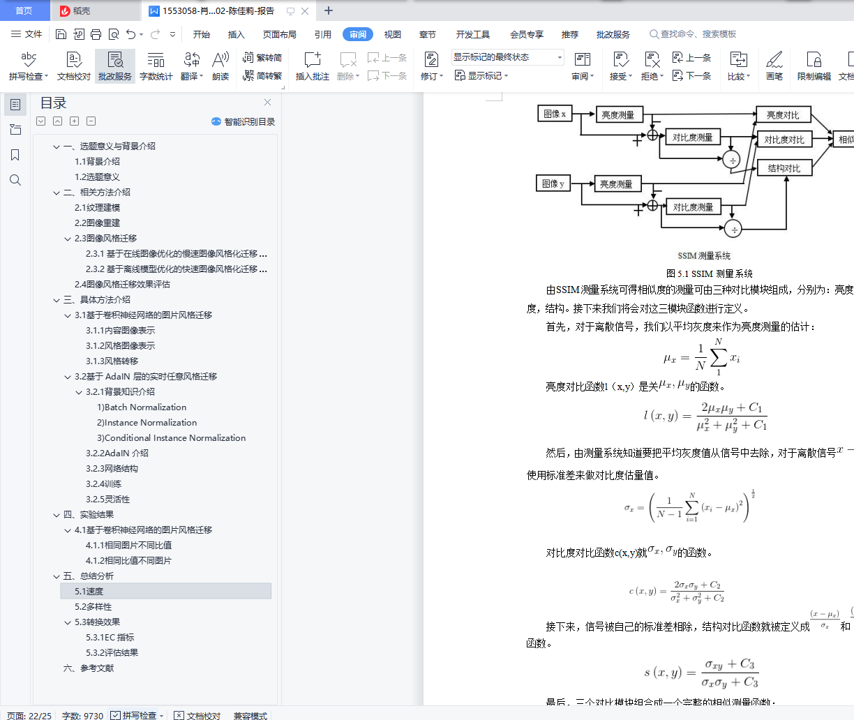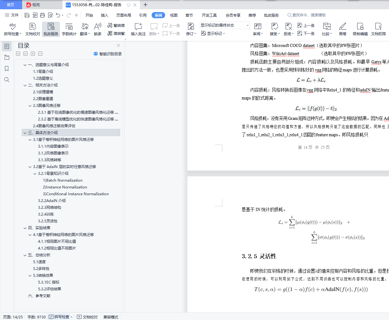 目录一、选题意义与背景介绍 31.1背景介绍 31.2选题意义 3二、相关方法介绍 42.1纹理建模 42.2图像重建 42.3图像风格迁移 42.3.1基于在线图像优化的慢速图像风格化迁移算法 42.3.2基于离线模型优化的快速图像风格化迁移算法 52.4图像风格迁移效果评估 6三、具体方法介绍 73.1基于卷积神经网络的图片风格迁移 73.1.1内容图像表示 83.1.2风格图像表示 93.1.3风格转移 113.2基于 AdaIN 层的实时任意风格迁移 113.2.1背景知识介绍 123.2.2AdaIN 介绍 133.2.3网络结构 133.2.4 训练 143.2.5 灵活性 15四、实验结果 164.1基于卷积神经网络的图片风格迁移 164.1.1相同图片不同比值 164.1.2相同比值不同图片 174.2基于 AdaIN 层的实时任意风格迁移 184.2.1相同图片不同比值 184.2.2相同比值不同图片 19五、总结分析 205.1 速度 205.2多样性 205.3转换效果 215.3.1EC 指标 215.3.2评估结果 23六、参考文献 25一、选题意义与背景介绍1.1背景介绍图像风格迁移是一种用不同风格渲染图像语义内容的图像处理方法。图像风格迁移 算法的输入有二,分别是内容图与风格图;输出为一个,为风格迁移后的结果图。在非真实感图形学领域,图像风格迁移技术可以大体分为基于笔触渲染的方法、基于图像类比的方法、基于图像滤波的方法。但是这些图形学技术却都没有大规模落地, 它们无法大规模落地的原因如下:基于笔触渲染的方法,在算法设计之前就会确定某一风格,即每一个基于笔触渲染的算法一般只对应于一个风格,不能简单地扩展到其他风格;基于图像类比的方法,需要很多成对的原图和风格结果图作为训练集,但是对所有风格图都找到大量成对的数据集不现实;基于图像滤波的方法,这个方法的速度快且效果稳定,是可以落地实现的,但是这个方法能模拟的风格种类有限。在视觉领域,图像风格迁移一般被认为是纹理合成的一个扩展问题。(纹理合成是给定一个纹理图,去合成更多的类似的纹理结构,最终组成一个大的纹理图)风格迁移中的风格图实际上就可以看作是一种纹理,所以当时的图像风格迁移叫纹理迁移。但是由于纹理迁移是基于低层次的图像特征实现的,没有考虑语义信息,因此结果不尽人意。在非真实感图形学领域和视觉领域提及的方法都距大规模落地有一段距离,但是还 好很多前人依旧继续扎实的基础研究,最终总结得出纹理建模的方法与图像重建的方法。 图像风格迁移也就是源于纹理建模与图像重建,在神经网络深度学习的基础上发展起来, 纹理建模与图像重建的方法将会在相关方法中介绍。1.2选题意义基于深度学习的图像风格迁移的发展,使得图像风格迁移的效果得到很大的提升, 具有广阔的应用前景。目前,基于深度学习的图像风格迁移可以用于以下几个方向:1)图像处理:图像风格迁移可以用于图像美化,传统的图像处理技术只能对图像进行模式较固定的处理,而基于深度学习的图像风格迁移可以给图像风格设计带来更多的可能性。比如:可以用于图像修复、用于给漫画草图上色等。最常见的应用是 Prisma, 这是免费提供基于深度学习的图像风格迁移服务的 App。2)风格设计的辅助工具:图像风格迁移也可以在艺术绘画创作、建筑艺术设计、服 装艺术设计等场景中充当有效的辅助工具。3)视频处理:可以将图像风格迁移技术用于影视特效技术的创作,用于对电影进行 风格化等。