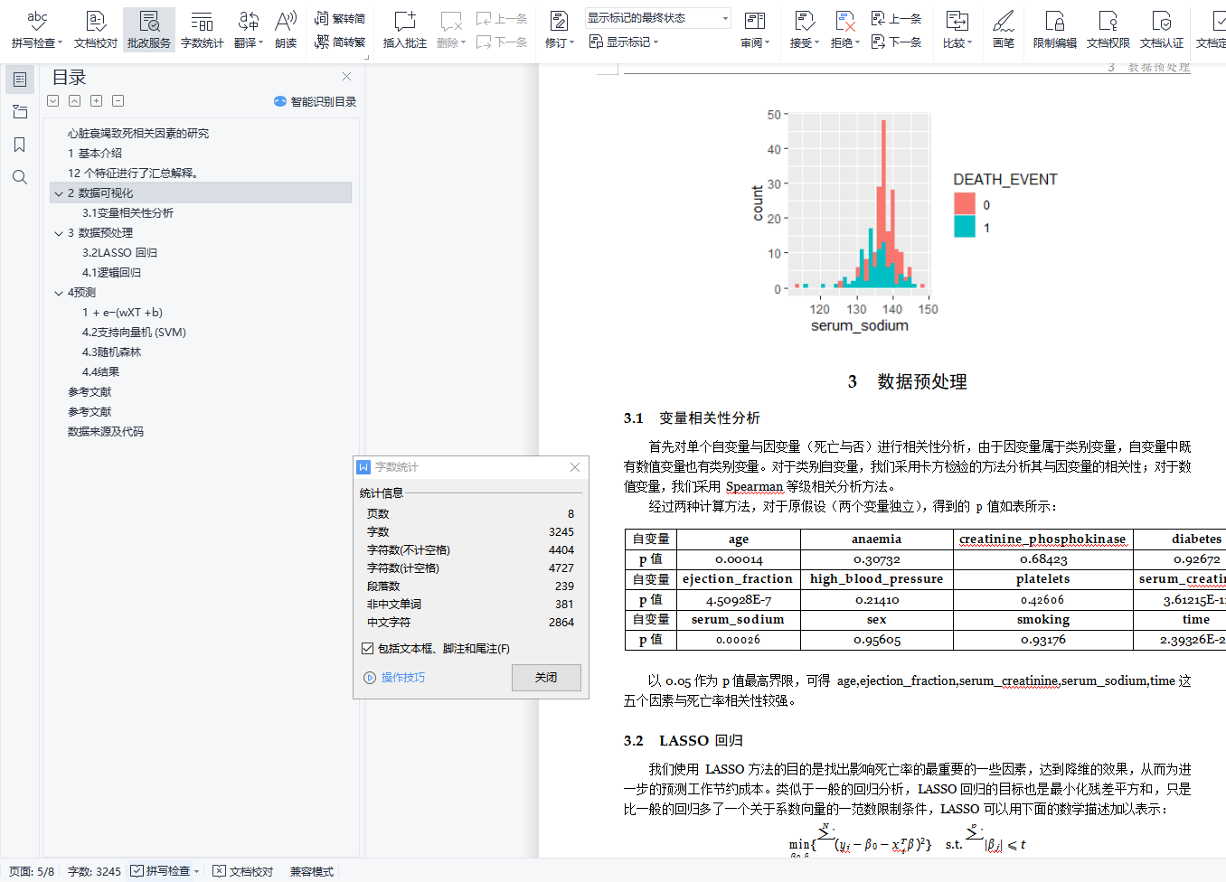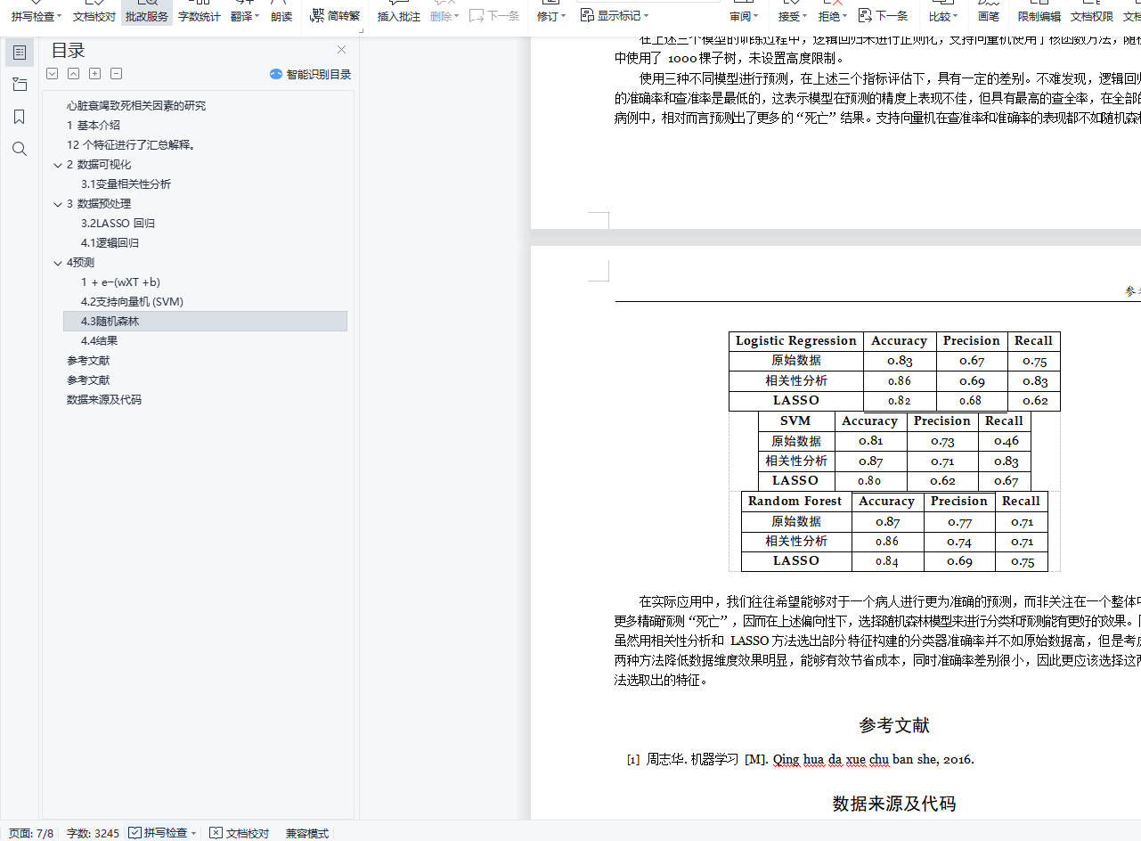 摘要:心脏衰竭对于人类健康构成了重大威胁,研究心脏衰竭致死的相关因素对于疾病的治疗和预防具有重要意义。基于原始数据集,本文关注了 12 个相关因素,从三个角度递进式的进行分析。首先,对数据进行可视化处理,直观的展现相关关系;其次,利用统计学方法分析了各因素与致死之间的相关性关系,并利用 Lasso 方法得到了更为重要的因素。最后,分别使用机器学习中的逻辑回归方法, 支持向量机(SVM)和随机森林三种模型构建分类器,训练得到用于预测的模型。