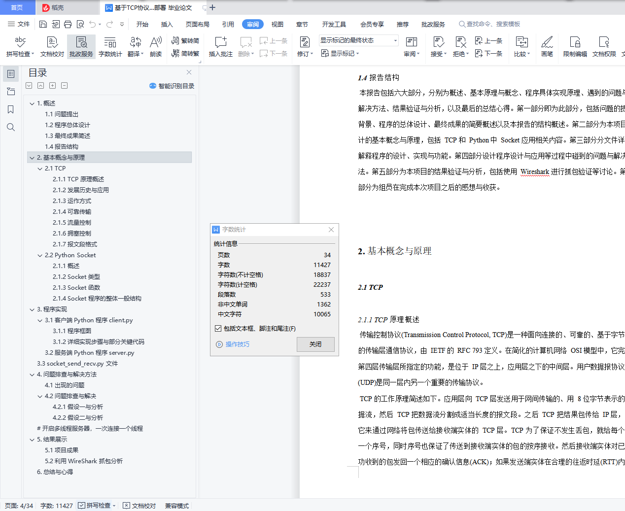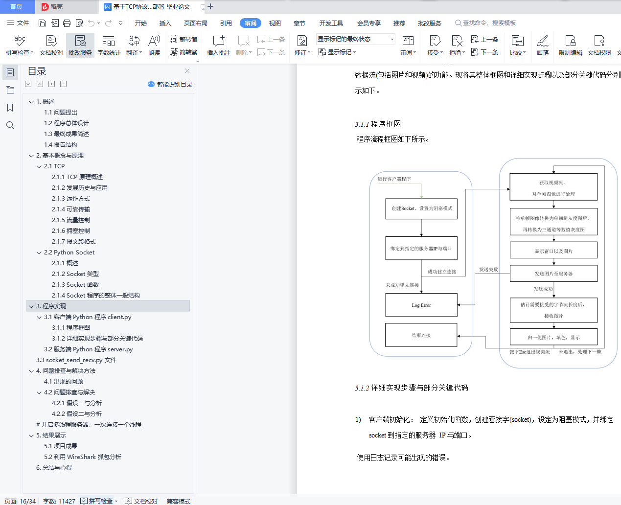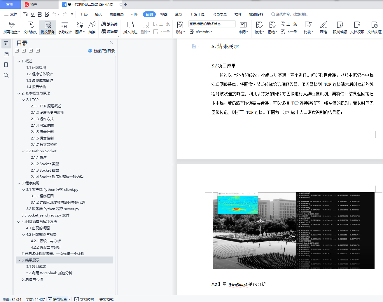 摘要:本次 Project 中,我们利用 TCP 协议、通过基于 Python 的 socket 的模块,实现了人群分布数据的传输与远程卷积神经网络的模型部署和识别应用。具体流程与功能包括:将本地笔记本和树莓派设备上的摄像头获取的视频流进行编码后上传至服务器;服务器端利用训练好的基于 Caffe 的 CNN 模型,计算出每帧图片的人群分布密度图;最后,服务器再用类似的方法将结果回传到本地客户端上并显示。目录基于 TCP 协议与 Python 中 Socket 模块的人群分布数据传输与远程 CNN 识别模型部署 11. 概述 21.1 问题提出 21.2 程序总体设计 31.3 最终成果简述 31.4 报告结构 32. 基本概念与原理 42.1 TCP 42.1.1 TCP 原理概述 42.1.2 发展历史与应用 42.1.3 运作方式 52.1.4 可靠传输 72.1.5 流量控制 102.1.6 拥塞控制 112.1.7 报文段格式 112.2 Python Socket 112.1.1 概述 122.1.2 Socket 类型 122.1.3 Socket 函数 122.1.4 Socket 程序的整体一般结构 143. 程序实现 153.1 客户端Python 程序client.py 153.1.1 程序框图 153.1.2 详细实现步骤与部分关键代码 163.2 服务端Python 程序server.py 183.3 socket_send_recv.py 文件 214. 问题排查与解决方法 234.1 出现的问题 234.2 问题排查与解决 264.2.1 假设一与分析 264.2.2 假设二与分析 26# 开启多线程服务器,一次连接一个线程 295. 结果展示 315.1 项目成果 315.2 利用WireShark 抓包分析 326. 总结与心得 34
