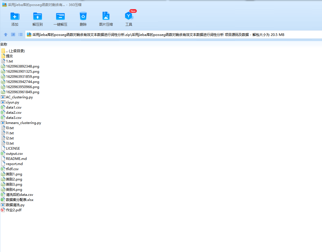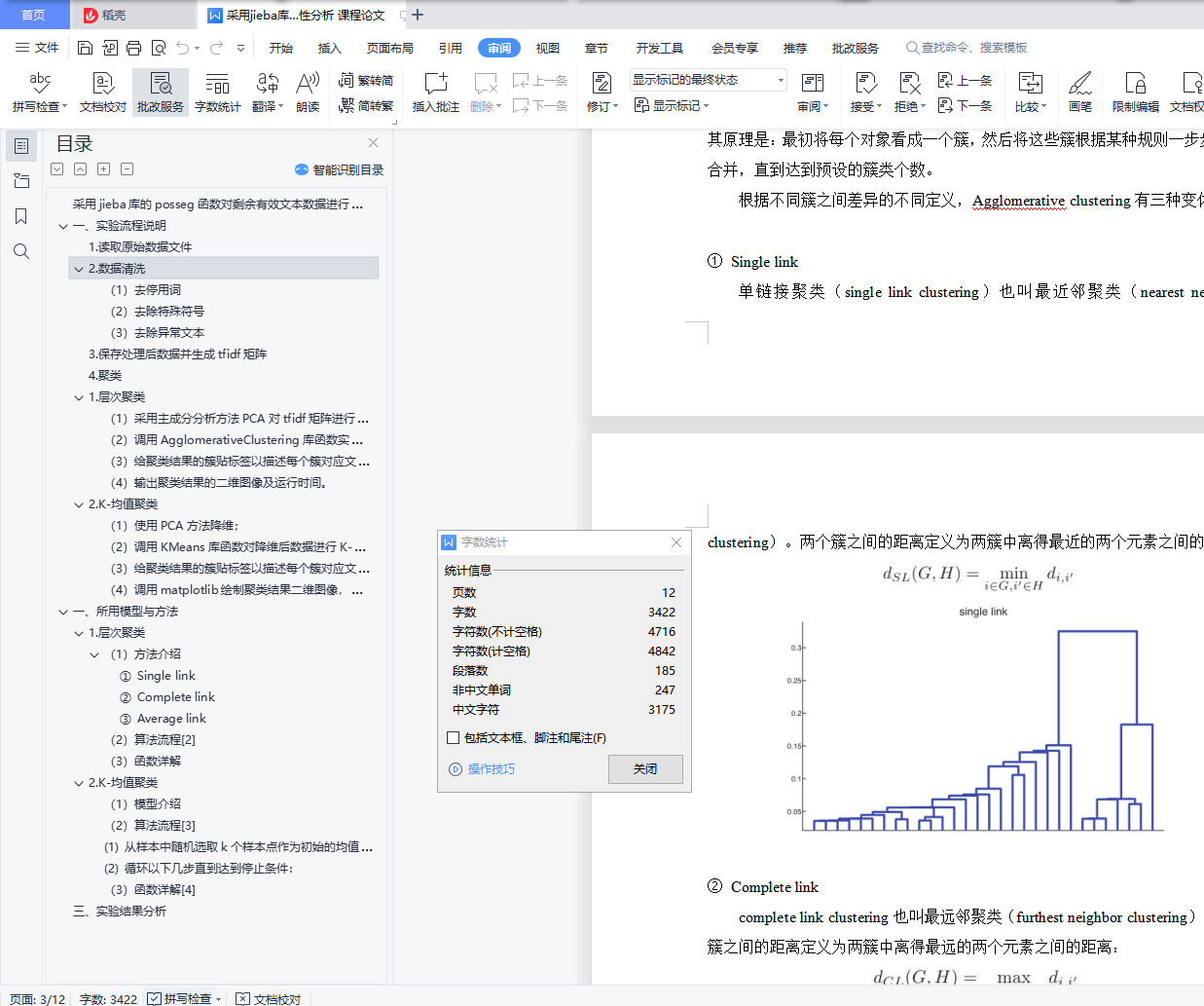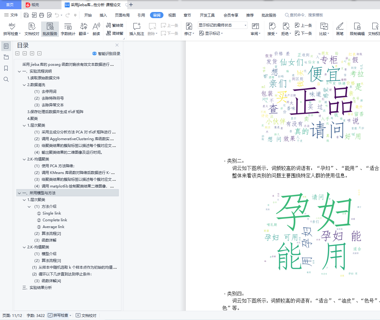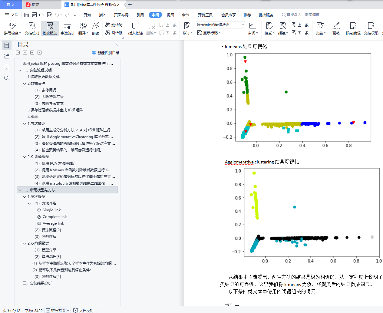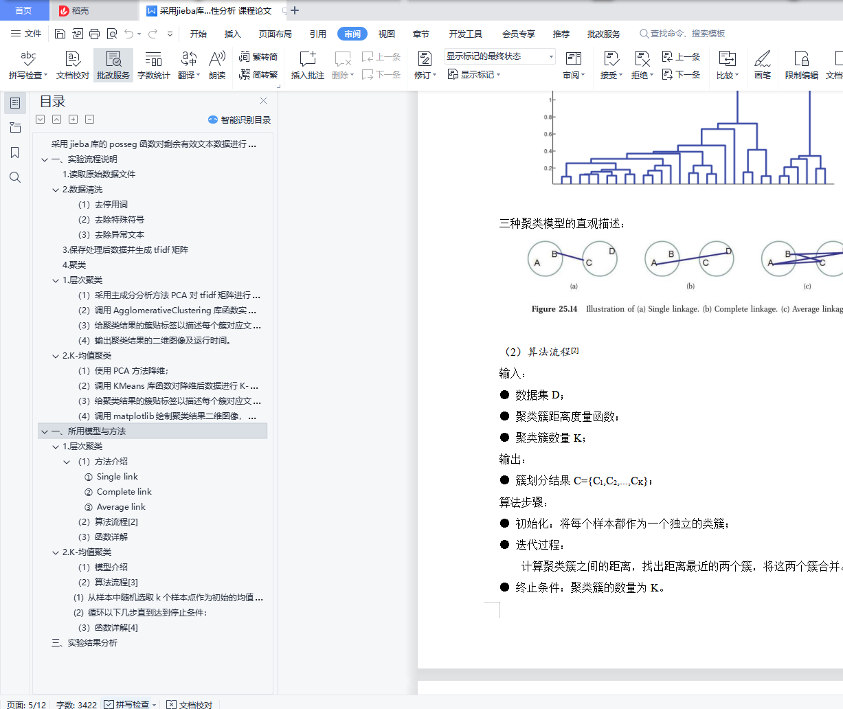 采用jieba库的posseg函数对剩余有效文本数据进行词性分析目录一、实验流程说明 11. 读取原始数据文件 12. 数据清洗 2(1) 去停用词 2(2) 去除特殊符号 2(3) 去除异常文本 23. 保存处理后数据并生成tfidf矩阵 24. 聚类 21. 层次聚类 2(1)采用主成分分析方法PCA对tfidf矩阵进行降维; 2(2)调用AgglomerativeClustering库函数实现对数据的层次聚类; 2(3)给聚类结果的簇贴标签以描述每个簇对应文本的中心话题; 2(4)输出聚类结果的二维图像及运行时间。 22. K-均值聚类 3(1) 使用PCA方法降维; 3(2)调用KMeans库函数对降维后数据进行K-均值聚类; 3(3)给聚类结果的簇贴标签以描述每个簇对应文本的中心话题; 3(4)调用matplotlib绘制聚类结果二维图像,并确定各类中心点。 3一、 所用模型与方法 31. 层次聚类 3(1)方法介绍 3(2)算法流程[2] 5(3)函数详解 52. K-均值聚类 6(1) 模型介绍 6(2) 算法流程[3] 7(1) 从样本中随机选取k个样本点作为初始的均值向量{μ1,μ2,⋯,μk} 7(2) 循环以下几步直到达到停止条件: 7(3) 函数详解[4] 7三、实验结果分析 8一、实验流程说明1.读取原始数据文件采用pandas库可以直接读取.csv数据文件,并查看数据各方面信息。2.数据清洗(1)去停用词根据网上常用的停用词库,使用jieba库中lcut函数分割文本,逐词判断并删除文本中停用词,同时采用jieba库的posseg函数对剩余有效文本数据进行词性分析,进一步筛选文本。(2)去除特殊符号调用pandas库函数去掉问题中’?’、标点符号、特殊符号等。(3)去除异常文本使用pandas库清理文本中空行、重复数据、仅含字母和数字的文本以及问题中小于三个字的行。3.保存处理后数据并生成tfidf矩阵将处理后的文本数据按照初始顺序保存为.txt文件并输出所有统计词语的字典形式;调用sklearn库的TfidfVectorizer函数生成文本数据对应的tfidf矩阵。4.聚类本次实验采用两种不同聚类方式,包括层次聚类与K-均值聚类,均可实现文本聚类目标。1.层次聚类(1)采用主成分分析方法PCA对tfidf矩阵进行降维;(2)调用AgglomerativeClustering库函数实现对数据的层次聚类;(3)给聚类结果的簇贴标签以描述每个簇对应文本的中心话题;(4)输出聚类结果的二维图像及运行时间。2.K-均值聚类(1)使用PCA方法降维;(2)调用KMeans库函数对降维后数据进行K-均值聚类;(3)给聚类结果的簇贴标签以描述每个簇对应文本的中心话题;(4)调用matplotlib绘制聚类结果二维图像,并确定各类中心点。