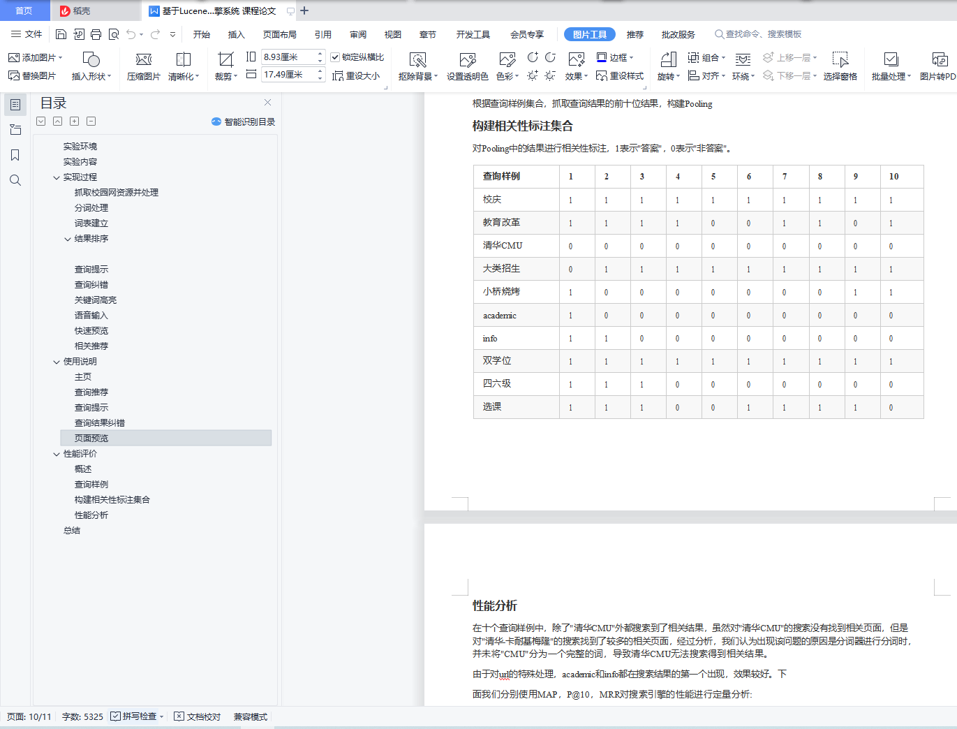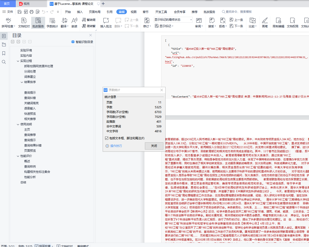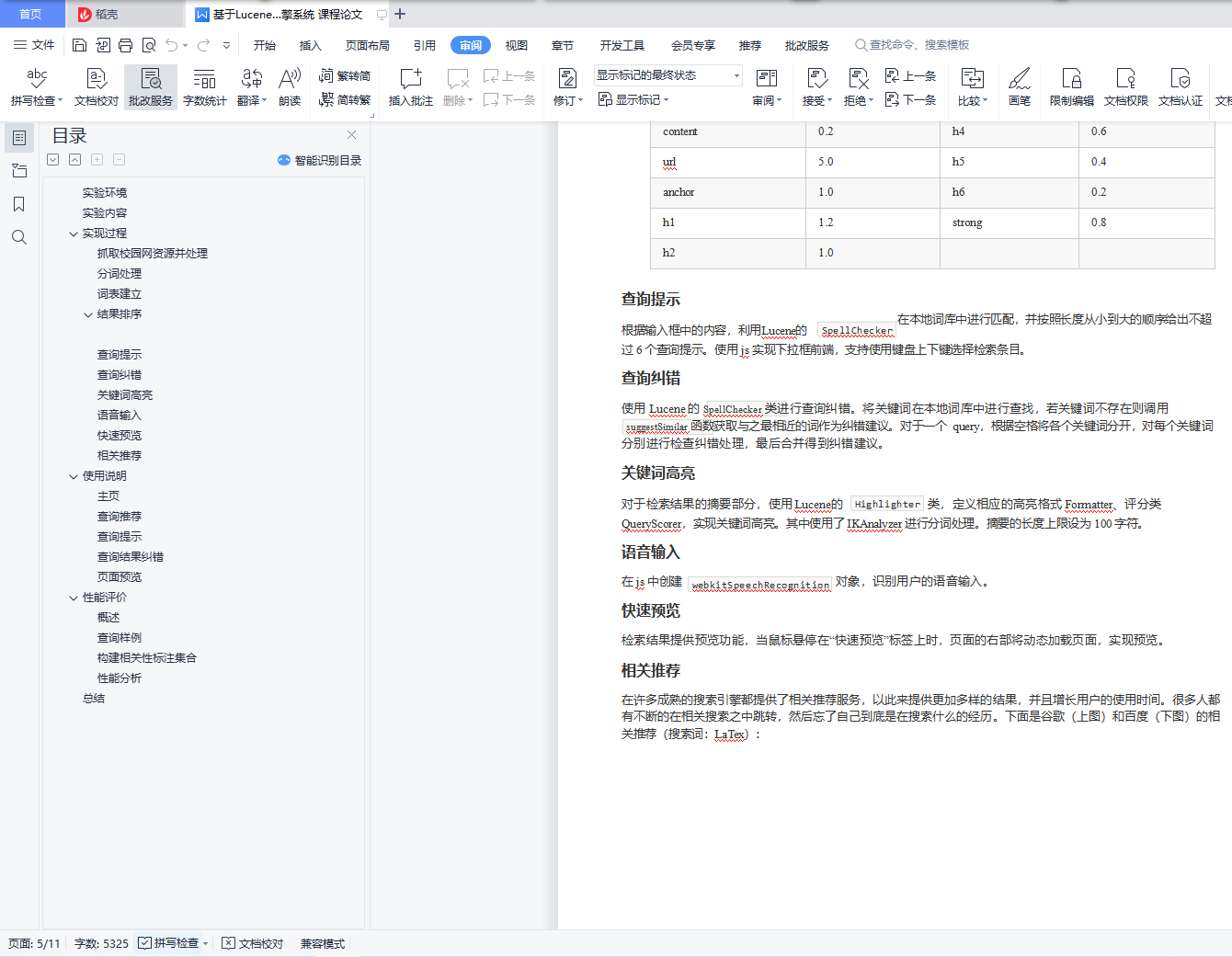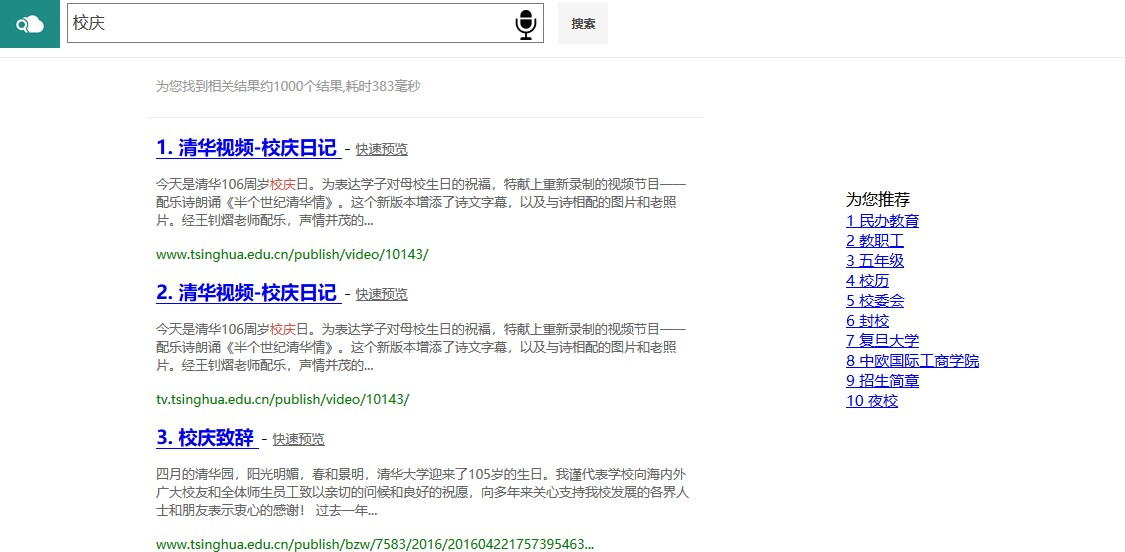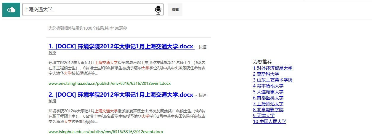 校园搜索引擎实验报告目录实验环境 1实验内容 1实现过程 2抓取校园网资源并处理 2分词处理 3词表建立 4结果排序 4查询提示 5查询纠错 5关键词高亮 5语音输入 5快速预览 5相关推荐 5使用说明 7主页 7查询推荐 7查询提示 8查询结果纠错 9页面预览 9性能评价 9概述 9查询样例 10构建相关性标注集合 10性能分析 11总结 11实验环境apache-tomcat-7.0.86 paoding-analysis-2.0.4-beta IDEA ULTIMATEwin10实验内容综合运用搜索引擎体系结构和核心算法方面的知识,基于开源资源搭建搜索引擎,具体包括如下几点:1.抓取清华校园网内绝大部分资源,并且进行预处理;2.基于Lucene实现校园搜索引擎――太强搜索;3.加入关键词纠错、查询提示、语音搜索、相关推荐功能,以提高太强搜索的体验;4.美化Web界面,实现关键词高亮、快速预览等功能;5.完成对于太强搜索的性能评价。实现过程抓取校园网资源并处理使用 Heritrix 抓取工具,抓取 HTML,PDF,M.S.Word 格式的文件28万份,共计31GB。编写 Python 脚本处理抓取到的数据,解析成 json 文件: 首先遍历所有抓取到的 文件,为每一个文件分配一个 ID,文件与 ID 一一对应,ID 用于之后PageRank的计算。获取文件的标题、文本 (docContent)、标签(h1~h6)、加粗(strong)信息等。使用BeatifulSoup 库解 析 HTML 文件内容,获取其中的超链接,为抓取到的整个数据包构建图结构, 根据图结构计算网页的 PageRank,使用pdfminer库解析pdf文件,使用docx2txt库解析word文件。我们发现实际抓到的html文件给出的charset有时是错误的,因此使用了chardet自动判断网页的编码,这样我们便可以处理几乎所有的编码。