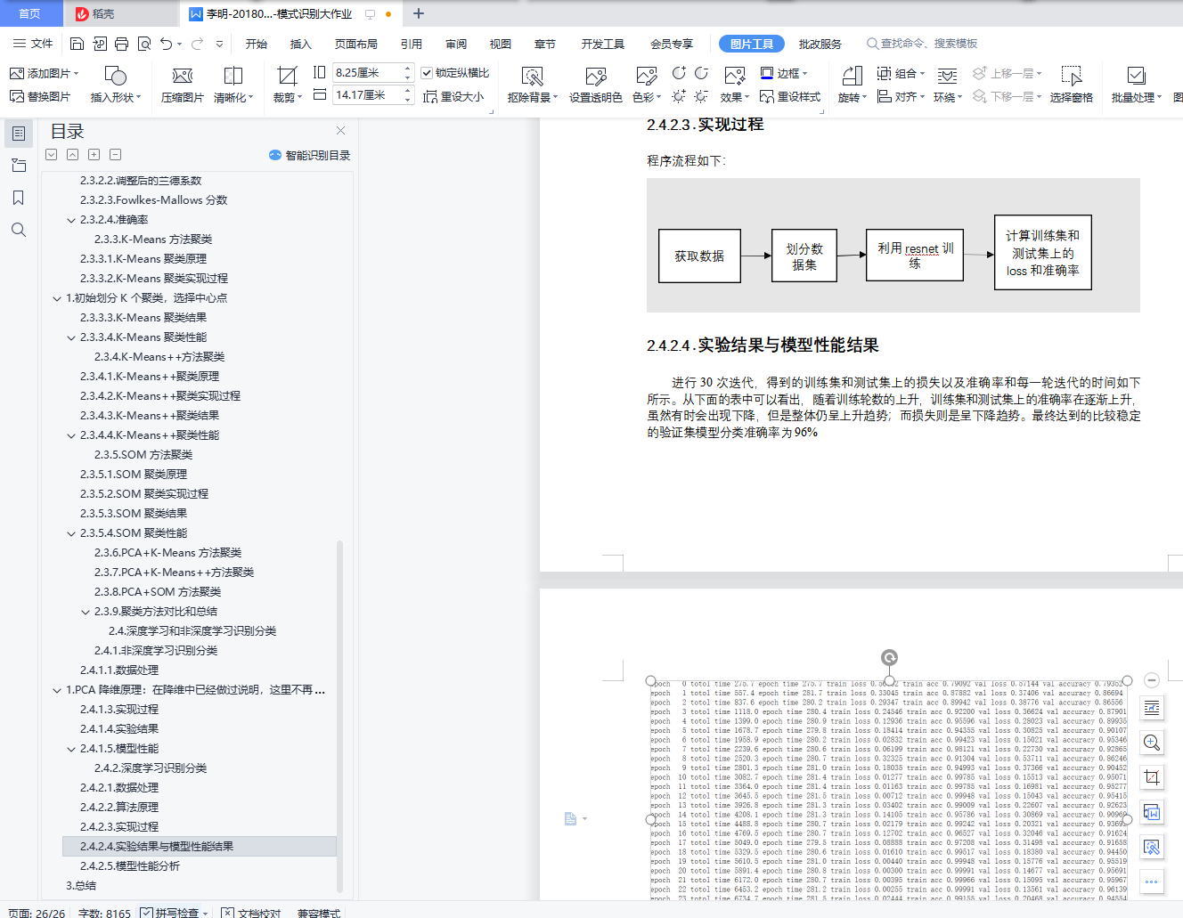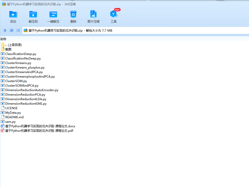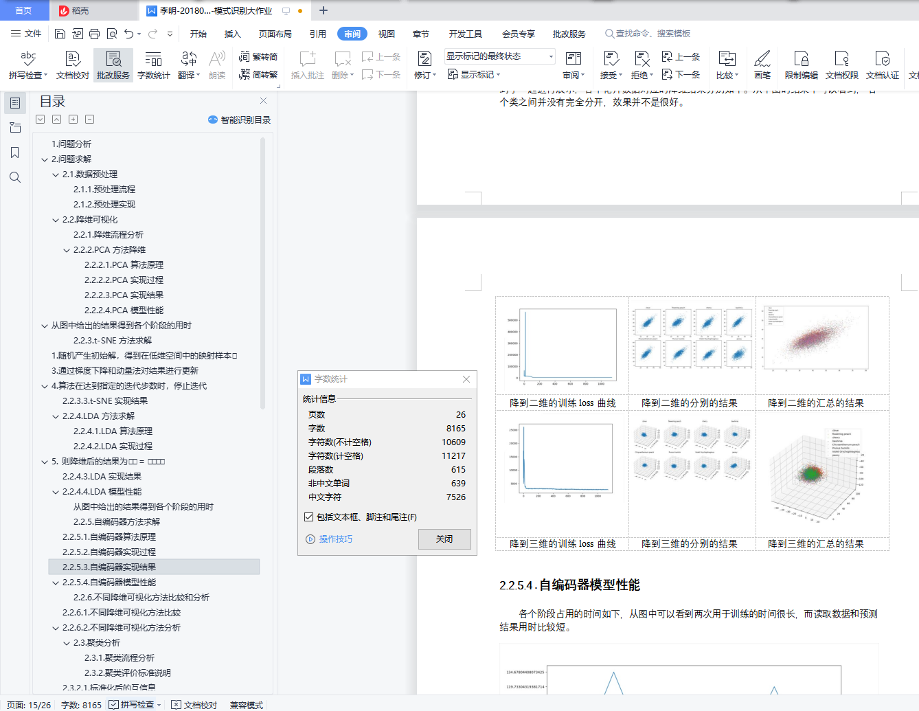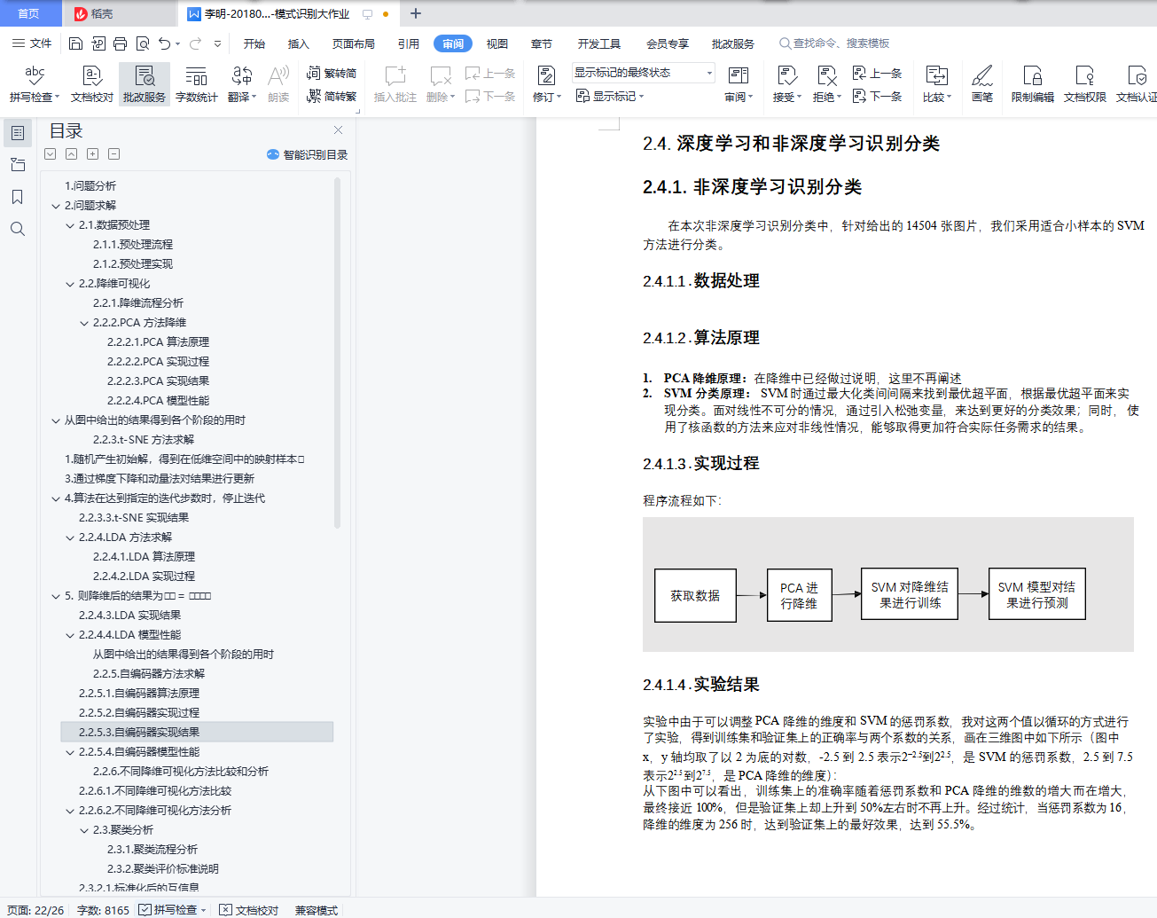 目录1. 问题分析 32. 问题求解 32.1. 数据预处理 32.1.1. 预处理流程 32.1.2. 预处理实现 42.2. 降维可视化 42.2.1. 降维流程分析 42.2.2. PCA 方法降维 4从图中给出的结果得到各个阶段的用时 62.2.3. t-SNE 方法求解 71. 随机产生初始解,得到在低维空间中的映射样本𝑌 73. 通过梯度下降和动量法对结果进行更新 74. 算法在达到指定的迭代步数时,停止迭代 72.2.3.3.t-SNE 实现结果 72.2.4. LDA 方法求解 102.2.4.1. LDA 算法原理 102.2.4.2. LDA 实现过程 105. 则降维后的结果为𝑧𝑖 = 𝑊𝑇𝑥𝑖 102.2.4.3. LDA 实现结果 102.2.4.4. LDA 模型性能 12从图中给出的结果得到各个阶段的用时 122.2.5. 自编码器方法求解 132.2.5.1 .自编码器算法原理 132.2.5.2 .自编码器实现过程 132.2.5.3 .自编码器实现结果 142.2.5.4 .自编码器模型性能 152.2.6. 不同降维可视化方法比较和分析 162.2.6.1 .不同降维可视化方法比较 162.2.6.2 .不同降维可视化方法分析 162.3. 聚类分析 162.3.1. 聚类流程分析 162.3.2. 聚类评价标准说明 172.3.2.1 .标准化后的互信息 172.3.2.2 .调整后的兰德系数 172.3.2.3.Fowlkes-Mallows 分数 172.3.2.4.准确率 172.3.3. K-Means 方法聚类 172.3.3.1.K-Means 聚类原理 172.3.3.2.K-Means 聚类实现过程 181. 初始划分 K 个聚类,选择中心点 182.3.3.3.K-Means 聚类结果 182.3.3.4.K-Means 聚类性能 182.3.4. K-Means++方法聚类 182.3.4.1.K-Means++聚类原理 182.3.4.2.K-Means++聚类实现过程 182.3.4.3.K-Means++聚类结果 192.3.4.4.K-Means++聚类性能 192.3.5. SOM 方法聚类 192.3.5.1. SOM 聚类原理 192.3.5.2. SOM 聚类实现过程 192.3.5.3. SOM 聚类结果 202.3.5.4. SOM 聚类性能 202.3.6. PCA+K-Means 方法聚类 202.3.7. PCA+K-Means++方法聚类 202.3.8. PCA+SOM 方法聚类 212.3.9. 聚类方法对比和总结 212.4. 深度学习和非深度学习识别分类 222.4.1. 非深度学习识别分类 222.4.1.1 .数据处理 221. PCA 降维原理:在降维中已经做过说明,这里不再阐述 222.4.1.3 .实现过程 222.4.1.4 .实验结果 222.4.1.5 .模型性能 232.4.2. 深度学习识别分类 232.4.2.1 .数据处理 232.4.2.2 .算法原理 232.4.2.3 .实现过程 252.4.2.4 .实验结果与模型性能结果 252.4.2.5 .模型性能分析 263. 总结 261.问题分析本次任务以花卉识别为题,借用机器学习方法,完成降维可视化、聚类分析、识别分类等任务。降维可视化是在以 PCA、tSNE 等方法,将花卉数据进行降维,得到降维后的二维图像, 这样便可以将其在平面上展示出来。聚类分析是利用合适的聚类方法,对花卉数据进行聚类, 将聚类之后的结果与标签进行对应,讨论不同聚类方法的结果。使用非深度学习和深度学习的方法,对已经标注完成但是可能含有误标数据的花卉样本进行分类,得到最终的花卉识别准确率。2.问题求解2.1.数据预处理2.1.1.预处理流程给定的数据集为 jpg 格式的数据,由于读取 jpg 格式的图片比较慢,所以将 jpg 格式存储在 numpy 的多维数组中,将提取出的多维数组存储在磁盘中,并且在下一次读取数据时, 先判断是否存在已经打包好的多维数组文件。如果存在,那么直接读取多维数组的数据;如果不存在,那么读取源文件,并将数据存到多维数组中,再存到磁盘里,供下次使用。