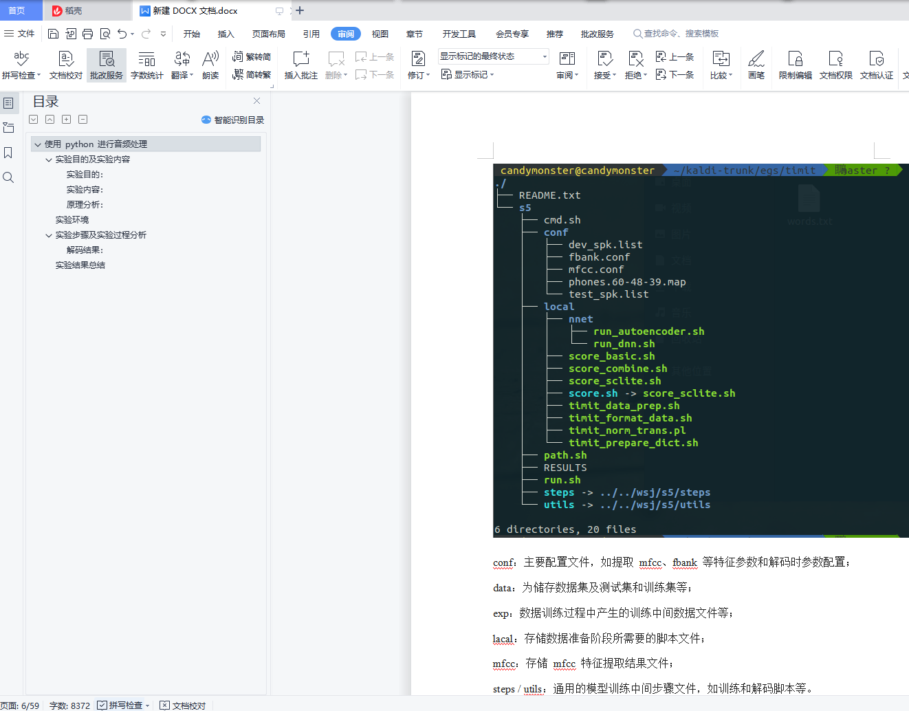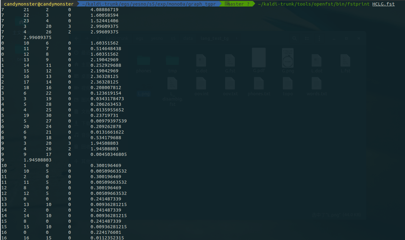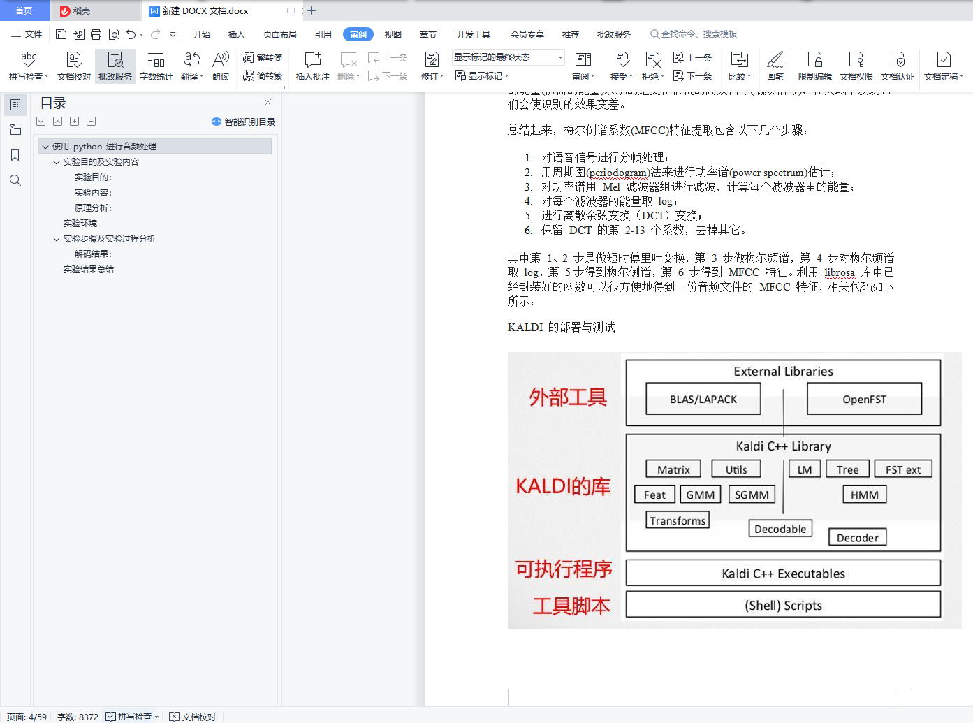 使用 python 进行音频处理目录使用 python 进行音频处理 1实验目的及实验内容 1实验目的: 1实验内容: 1原理分析: 1实验环境 6实验步骤及实验过程分析 8解码结果: 56实验结果总结 57实验目的及实验内容(本次实验所涉及并要求掌握的知识;实验内容;必要的原理分析)实验目的:使用 python 进行音频处理实验内容:学习音频相关知识点,掌握 MFCC 特征提取步骤,使用给定的 chew.wav 音频文件进行特征提取。音频文件在实验群里下载。部署 KALDI,简要叙述部署步骤运行 yes/no 项目实例,简要解析发音词典内容,画出初步的 WFST 图(按 PPT 里图的形式)。调整并运行 TIMIT 项目,将命令行输出的过程与 run.sh 各部分进行对应,叙述顶层脚本run.sh 的各部分功能(不需要解析各训练过程的详细原理)。原理分析:对 chew.wav 进行特征提取声音信号本是一维时域信号(声音信号随时间变化),我们可以通过傅里叶变换将其转换到频域上,但这样又失去了时域信息,无法看出频率分布随时间的变化。短时傅里叶(STFT)就是为了解决这个问题而发明的常用手段。所谓的短时傅里叶变换,即把一段长信号分帧、加窗,再对每一帧做快速傅里叶变换(FFT),最后把每一帧的结果沿另一个维度堆叠起来,得到类似于一幅图的二维信号形式。语音信号是不稳定的时变信号,但为了便于处理,我们假设在一个很短的时间内,如-40ms 内为一个稳定的系统,也就是 1 帧。但是我们不能简单平均分割语音,相邻的帧之间需要有一定的重合。我们通常以 25ms 为 1 帧,帧移为 10ms,因此 1 秒的信号会有 10 帧。