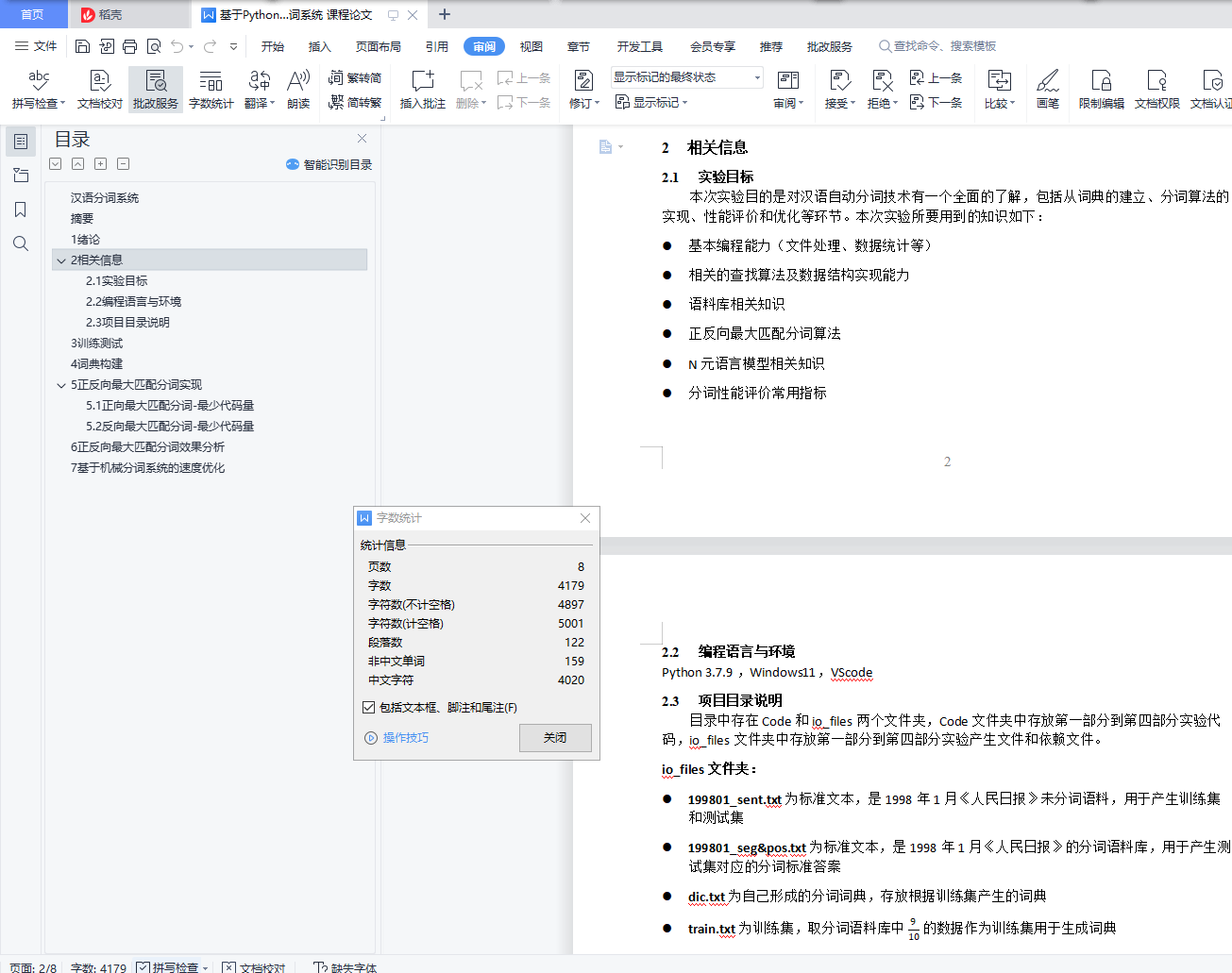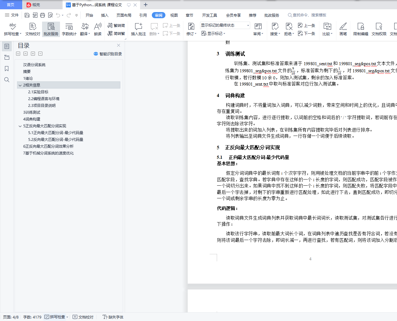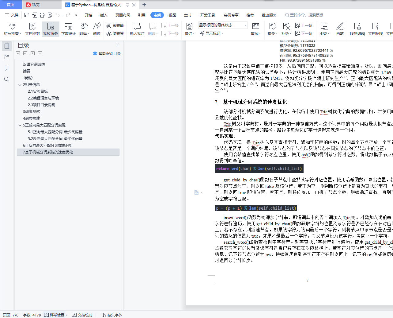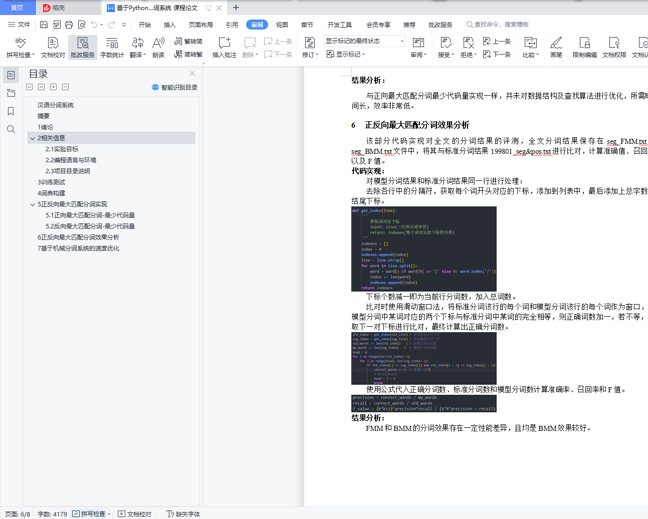 汉语分词系统目录汉语分词系统 1摘要 11 绪论 12 相关信息 12.1 实验目标 12.2 编程语言与环境 22.3 项目目录说明 23 训练测试 34 词典构建 35 正反向最大匹配分词实现 35.1 正向最大匹配分词-最少代码量 35.2 反向最大匹配分词-最少代码量 46 正反向最大匹配分词效果分析 57 基于机械分词系统的速度优化 6