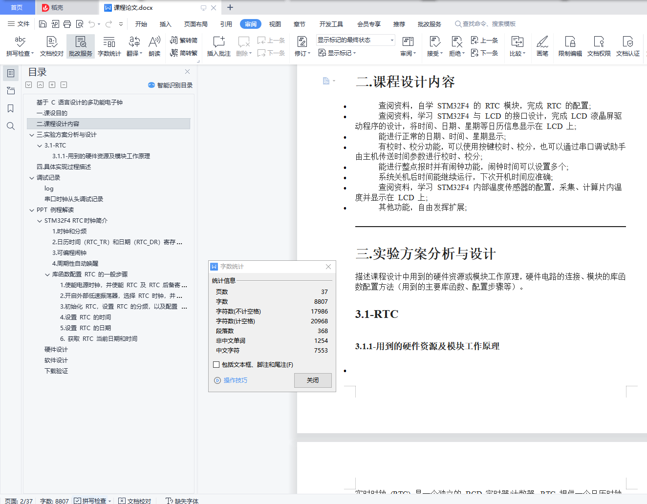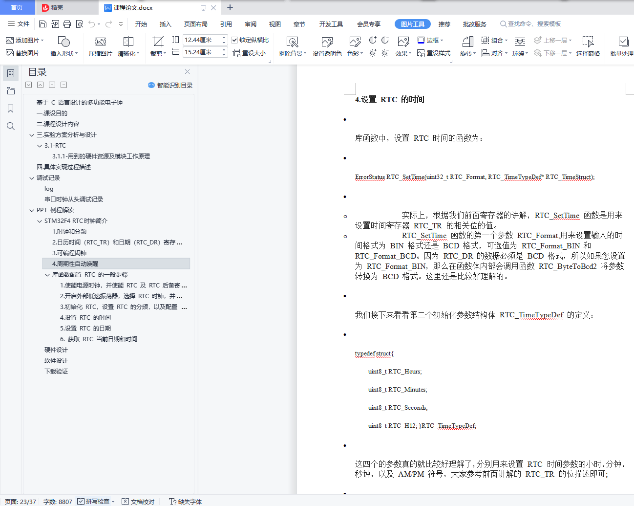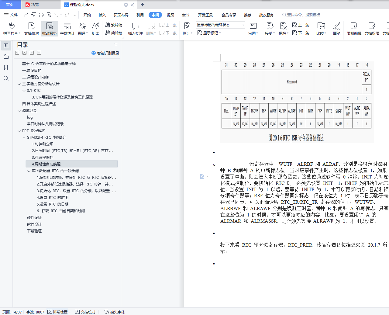 基于 C 语言设计的多功能电子钟目 录基于 C 语言设计的多功能电子钟 1一.课设目的 1二.课程设计内容 1三.实验方案分析与设计 23.1-RTC 23.1.1-用到的硬件资源及模块工作原理 2四.具体实现过程描述 2调试记录 3log 3串口时钟从头调试记录 3PPT 例程解读 3STM32F4 RTC 时钟简介 31.时钟和分频 62.日历时间(RTC_TR)和日期(RTC_DR)寄存器 73.可编程闹钟 74.周期性自动唤醒 7库函数配置 RTC 的一般步骤 19硬件设计 25软件设计 26下载验证 36一.课设目的1、 进一步巩固掌握嵌入式系统课程所学 STM32F4 各功能模块的工作原理;2、 进一步熟练掌握 STM32F4 各功能模块的配置与使用方法;3、 进一步熟练掌握开发环境 Keil MDK5 的使用与程序调试技巧;4、 自学部分功能模块的原理、配置与使用方法,培养自学能力;5、 培养设计复杂嵌入式应用软、硬件系统的分析与设计能力。二.课程设计内容查阅资料,自学 STM32F4 的 RTC 模块,完成 RTC 的配置;查阅资料,学习 STM32F4 与 LCD 的接口设计,完成 LCD 液晶屏驱动程序的设计,将时间、日期、星期等日历信息显示在 LCD 上;能进行正常的日期、时间、星期显示;有校时、校分功能,可以使用按键校时、校分,也可以通过串口调试助手由主机传送时间参数进行校时、校分;能进行整点报时并有闹钟功能,闹钟时间可以设置多个;系统关机后时间能继续运行,下次开机时间应准确;查阅资料,学习 STM32F4 内部温度传感器的配置,采集、计算片内温度并显示在 LCD 上;其他功能,自由发挥扩展;