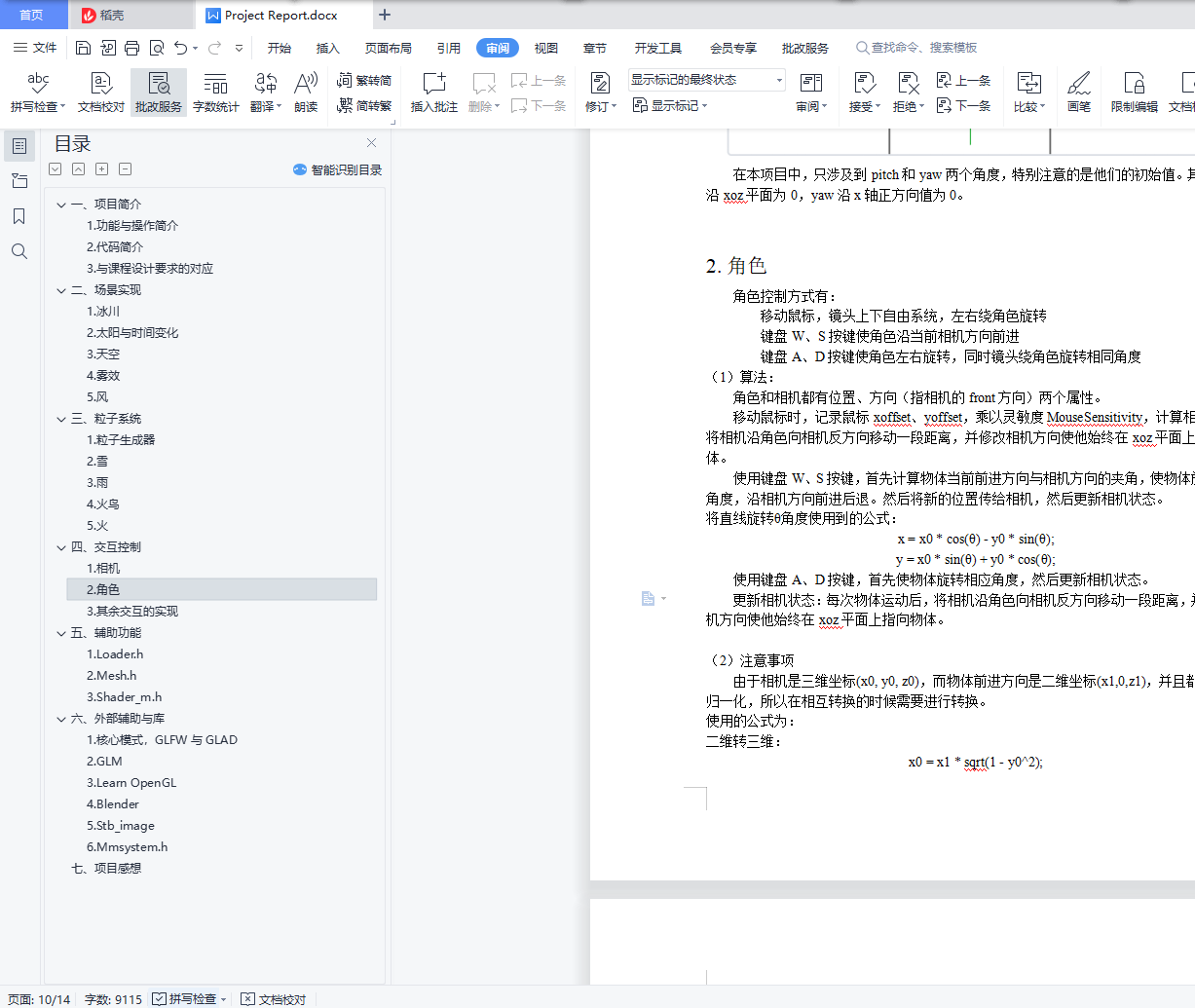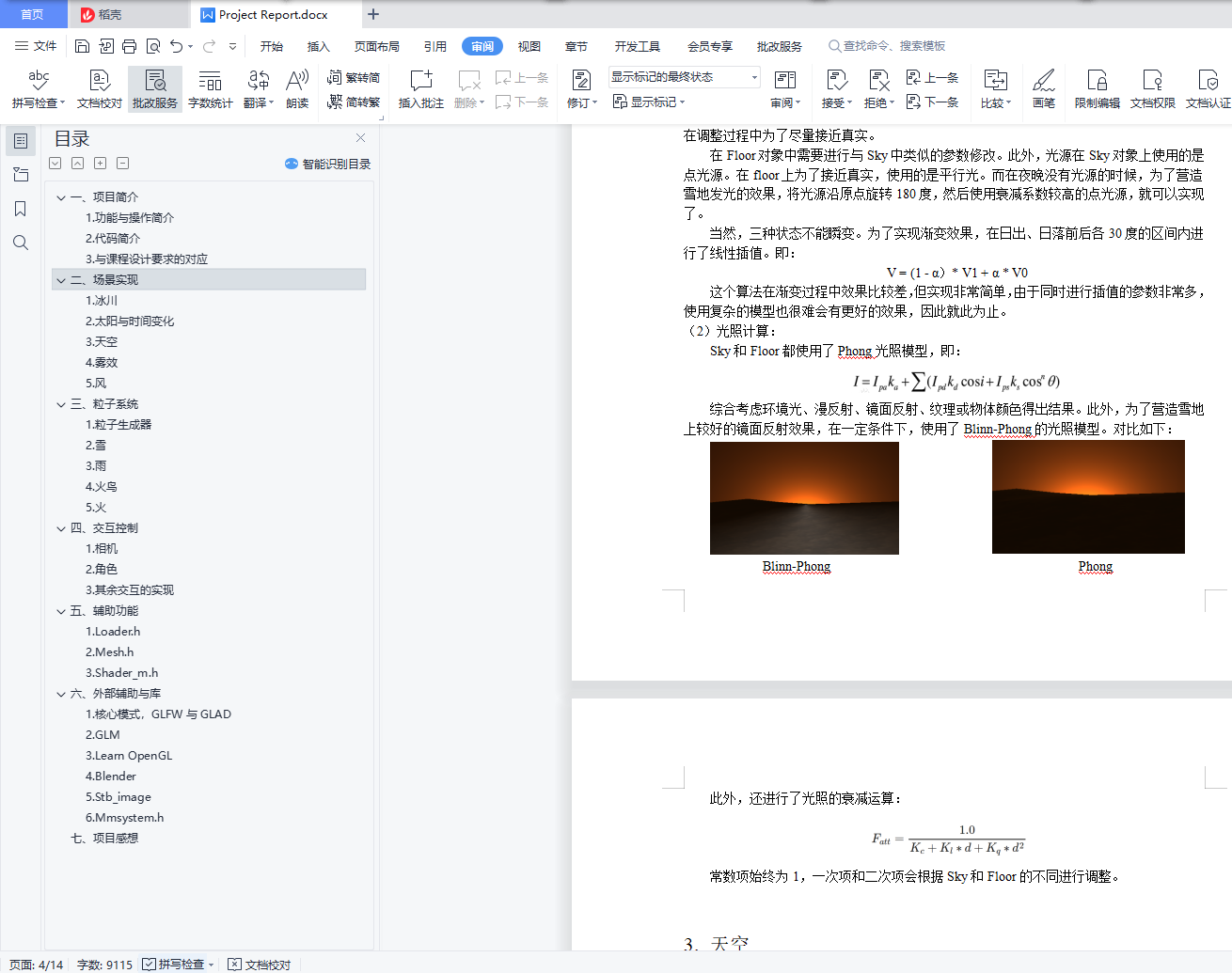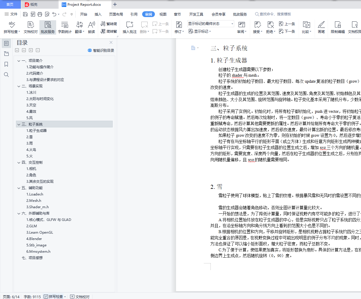 目录一、 项目简介 31. 功能与操作简介 32. 代码简介 33. 与课程设计要求的对应 4二、 场景实现 41. 冰川 42. 太阳与时间变化 53. 天空 64. 雾效 65. 风 6三、 粒子系统 71. 粒子生成器 72. 雪 73. 雨 84. 火鸟 85. 火 10四、 交互控制 101. 相机 102. 角色 113. 其余交互的实现 12五、 辅助功能 131. Loader.h 132. Mesh.h 133. Shader_m.h 13六、 外部辅助与库 131. 核心模式,GLFW与GLAD 132. GLM 133. Learn OpenGL 134. Blender 145. Stb_image 146. Mmsystem.h 14七、项目感想 14一、项目简介1.功能与操作简介本项目搭建了一个冰川场景。场景中包括冰面、天空。拥有白天、夜晚、黄昏/黎明三个时间段,雨、雪、暴风、雾等天气。场景中有一只火鸟,以及一些散落在地图上的火焰。火鸟接近蓝色的火焰,可将其引爆,之后火焰变为红色,然后在一段时间后变回蓝色。使用者可以控制火鸟的移动、视角的转换、时间变化快慢、天气切换等。使用鼠标控制视角,滚轮放大和缩小。使用WS控制火鸟沿当前视角方向前进,AD控制火鸟转向。使用数字键切换天气:1:晴天2:雨天3:无风雪天4:暴风雪使用+、-改变时间变化速度(由于以上均为粘滞键,按键有事需要长按才能生效)2.代码简介使用了OpenGL的核心模式,并利用了一些外部的库与代码。与头文件同名的vs文件为模型对应的顶点着色器,fs为片段着色器。CG.cpp:主函数,包括了创建窗口,创建、绘制场景中的所有物体,控制系统风力,接受用户输入,控制天气等功能。Camera.h:响应用户鼠标的滚轮和移动事件,转换视角。同时根据绑定的物体的运动状态修改相机的位置与方向。Character.h:响应用户的键盘WASD输入,改变角色的运动状态。同时控制角色(火鸟)的翅膀挥动、粒子效果等。Fire.h:控制场景中的火苗的属性。检测与主角的距离,控制火苗爆炸。Floor.h:创建冰川地形。Fog.h:控制雾的范围与变化。Light.h:控制太阳的属性、移动。Loader.h:读入模型。Mesh.h:将读入的模型与VAO、VBO绑定,加载纹理。Particle.h:粒子生成器,根据输入的各种属性生成粒子。Rain.h / Snow.h:控制雨、雪粒子系统。Sky.h:控制天空的属性。Shader_m.h:加载着色器。Stb_image.h:读入图片作为纹理。Glad.c:在运行时查找opengl函数的具体位置。最后三个文件为直接从外部导入,未作修改。此外,还使用了glfw、glm等库(详见“外部辅助与库”)。3.与课程设计要求的对应(1)场景建模及渲染,场景添加光照,光照可交互控制(20分,按照场景复杂度、渲染效果等评分)场景使用blender建模。尝试外部模型导入,但效果不好于是放弃。渲染有太阳与天空的渲染、雾效的渲染等。场景中太阳、火焰、火鸟均有光照。光照的交互控制:可控制时间变化快慢、与火焰交互可以改变火焰光照的强度、颜色。(2)设计实现粒子系统特效,粒子运动有物理仿真,可实时切换粒子系统中的粒子三维模型(30分,按照粒子系统的特效复杂度、计算模型、算法效率等评分)粒子系统有雨、雪、火焰、火鸟翅膀。雨、雪、火焰与场景中的风有物理关系,粒子的位置、速度、加速度均使用了物理学规律。可在控制天气转换的时候,实时切换粒子系统中的粒子三维模型。(3)粒子的三维模型的光照、纹理映射(20分,按照粒子的视觉外观实现方法的复杂度、实现效果评分)粒子使用三维模型,雪粒子与场景中光源有光照计算。火粒子考虑到计算效率,在生成器的位置设置了光源营造例子发光的效果。火粒子、雪粒子均有纹理映射。(4)设计实现粒子系统的交互控制(20分,根据交互方式的新颖、自然和交互响应评分)使用者可以控制火鸟的移动、视角的转换、时间变化快慢、天气切换等。