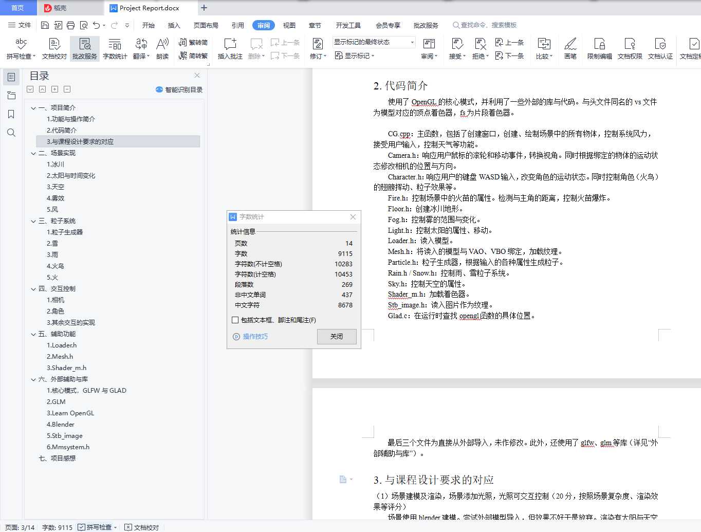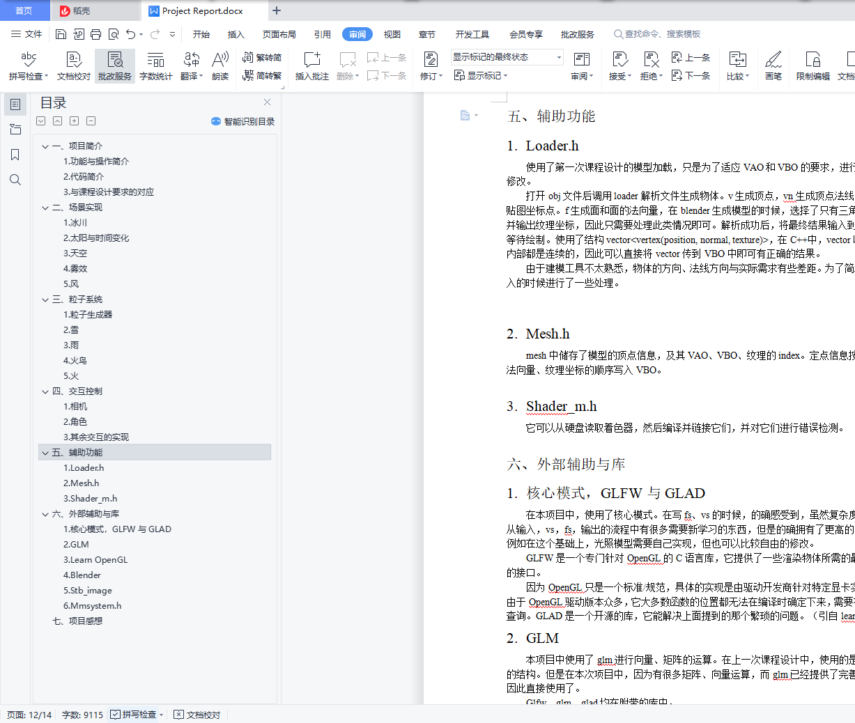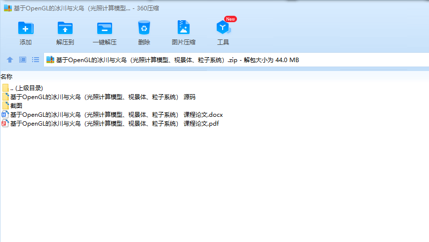 目录一、 项目简介 31. 功能与操作简介 32. 代码简介 33. 与课程设计要求的对应 4二、 场景实现 41. 冰川 42. 太阳与时间变化 53. 天空 64. 雾效 65. 风 6三、 粒子系统 71. 粒子生成器 72. 雪 73. 雨 84. 火鸟 85. 火 10四、 交互控制 101. 相机 102. 角色 113. 其余交互的实现 12五、 辅助功能 131. Loader.h 132. Mesh.h 133. Shader_m.h 13六、 外部辅助与库 131. 核心模式,GLFW与GLAD 132. GLM 133. Learn OpenGL 134. Blender 145. Stb_image 146. Mmsystem.h 14七、项目感想 14一、项目简介1.功能与操作简介本项目搭建了一个冰川场景。场景中包括冰面、天空。拥有白天、夜晚、黄昏/黎明三个时间段,雨、雪、暴风、雾等天气。场景中有一只火鸟,以及一些散落在地图上的火焰。火鸟接近蓝色的火焰,可将其引爆,之后火焰变为红色,然后在一段时间后变回蓝色。使用者可以控制火鸟的移动、视角的转换、时间变化快慢、天气切换等。使用鼠标控制视角,滚轮放大和缩小。使用WS控制火鸟沿当前视角方向前进,AD控制火鸟转向。使用数字键切换天气:1:晴天2:雨天3:无风雪天4:暴风雪使用+、-改变时间变化速度(由于以上均为粘滞键,按键有事需要长按才能生效)2.代码简介使用了OpenGL的核心模式,并利用了一些外部的库与代码。与头文件同名的vs文件为模型对应的顶点着色器,fs为片段着色器。CG.cpp:主函数,包括了创建窗口,创建、绘制场景中的所有物体,控制系统风力,接受用户输入,控制天气等功能。Camera.h:响应用户鼠标的滚轮和移动事件,转换视角。同时根据绑定的物体的运动状态修改相机的位置与方向。Character.h:响应用户的键盘WASD输入,改变角色的运动状态。同时控制角色(火鸟)的翅膀挥动、粒子效果等。Fire.h:控制场景中的火苗的属性。检测与主角的距离,控制火苗爆炸。Floor.h:创建冰川地形。Fog.h:控制雾的范围与变化。Light.h:控制太阳的属性、移动。Loader.h:读入模型。Mesh.h:将读入的模型与VAO、VBO绑定,加载纹理。Particle.h:粒子生成器,根据输入的各种属性生成粒子。Rain.h / Snow.h:控制雨、雪粒子系统。Sky.h:控制天空的属性。Shader_m.h:加载着色器。Stb_image.h:读入图片作为纹理。Glad.c:在运行时查找opengl函数的具体位置。最后三个文件为直接从外部导入,未作修改。此外,还使用了glfw、glm等库(详见“外部辅助与库”)。3.与课程设计要求的对应(1)场景建模及渲染,场景添加光照,光照可交互控制(20分,按照场景复杂度、渲染效果等评分)场景使用blender建模。尝试外部模型导入,但效果不好于是放弃。渲染有太阳与天空的渲染、雾效的渲染等。场景中太阳、火焰、火鸟均有光照。光照的交互控制:可控制时间变化快慢、与火焰交互可以改变火焰光照的强度、颜色。(2)设计实现粒子系统特效,粒子运动有物理仿真,可实时切换粒子系统中的粒子三维模型(30分,按照粒子系统的特效复杂度、计算模型、算法效率等评分)粒子系统有雨、雪、火焰、火鸟翅膀。雨、雪、火焰与场景中的风有物理关系,粒子的位置、速度、加速度均使用了物理学规律。可在控制天气转换的时候,实时切换粒子系统中的粒子三维模型。(3)粒子的三维模型的光照、纹理映射(20分,按照粒子的视觉外观实现方法的复杂度、实现效果评分)粒子使用三维模型,雪粒子与场景中光源有光照计算。火粒子考虑到计算效率,在生成器的位置设置了光源营造例子发光的效果。火粒子、雪粒子均有纹理映射。(4)设计实现粒子系统的交互控制(20分,根据交互方式的新颖、自然和交互响应评分)使用者可以控制火鸟的移动、视角的转换、时间变化快慢、天气切换等。