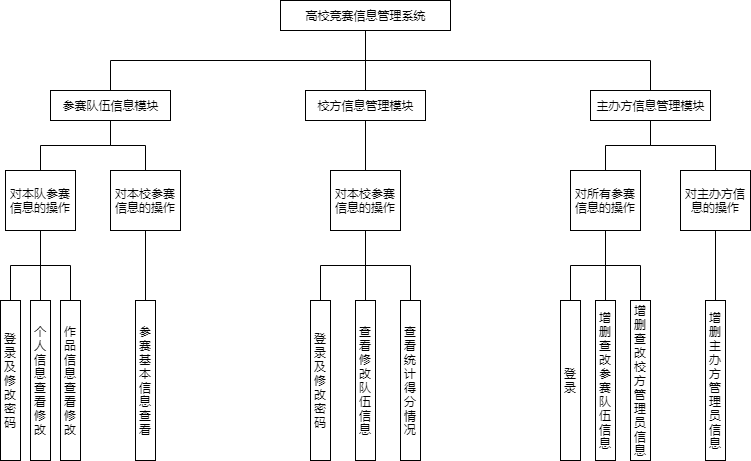 高校竞赛信息管理系统分为三个模块:参赛队伍信息模块,校方信息管理模块,主办方信息管理模块。