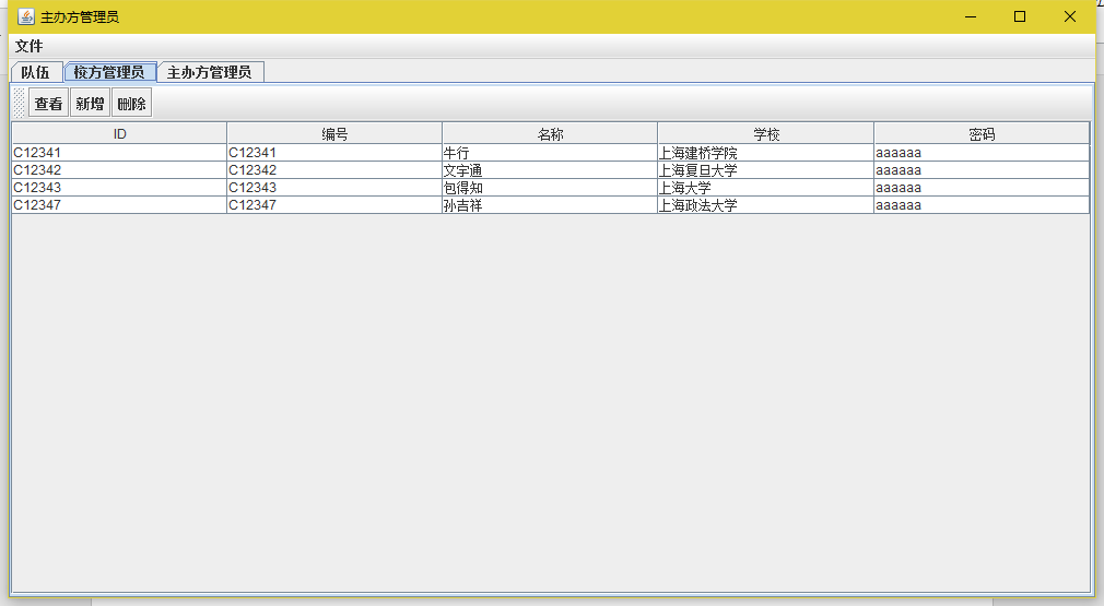 校方信息管理员可以根据主办方管理员注册的登录用户名和密码进行登录,及对密码的修改;根据需要对参赛队伍进行查看、修改和删除操作。