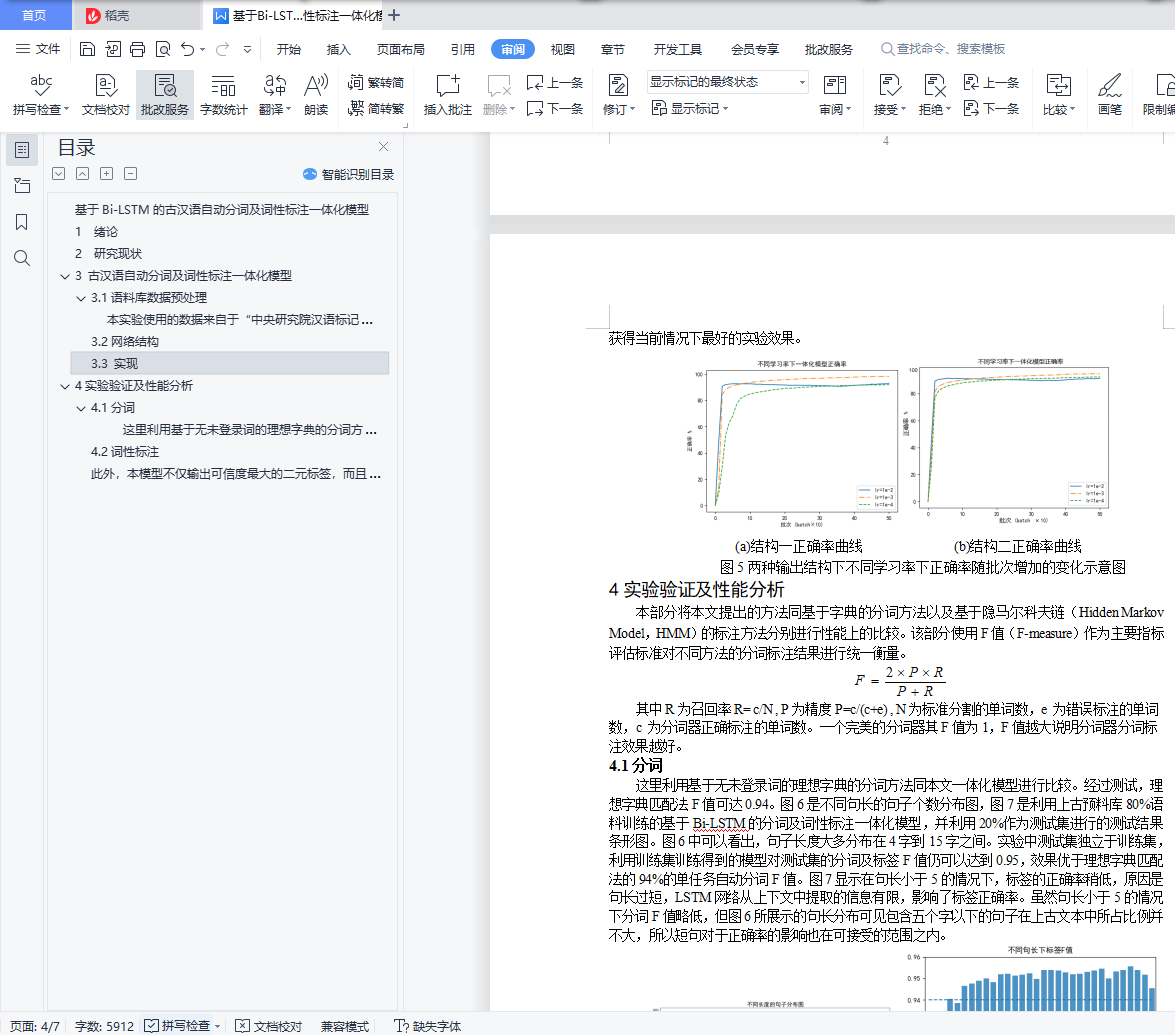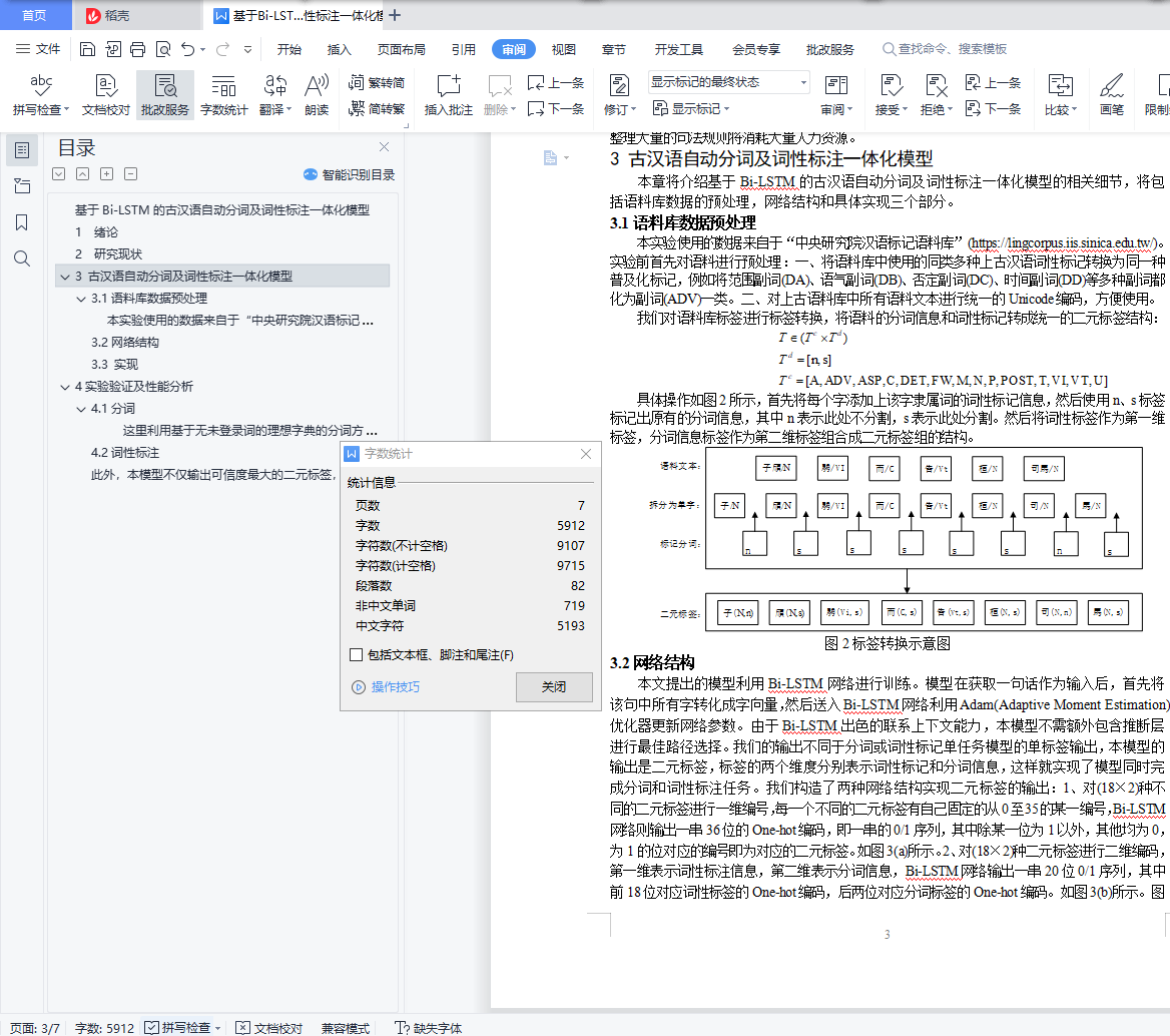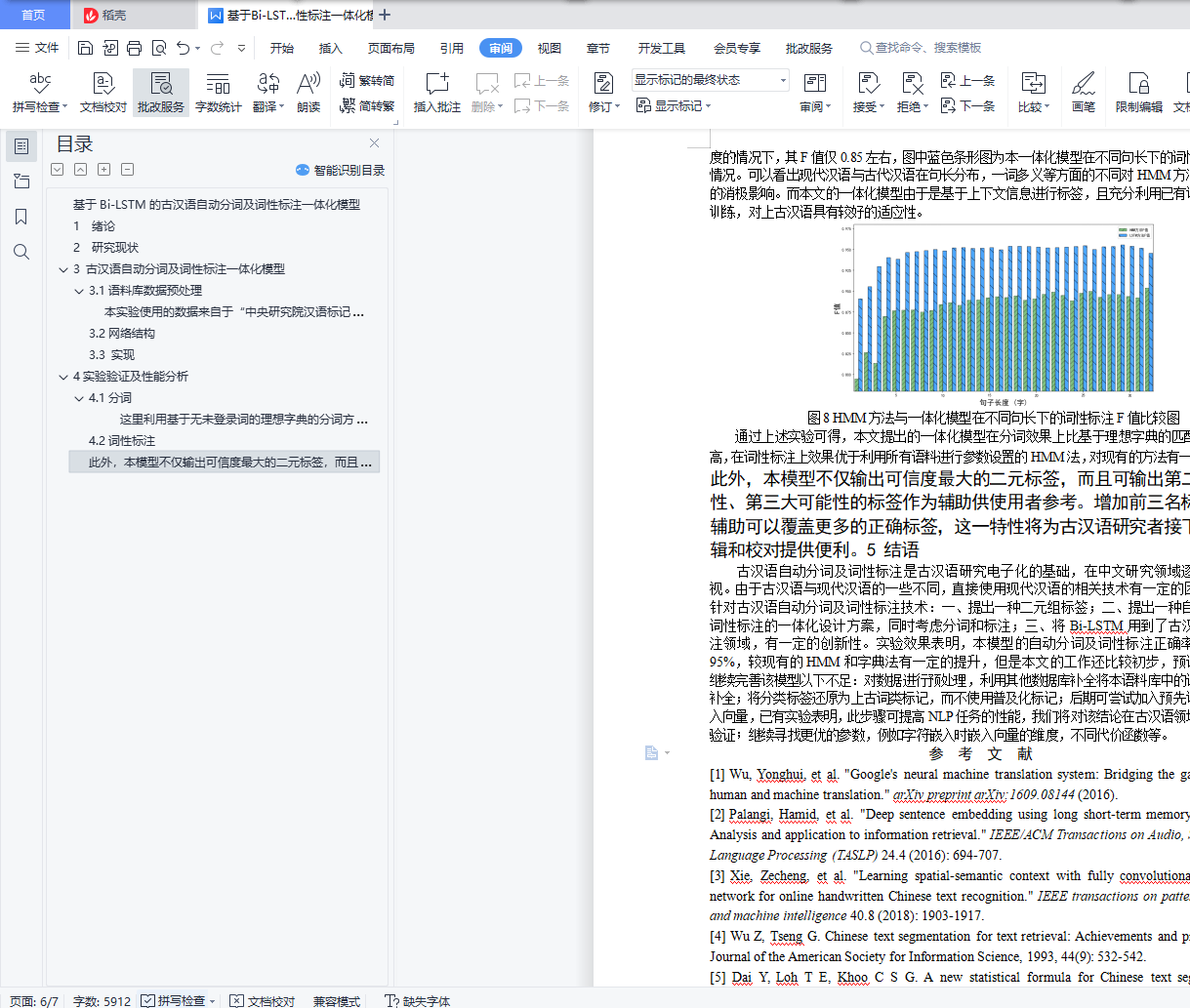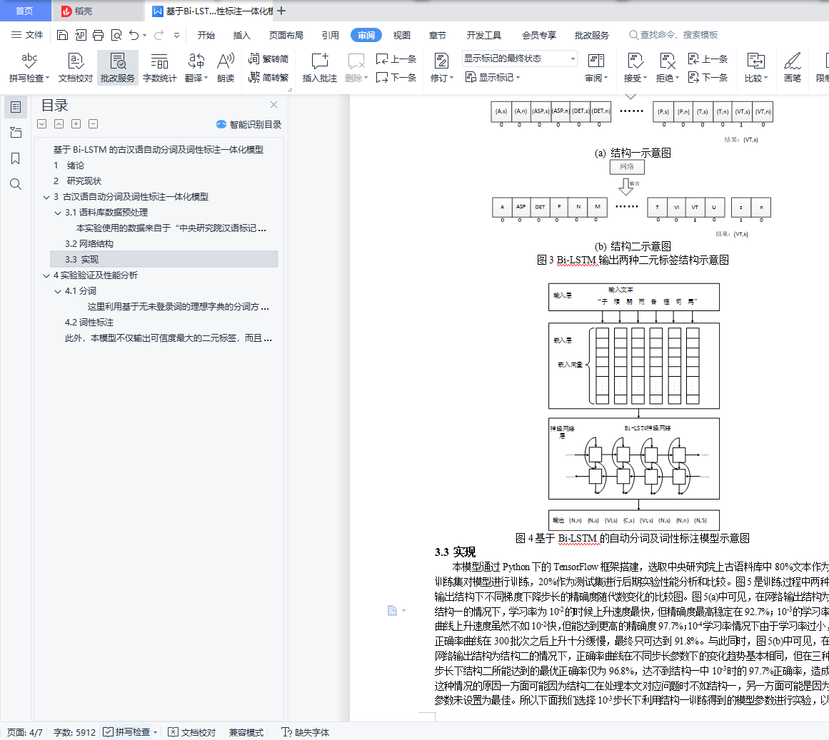 基于Bi-LSTM的古汉语自动分词及词性标注一体化模型摘 要:本文针对古汉语自动分词和词性标注进行研究。近年来大多研究者把分词和标注视作对单字进行标签,本文借鉴了这种思路,首次提出使用二元标签模式,使一个标签同时带有分词和词性信息。利用双向长短期记忆神经网络(Bidirectional Long Short-Term Memory, Bi-LSTM)的特性,获取上下文信息,在一次计算中同时对单字进行分词及词性标记。利用同一程序进行分词和标注的结果具有统一性,避免了人工的理解差异造成的语料库分词标注标准不统一的问题。本文提出针对古代汉语的分词标注一体化模型的标签正确率可达到95%,且对于部分有疑问的标签结果可输出多种其他较为可能的结果供古文研究者选择校对。关键词:古汉语,自动分词,词性标注,Bi-LSTM,二元标签Automatic segmentation and labeling model for ancient Chinese based on Bi-LSTMAbstract: This paper is aimed at the segmentation and part-of-speech tagging of ancient Chinese. In recent years, most researchers have process word segmentation and labeling as the idea of labeling words. In recent years, most researchers regard word segmentation and tagging as labeling for words. This paper uses this idea for reference, and proposes a binary tagging model for the first time to make a tag contain both word segmentation and part-of-speech information. By using the characteristics of the Bidirectional Long Short-Term Memory (Bi-LSTM) neural network, the context information is obtained, and the word segmentation and part-of-speech tagging are handled simultaneously in one calculation. The results of word segmentation and labeling using the same program are uniform, which avoids the problem that the corpus segmentation labeling standard is not uniform due to the difference of artificial understanding. This paper proposes that the word labeling model for ancient Chinese can achieve 95% correctness of the word label, In addition, for some questionable label results, a variety of other likely results can be output for the Ancient Chinese researchers to use.Keywords: Ancient Chinese, word segmentation, Part-of-speech tagging, Bi-LSTM,binary tagging目录基于Bi-LSTM的古汉语自动分词及词性标注一体化模型 11 绪论 22 研究现状 23 古汉语自动分词及词性标注一体化模型 33.1语料库数据预处理 3本实验使用的数据来自于“中央研究院汉语标记语料库”(https://lingcorpus.iis.sinica.edu.tw/)。实验前首先对语料进行预处理:一、将语料库中使用的同类多种上古汉语词性标记转换为同一种普及化标记,例如将范围副词(DA)、语气副词(DB)、否定副词(DC)、时间副词(DD)等多种副词都化为副词(ADV)一类。二、对上古语料库中所有语料文本进行统一的Unicode编码,方便使用。 33.2网络结构 33.3 实现 44实验验证及性能分析 54.1分词 54.2词性标注 55 结语 6