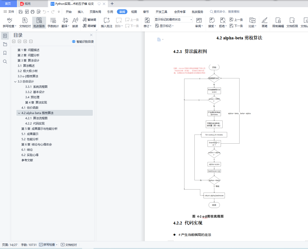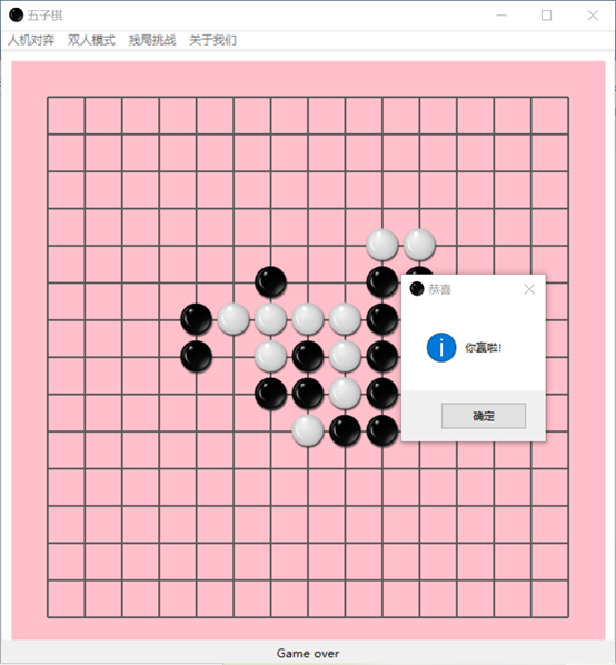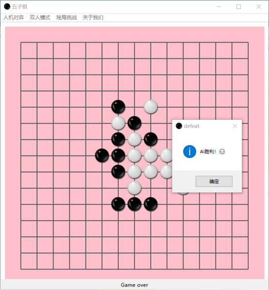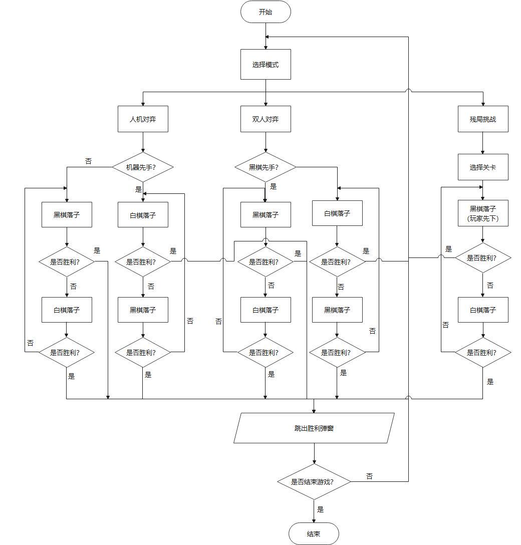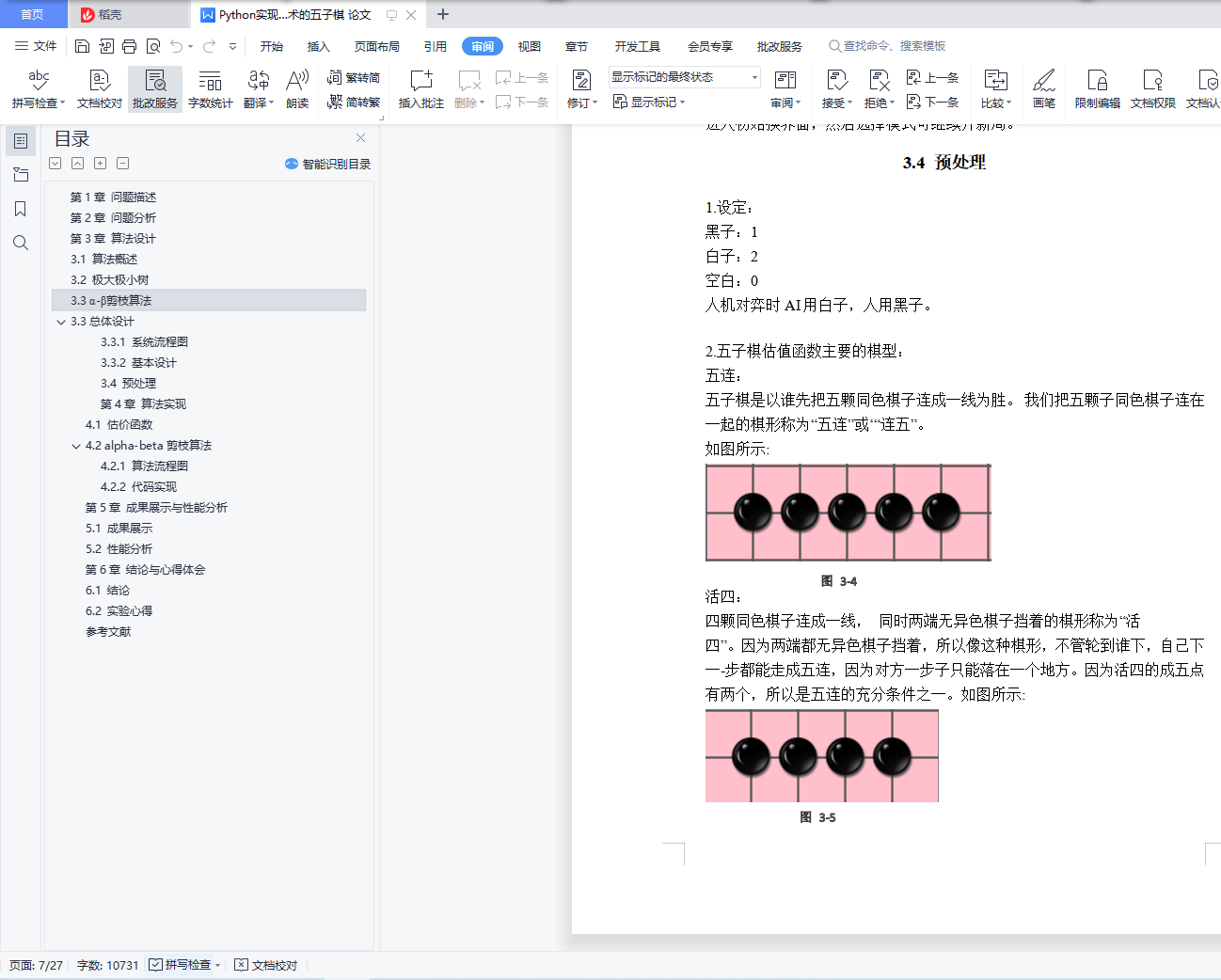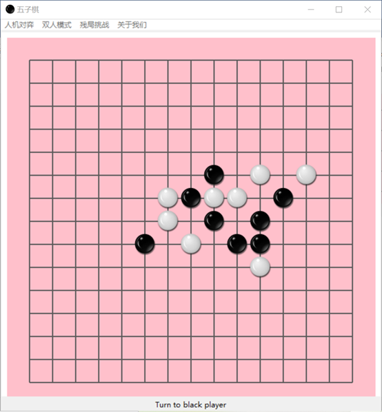 基于alpha-beta剪枝技术的五子棋目录第1章 问题描述 3第2章 问题分析 3第3章 算法设计 43.1 算法概述 43.2 极大极小树 43.3 α-β剪枝算法 53.3总体设计 63.3.1 系统流程图 73.3.2 基本设计 73.4 预处理 8第4章 算法实现 114.1 估价函数 114.2 alpha-beta剪枝算法 154.2.1 算法流程图 154.2.2 代码实现 16第5章 成果展示与性能分析 185.1 成果展示 185.2 性能分析 23第6章 结论与心得体会 236.1 结论 236.2 实验心得 24参考文献 28第1章 问题描述我们的五子棋博弈实现的是双人的、完备信息的五子棋问题,即游戏规则为双方严格的轮流走步,且任何一方能完全知道对方已走过的步和以后可以走的所有步,当某方有在一条直线上连续的五子时,游戏结束。游戏模式可以分为人机对弈和双人对弈两种模式。双人对弈模式比较容易实现,程序只需要判断是否产生胜利者即可。人机对弈模式则需要我们的程序代码实现机器落子的位置的选择确定,本程序采用基于启发式MAX/MIN算法的alpha-beta剪枝技术来选择出最佳的机器落子位置。除此之外,我们还设置了残局闯关模式,在增加了游戏趣味性的同时给用户们带来了更好的游戏体验。第2章 问题分析要想实现一个基本的五子棋博弈游戏,我们要面对的问题可大概总结为如何判断胜负,如何严格限制双方轮流下棋,游戏界面的呈现形式以及最主要的如何确定机器落子的最佳位置。经过我们团队的初步讨论后,最终决定游戏以界面的方式呈现出来,用户下棋时直接将鼠标点击在想落子的位置即可。至于判断胜负则只需要编写一个简单的函数,从横、竖、斜上、斜下四个方向逐步判断是否有五个连续的同色棋子就可实现判断。严格控制双方轮流落子通过改变flag的值间接确定当前位置是哪一方下棋,再通过相互调用对方落子的函数具体实现轮流下棋。最后就是解决最关键的问题:在人机对弈模式中如何选择出机器落子的最佳位置,这是我们整个程序代码中最核心的部分,也是算法实现中最困难的部分。就像本次课程设计的题目叙述的那样,我们经讨论决定采用启发式MAX/MIN算法的alpha-beta剪枝技术来准确且较为快速地确定机器的落子位置,其中涉及到的alpha-beta技术的具体实现以及确定最佳位置时采用的“算分机制”会在之后的模块中详细阐述。至此,我们就基本上完成了五子棋游戏的整体问题分析,剩下的就是一些界面优化,残局棋谱设计等非关键问题,我们的团队在不断的实践和优化中最终实现了一个功能完善,界面优美且操作流畅的五子棋博弈小游戏。