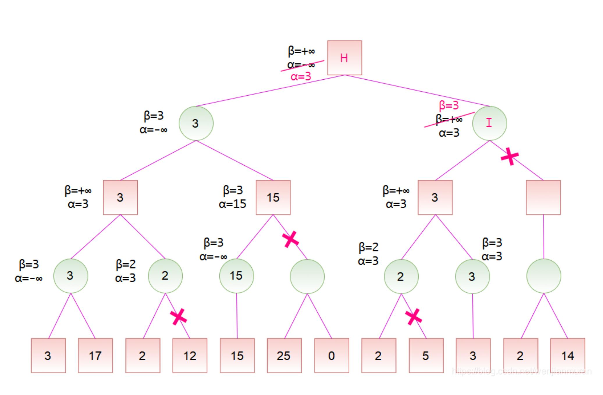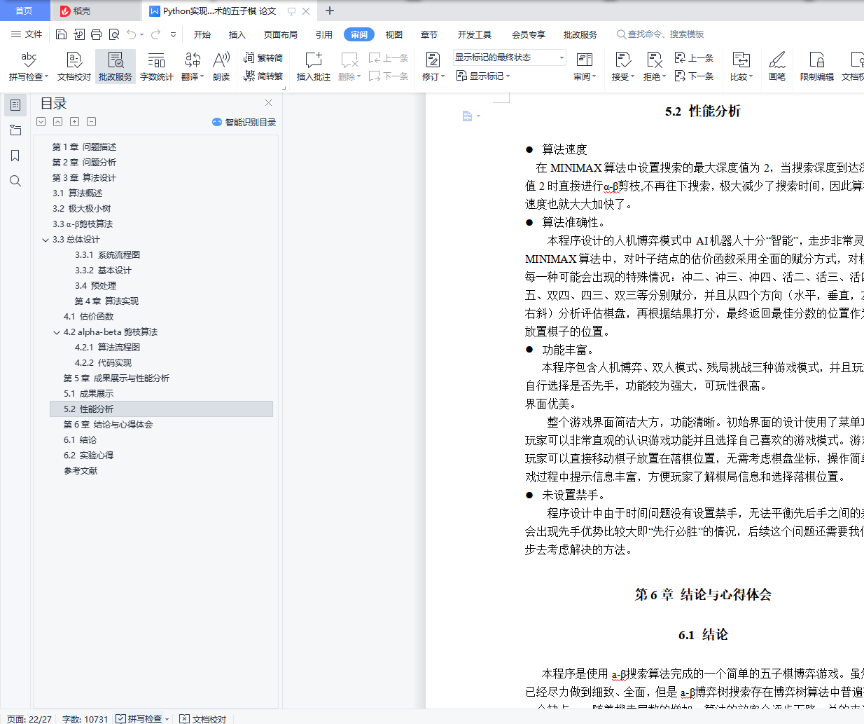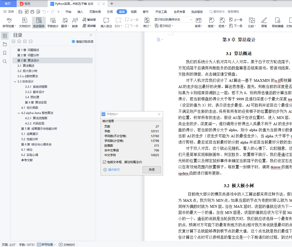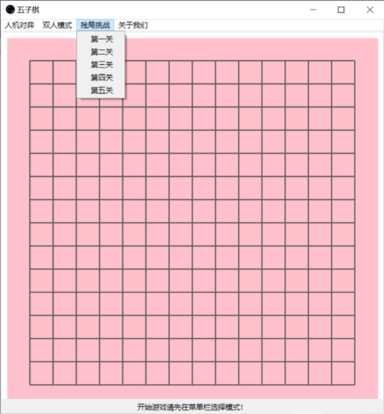 基于alpha-beta剪枝技术的五子棋目录第1章 问题描述 3第2章 问题分析 3第3章 算法设计 43.1 算法概述 43.2 极大极小树 43.3 α-β剪枝算法 53.3总体设计 63.3.1 系统流程图 73.3.2 基本设计 73.4 预处理 8第4章 算法实现 114.1 估价函数 114.2 alpha-beta剪枝算法 154.2.1 算法流程图 154.2.2 代码实现 16第5章 成果展示与性能分析 185.1 成果展示 185.2 性能分析 23第6章 结论与心得体会 236.1 结论 236.2 实验心得 24参考文献 28第1章 问题描述我们的五子棋博弈实现的是双人的、完备信息的五子棋问题,即游戏规则为双方严格的轮流走步,且任何一方能完全知道对方已走过的步和以后可以走的所有步,当某方有在一条直线上连续的五子时,游戏结束。游戏模式可以分为人机对弈和双人对弈两种模式。双人对弈模式比较容易实现,程序只需要判断是否产生胜利者即可。人机对弈模式则需要我们的程序代码实现机器落子的位置的选择确定,本程序采用基于启发式MAX/MIN算法的alpha-beta剪枝技术来选择出最佳的机器落子位置。除此之外,我们还设置了残局闯关模式,在增加了游戏趣味性的同时给用户们带来了更好的游戏体验。第2章 问题分析要想实现一个基本的五子棋博弈游戏,我们要面对的问题可大概总结为如何判断胜负,如何严格限制双方轮流下棋,游戏界面的呈现形式以及最主要的如何确定机器落子的最佳位置。经过我们团队的初步讨论后,最终决定游戏以界面的方式呈现出来,用户下棋时直接将鼠标点击在想落子的位置即可。至于判断胜负则只需要编写一个简单的函数,从横、竖、斜上、斜下四个方向逐步判断是否有五个连续的同色棋子就可实现判断。严格控制双方轮流落子通过改变flag的值间接确定当前位置是哪一方下棋,再通过相互调用对方落子的函数具体实现轮流下棋。最后就是解决最关键的问题:在人机对弈模式中如何选择出机器落子的最佳位置,这是我们整个程序代码中最核心的部分,也是算法实现中最困难的部分。就像本次课程设计的题目叙述的那样,我们经讨论决定采用启发式MAX/MIN算法的alpha-beta剪枝技术来准确且较为快速地确定机器的落子位置,其中涉及到的alpha-beta技术的具体实现以及确定最佳位置时采用的“算分机制”会在之后的模块中详细阐述。至此,我们就基本上完成了五子棋游戏的整体问题分析,剩下的就是一些界面优化,残局棋谱设计等非关键问题,我们的团队在不断的实践和优化中最终实现了一个功能完善,界面优美且操作流畅的五子棋博弈小游戏。