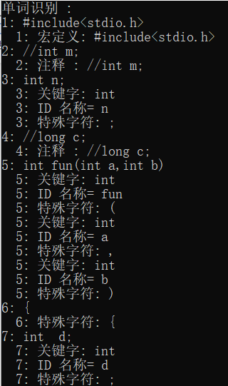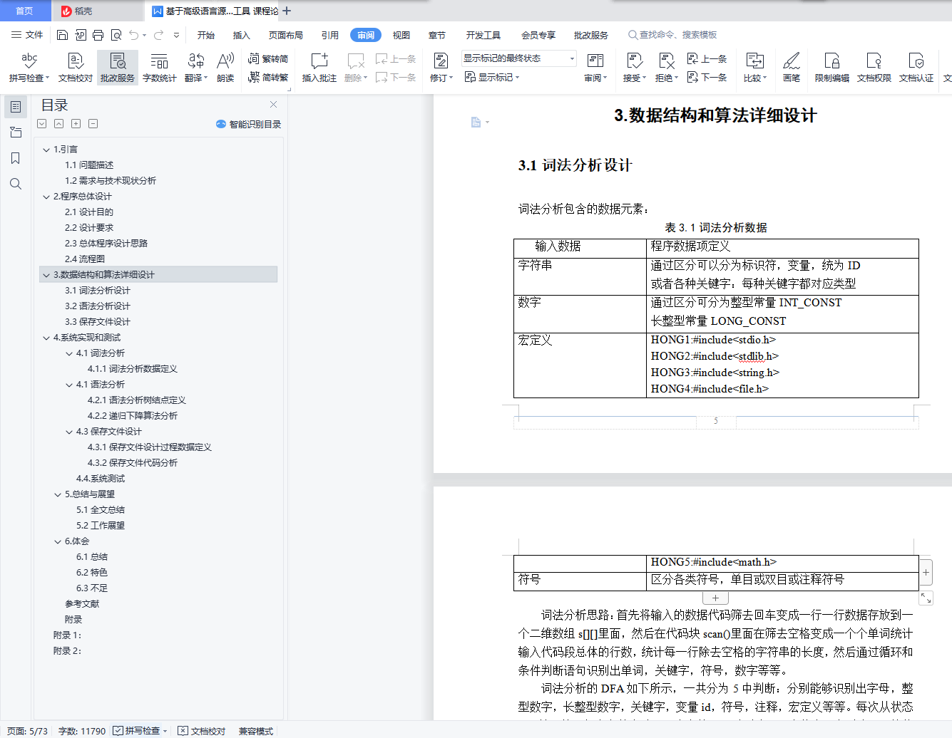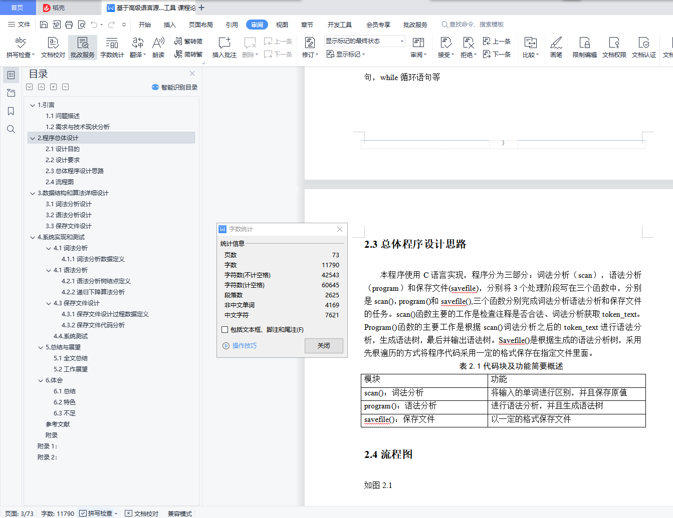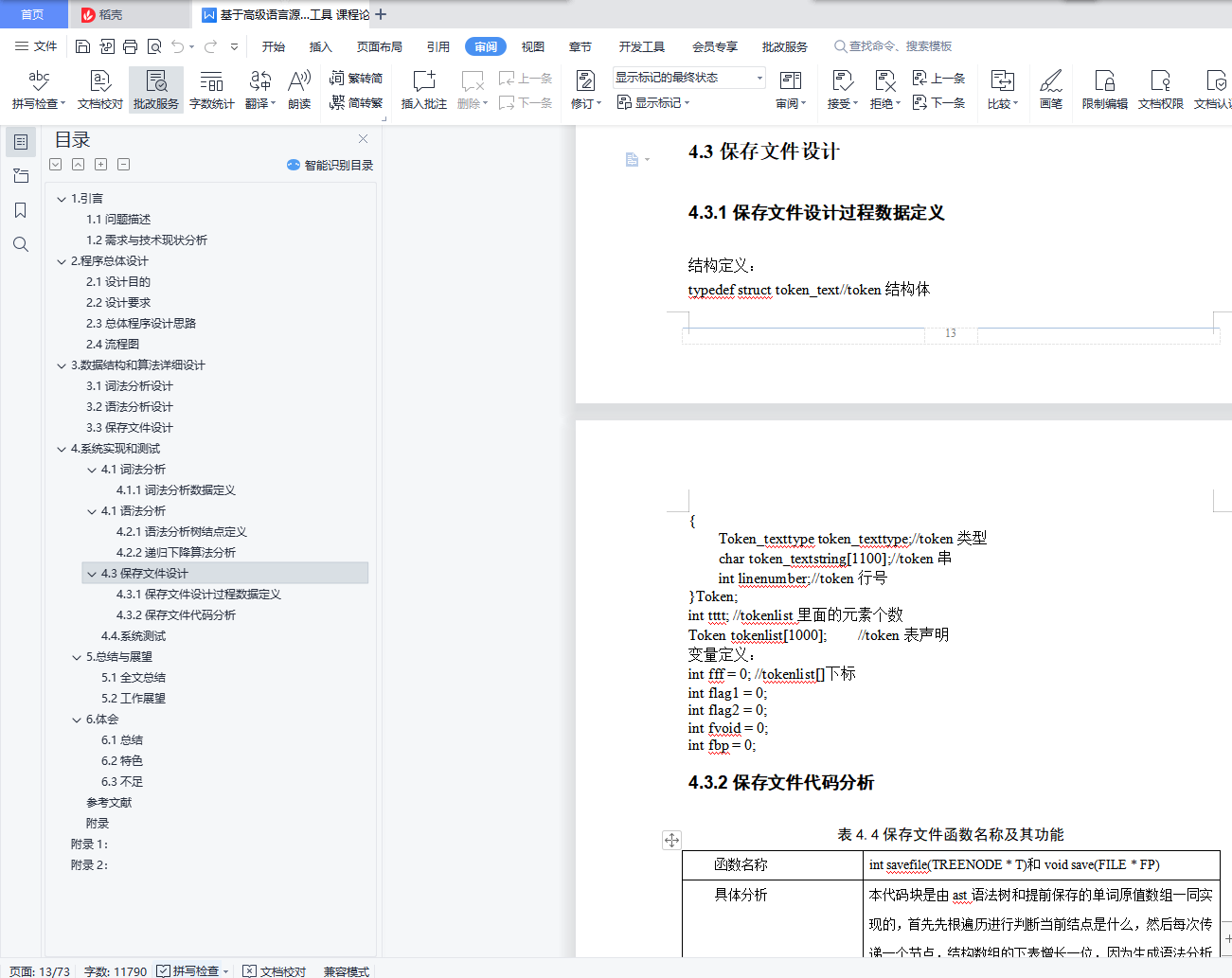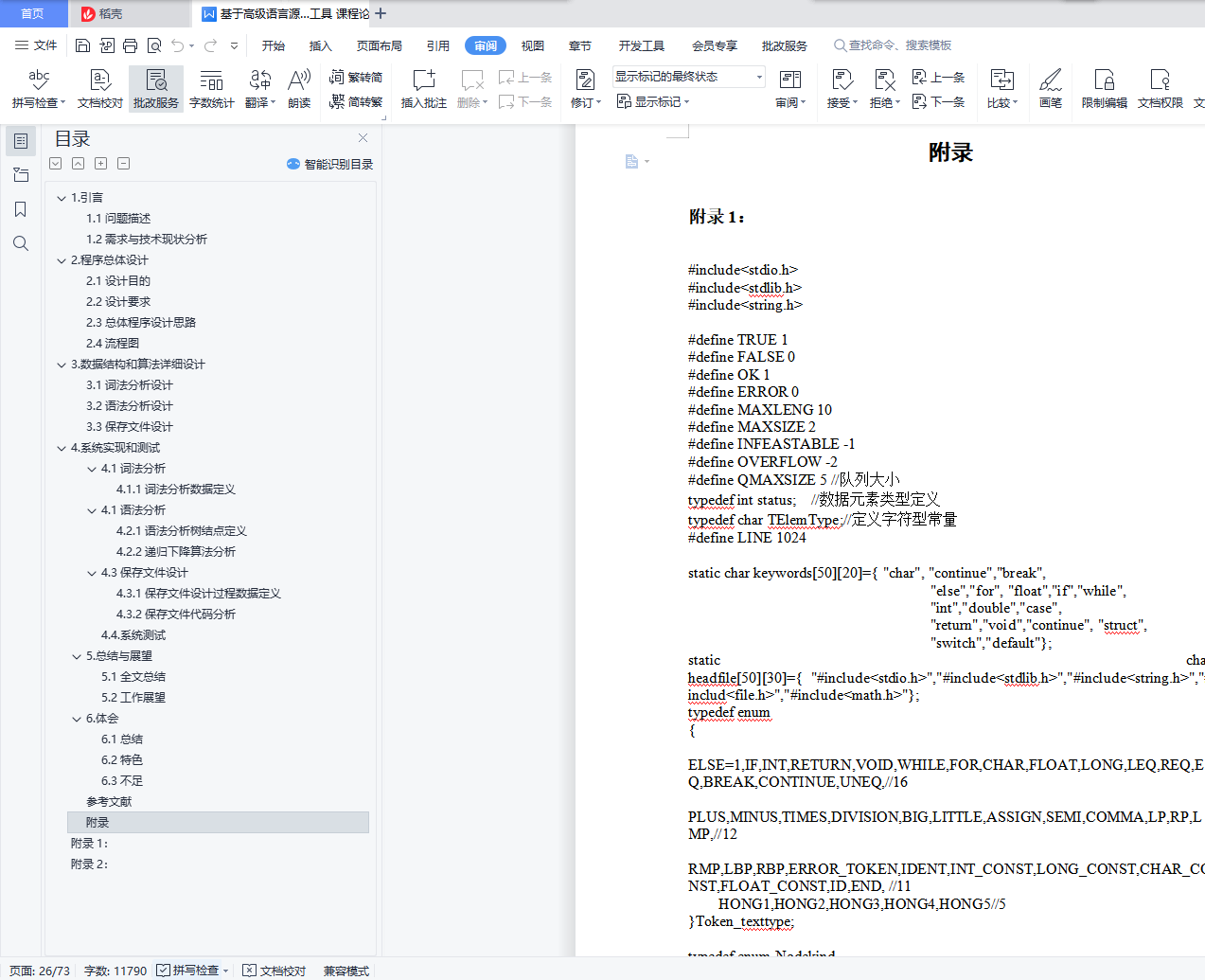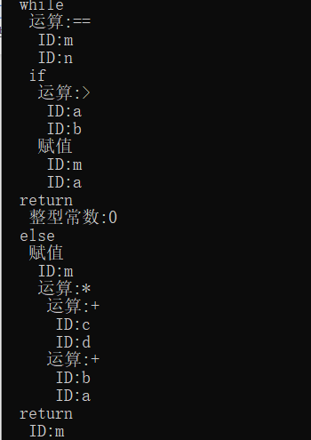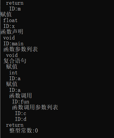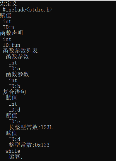 目录1.引言 21.1问题描述 21.2需求与技术现状分析 22.程序总体设计 32.1设计目的 32.2设计要求 32.3总体程序设计思路 42.4流程图 43.数据结构和算法详细设计 53.1词法分析设计 53.2语法分析设计 73.3保存文件设计 74. 系统实现和测试 84.1词法分析 84.1语法分析 94.3保存文件设计 134.4.系统测试 145. 总结与展望 235.1全文总结 235.2工作展望 236.体会 246.1总结 246.2特色 246.3不足 25参考文献 25附录 26附录1: 26附录2: 701.引言1.1问题描述抽象语法树(abstract syntax code, AST) 是源代码的抽象语法结构的树状表示,树上的每个节点都表示源代码中的一种结构, 这所以说是抽象的,是因为抽象语法树并不会表示出真实语法出现的每一个细节, 比如说,嵌套括号被隐含在树的结构中,并没有以节点的形式呈现。抽象语法树并不依赖于源语言的语法,也就是说语法分析阶段所采用的上下文无文文法,因为在写文法时,经常会对文法进行等价的转换(消除左递归,回溯,二义性等) , 这样会给文法分析引入一些多余的成分,对后续阶段造成不利影响,甚至会使合个阶段变得混乱。因些,很多编译器经常要独立地构造语法分析树为前端,后端建立一个清晰的接口。1.2需求与技术现状分析抽象语法树(Abstract Syntax Tree ,AST)作为程序的一种中间表示形式,在程序分析等诸多领域有广泛的应用.利用抽象语法树可以方便地实现多种源程序处理工具,比如源程序浏览器、智能编辑器、语言翻译器等。通常是作为编译器或解释器的组件出现的,它的作用是进行语法检查、并构建由输入的单词组成的数据结构(一般是语法分析树、抽象语法树等层次化的数据结构)。语法分析器通常使用一个独立的词法分析器从输入字符流中分离出一个个的“单词”,并将单词流作为其输入。实际开发中,语法分析器可以手工编写,也可以使用工具(半)自动生成。个人通过对源程序的实现,发现各种编译器的中间表示就是语法分析树,AST,感觉本次实验的最终目的就是编译出来一个简单的语言编译器,所以我认为语法分析树目前的现状就是编译器的内部原理,现在实现的程序比较简单,词法识别和语法识别还不够全面,只能够识别比较简单的较为基本的源程序。