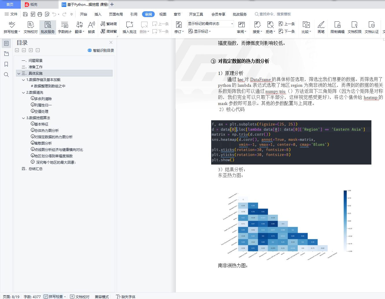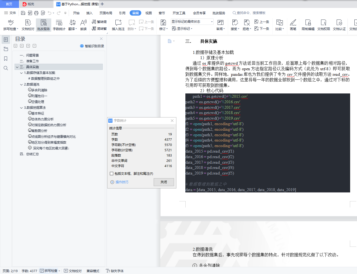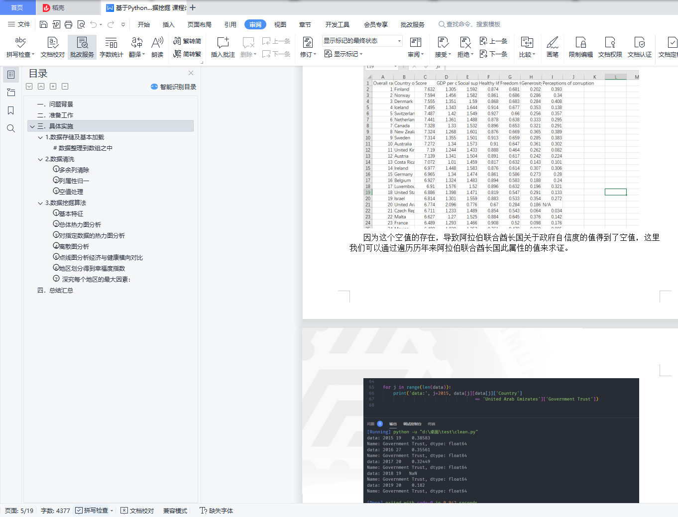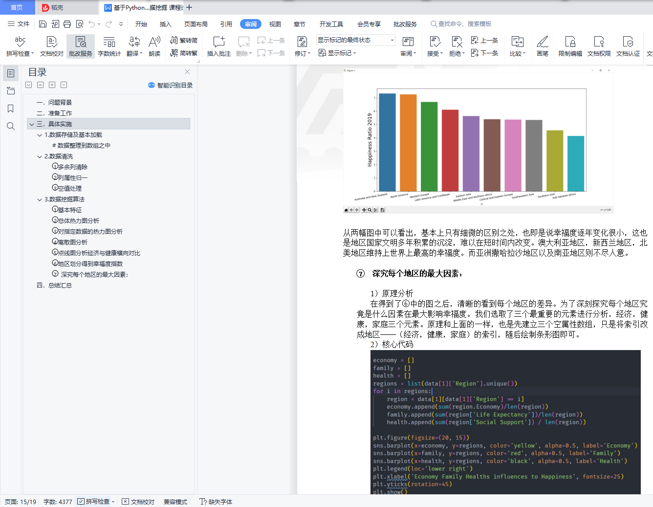 目录一. 问题背景 1二. 准备工作 2三. 具体实施 21.数据存储及基本加载 2# 数据整理到数组之中 22.数据清洗 2① 多余列清除 2② 列属性归一 3③ 空值处理 43.数据挖掘算法 6① 基本特征 6② 总体热力图分析 7③ 对指定数据的热力图分析 8④ 离散图分析 9⑤ 点线图分析经济与健康横向对比 10⑥ 地区划分得到幸福度指数 12⑦ 深究每个地区的最大因素: 15四. 总结汇总 16一.问题背景《世界幸福报告》是对全球幸福状况的一次里程碑式的调查。第一份报告于2012年发布,第二份于2013年发布,第三份于2015年发布,第四份报告于2016年更新。3月20日,在联合国举行的庆祝国际幸福日的活动上,根据155个国家的幸福水平,发布了《2017年世界幸福》。随着各国政府、组织和民间社会越来越多地使用幸福指数来指导其决策,该报告继续得到全球的认可。经济学、心理学、调查分析、国家统计、卫生、公共政策等领域的权威专家描述了如何有效地利用幸福感来评估国家的进步。这些报告回顾了当今世界的幸福状况,并展示了新的幸福科学如何解释个人和国家在幸福方面的差异。二.准备工作小组选择的公开数据集为kaggle上的公开数据集Factors affecting happiness,即一个关于各个国家的幸福度的公开数据集,从2015-2019每一年都有一个数据集。列出了各个国家的幸福度指数,经济情况,健康,宗教信仰,家庭等。三.具体实施1.数据存储及基本加载1)原理分析通过os库提供的getcwd方法返回当前工作目录,后面跟上每个数据集的相对路径,得到每个数据集的路径。而为open方法指定路径以及编码方式(此处为utf-8)即可获取到数据集文件。同样地,pandas库也为我们提供了专为csv文件提供的读取方法read_csv。为了后续的方便整理和调用,这里将每一年的数据全部放到一个数组之中,通过对下标的引用即可获取到数据集。