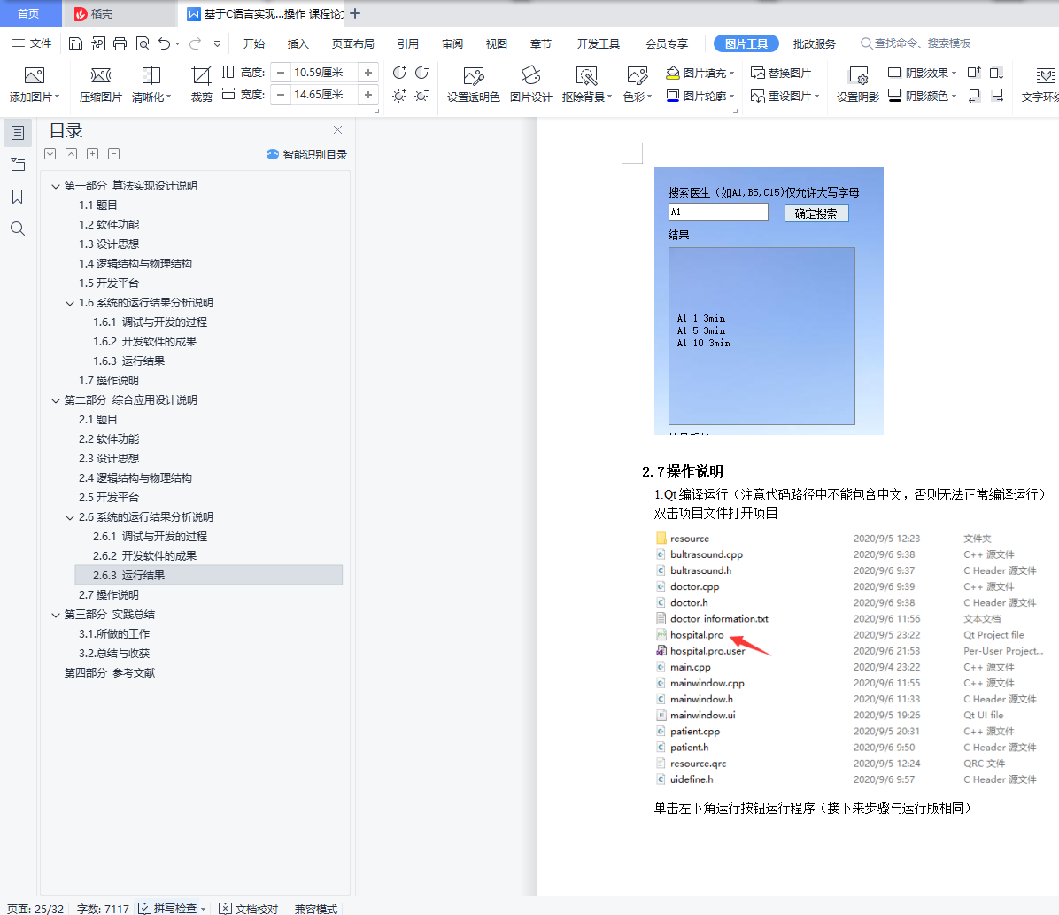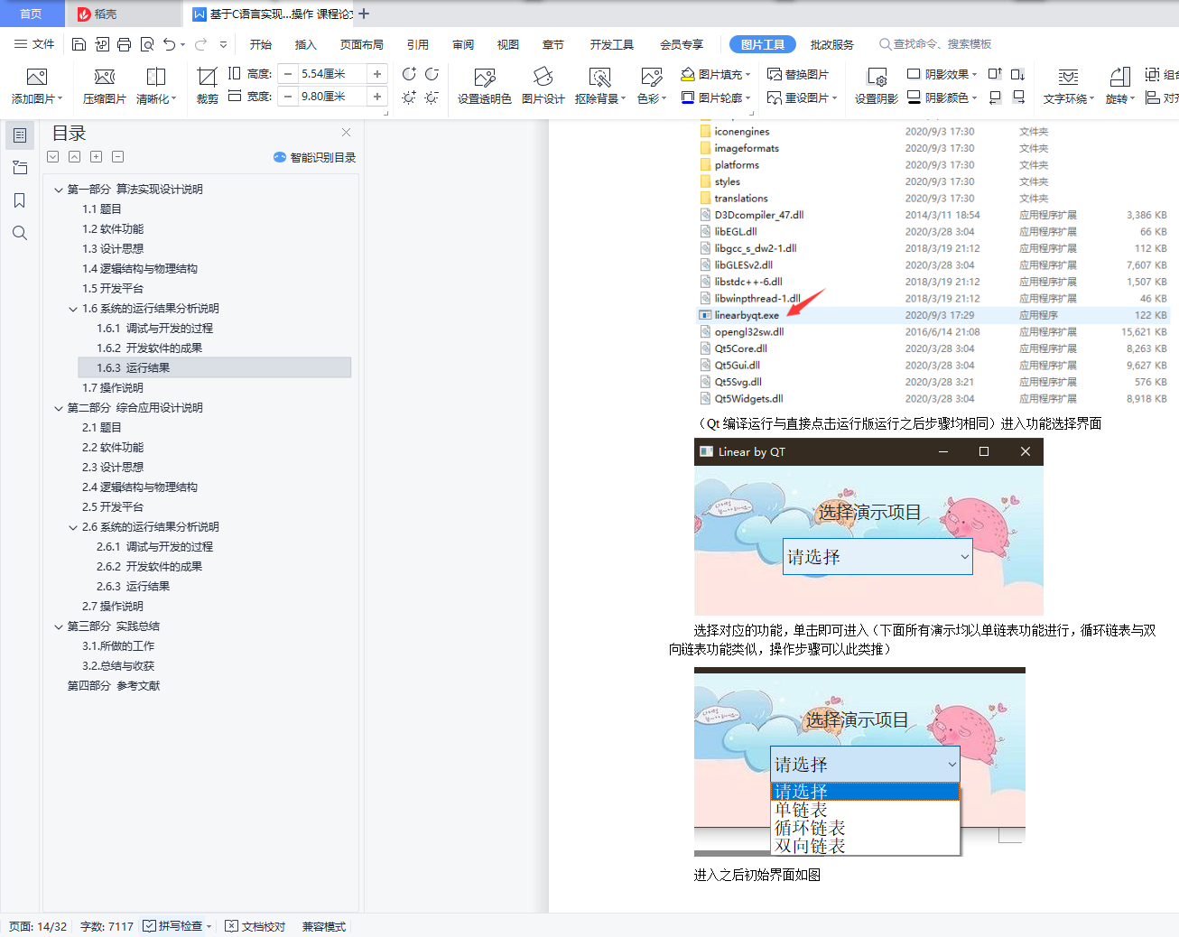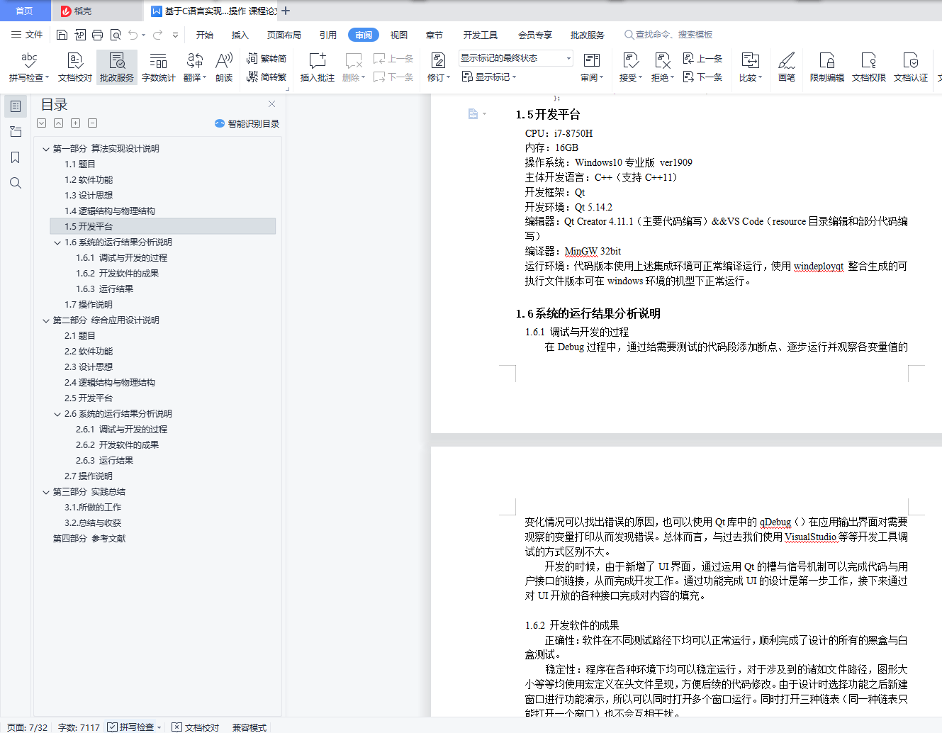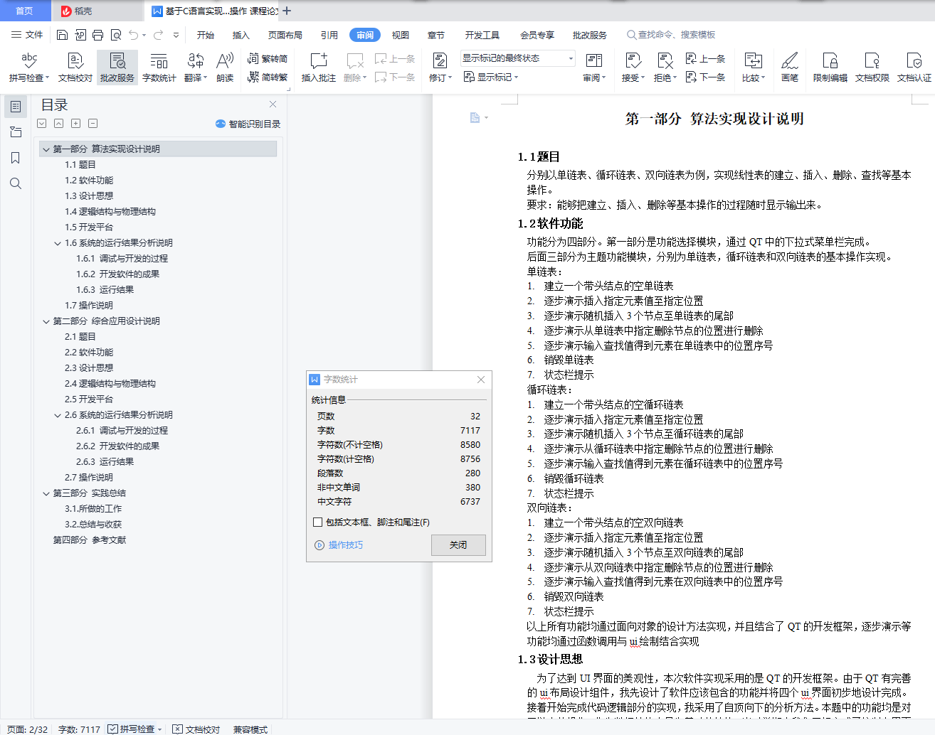目录目 录 1第一部分 算法实现设计说明 21.1题目 21.2软件功能 21.3设计思想 31.4逻辑结构与物理结构 41.5开发平台 81.6系统的运行结果分析说明 81.6.1 调试与开发的过程 81.6.2 开发软件的成果 91.6.3 运行结果 91.7操作说明 12第二部分 综合应用设计说明 202.1题目 202.2软件功能 202.3设计思想 202.4逻辑结构与物理结构 222.5开发平台 232.6系统的运行结果分析说明 232.6.1 调试与开发的过程 232.6.2 开发软件的成果 242.6.3 运行结果 242.7操作说明 26第三部分 实践总结 313.1.所做的工作 313.2.总结与收获 32第四部分 参考文献 32第一部分 算法实现设计说明1.1题目分别以单链表、循环链表、双向链表为例,实现线性表的建立、插入、删除、查找等基本操作。要求:能够把建立、插入、删除等基本操作的过程随时显示输出来。1.2软件功能功能分为四部分。第一部分是功能选择模块,通过QT中的下拉式菜单栏完成。后面三部分为主题功能模块,分别为单链表,循环链表和双向链表的基本操作实现。单链表:1.建立一个带头结点的空单链表2.逐步演示插入指定元素值至指定位置3.逐步演示随机插入3个节点至单链表的尾部4.逐步演示从单链表中指定删除节点的位置进行删除5.逐步演示输入查找值得到元素在单链表中的位置序号6.销毁单链表7.状态栏提示循环链表:1.建立一个带头结点的空循环链表2.逐步演示插入指定元素值至指定位置3.逐步演示随机插入3个节点至循环链表的尾部4.逐步演示从循环链表中指定删除节点的位置进行删除5.逐步演示输入查找值得到元素在循环链表中的位置序号6.销毁循环链表7.状态栏提示双向链表:1.建立一个带头结点的空双向链表2.逐步演示插入指定元素值至指定位置3.逐步演示随机插入3个节点至双向链表的尾部4.逐步演示从双向链表中指定删除节点的位置进行删除5.逐步演示输入查找值得到元素在双向链表中的位置序号6.销毁双向链表7.状态栏提示以上所有功能均通过面向对象的设计方法实现,并且结合了QT的开发框架,逐步演示等功能均通过函数调用与ui绘制结合实现1.3设计思想为了达到UI界面的美观性,本次软件实现采用的是QT的开发框架。由于QT有完善的ui布局设计组件,我先设计了软件应该包含的功能并将四个ui界面初步地设计完成。接着开始完成代码逻辑部分的实现,我采用了自顶向下的分析方法。本题中的功能均是对于链表的操作,作为数据结构中最为基础的结构,当时学期中我们已经完成了控制台界面的程序编写,因此我已经非常熟悉了。我需要做的就是在当时程序的基础上,实现ui界面的同步跳转与显示逻辑。第一部分的功能选择仅需要通过选择框即可实现,重点在后续的三个功能中。由于这三种结构实现的功能几乎一致,只需要完成其中一个,其他两个即可轻松完成。以单链表为例,单链表由各个节点组成,将节点提炼成一个节点类,通过对这些节点类的插入删除操作构成一个完整的单链表类。循环链表与双向链表稍作修改即可实现类似的功能。图形化显示链表需要通过画图的方式,分为节点本身的图形,箭头与箭头连接线几个部分,分块实现各自的功能函数即可。在代码编写的过程中,由于对代码结构理解的加深,需要对ui界面进行一些的微调从而最终完成软件的设计。