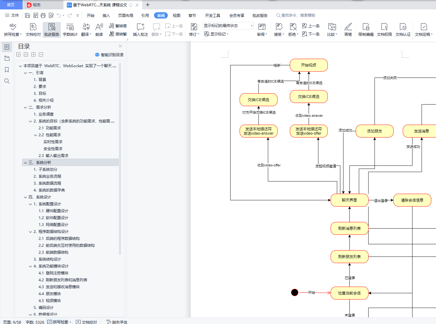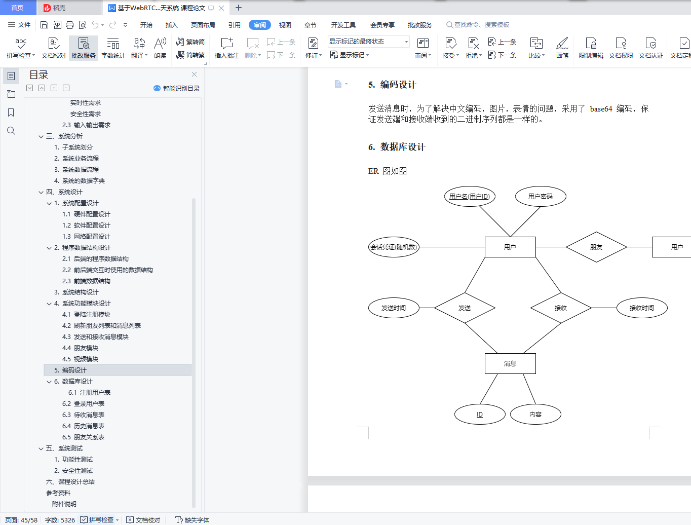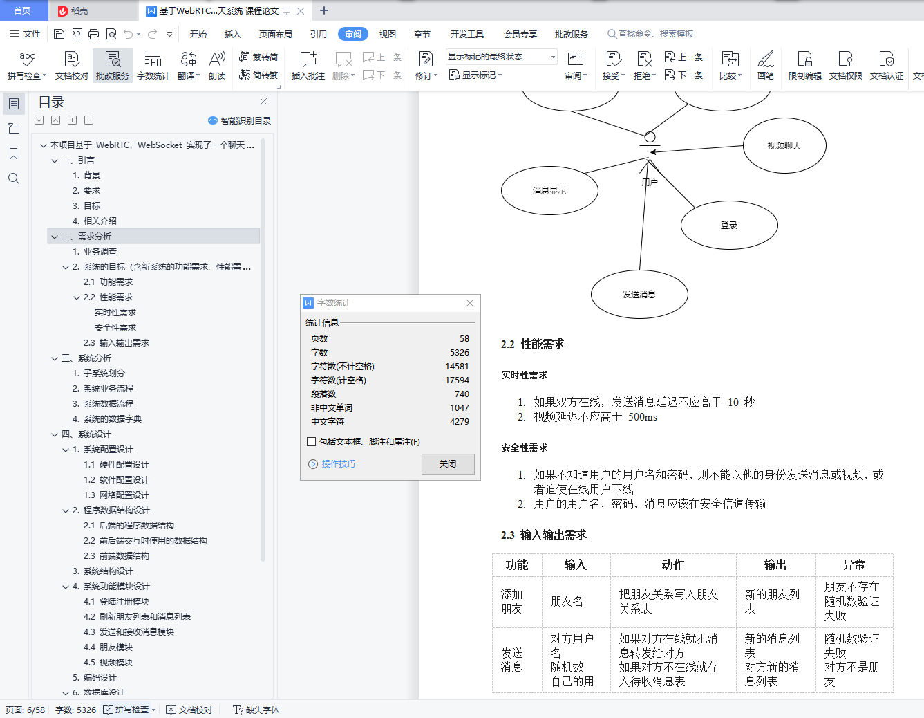本项目基于 WebRTC,WebSocket 实现了一个聊天系统目录本项目基于 WebRTC,WebSocket 实现了一个聊天系统 1一、引言 11. 背景 12. 要求 23. 目标 24. 相关介绍 2二、需求分析 41. 业务调查 52. 系统的目标(含新系统的功能需求、性能需求、输入输出需求) 5三、系统分析 61. 子系统划分 62. 系统业务流程 73. 系统数据流程 94. 系统的数据字典 12四、系统设计 121. 系统配置设计 122. 程序数据结构设计 163. 系统结构设计 264. 系统功能模块设计 275. 编码设计 446. 数据库设计 44五、系统测试 451. 功能性测试 452. 安全性测试 55六、课程设计总结 57参考资料 57附件说明 57一、引言1. 背景实时聊天愈加火爆,但是网页版的实时聊天不多,并且很少有支持视频聊天功能的。HTTPS 协议使得消息可以在安全信道传输。WebSocket 使得浏览器也可以建立持久连接,使得频繁发送和接收消息的成本降低。WebRTC 协议是 P2P 协议,使得在传输视频数据时降低了服务器的压力,视频聊天便于实现。2. 要求界面友好,可扩展性强,稳定性强,并且要有一定的安全性3. 目标传输协议基于 SSL,HTTP/1.1,WebSocket,WebRTC 实现了一个简易的支持视频聊天、表情、图片的实时消息系统。4. 相关介绍1.base642.用字符串代表二进制序列,4 个字节可以代表二进制序列三个字节。3.用字符 ABCDEFGHIJKLMNOPQRSTUVWXYZabcdefghijklmnopqrstuvwxyz0123456789+/ 代表 0~63 数字,如果二进制序列的字节数不是 3 的倍数,用 0 填充,base64 序列用=填充。4.本项目的消息使用 base64 编码传输。5.6.Http/1.17.即超文本传输协议-版本 1.1,允许发送流水线请求,并且相比 Http1.0 开销大大降低。8.9.WebSocket10.WebSocket 允许浏览器和服务器之间打开交互式通信会话(即持久化连接),而无需通过轮询服务器以获得响应。11.本项目聊天部分用到了 WebSocket。12.13.WebRTC14.WebRTC(Web Real-Time Communications)是一种实时通信技术,它允许网络应用或者站点,不通过任何第三方媒介建立 P2P 连接,用以传输音频,视频等其它任何数据,减少服务器压力。15.本项目视频聊天功能用到了 WebRTC。16.17.SDP18.SDP(Session Description Protocol)是一个描述 peer-to-peer 连接的标准,SDP 包含音视频的编解码,源地址,时间等信息。19.SDP 也是 WebRTC 的组件之一,用于描述一个会话。20.21.ICE22.ICE(Interactive Connectivity Establishment)是一个被 WebRTC 应用的框架,即使两端位于 NAT 后面,这个协议可以让两端互相找到对方并建立连接。23.ICE 使用以下算法寻找最低等待时间路径去连接两端,通常为以下顺序24.1.直接 UDP 连接2.直接 TCP 连接(HTTP)3.直接 TCP 连接(HTTPS)4.间接通过中继器连接(存在位于防火墙后面的一方,无法进行 NAT 穿越)25.信令服务器26.WebRTC 中交换视频请求和响应,交换 ICE 候选时用的服务器。服务器收到视频相关消息只是简单地转发它们,为两端建立连接提供信息。27.28.STUN 服务器29.通过 STUN 服务器,客户终端可以发现他们的 IP 地址,以及 NAT 相关信息,为 NAT 穿越提供信息。