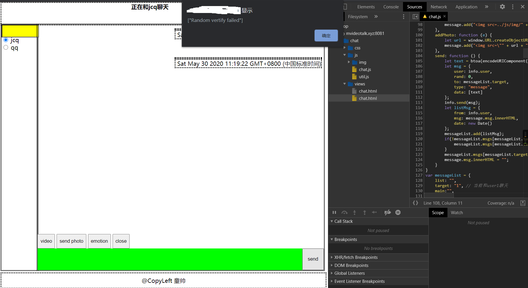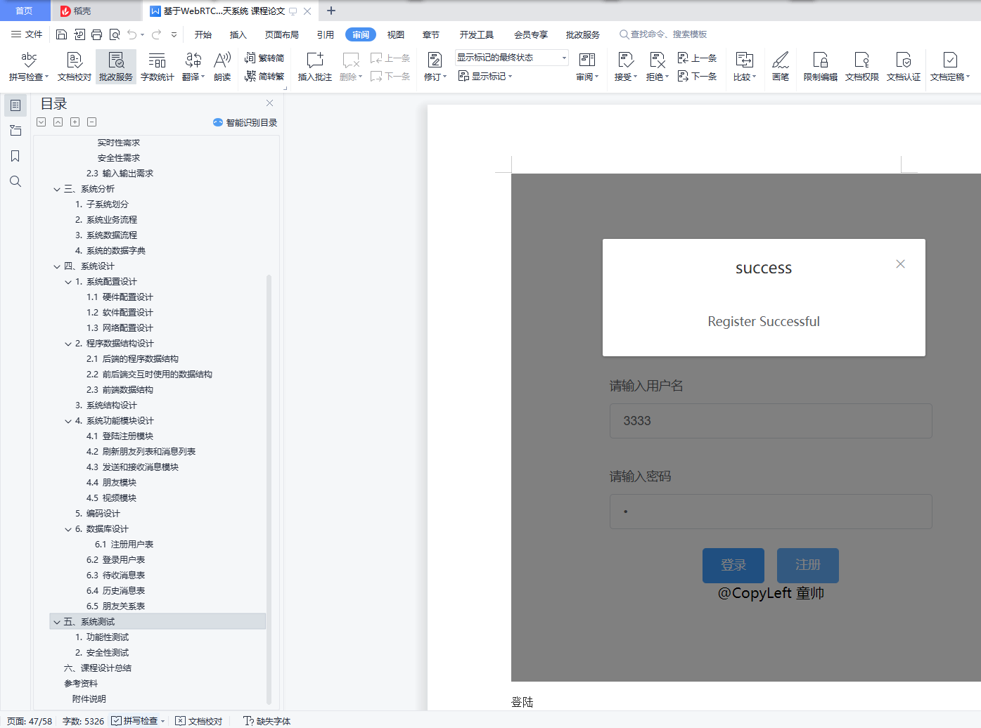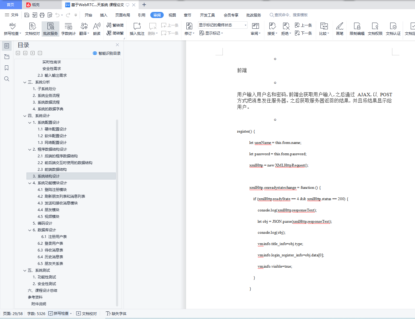 本项目基于 WebRTC,WebSocket 实现了一个聊天系统目录本项目基于 WebRTC,WebSocket 实现了一个聊天系统 1一、引言 11. 背景 12. 要求 23. 目标 24. 相关介绍 2二、需求分析 41. 业务调查 52. 系统的目标(含新系统的功能需求、性能需求、输入输出需求) 5三、系统分析 61. 子系统划分 62. 系统业务流程 73. 系统数据流程 94. 系统的数据字典 12四、系统设计 121. 系统配置设计 122. 程序数据结构设计 163. 系统结构设计 264. 系统功能模块设计 275. 编码设计 446. 数据库设计 44五、系统测试 451. 功能性测试 452. 安全性测试 55六、课程设计总结 57参考资料 57附件说明 57一、引言1. 背景实时聊天愈加火爆,但是网页版的实时聊天不多,并且很少有支持视频聊天功能的。HTTPS 协议使得消息可以在安全信道传输。WebSocket 使得浏览器也可以建立持久连接,使得频繁发送和接收消息的成本降低。WebRTC 协议是 P2P 协议,使得在传输视频数据时降低了服务器的压力,视频聊天便于实现。2. 要求界面友好,可扩展性强,稳定性强,并且要有一定的安全性3. 目标传输协议基于 SSL,HTTP/1.1,WebSocket,WebRTC 实现了一个简易的支持视频聊天、表情、图片的实时消息系统。4. 相关介绍1.base642.用字符串代表二进制序列,4 个字节可以代表二进制序列三个字节。3.用字符 ABCDEFGHIJKLMNOPQRSTUVWXYZabcdefghijklmnopqrstuvwxyz0123456789+/ 代表 0~63 数字,如果二进制序列的字节数不是 3 的倍数,用 0 填充,base64 序列用=填充。4.本项目的消息使用 base64 编码传输。5.6.Http/1.17.即超文本传输协议-版本 1.1,允许发送流水线请求,并且相比 Http1.0 开销大大降低。8.9.WebSocket10.WebSocket 允许浏览器和服务器之间打开交互式通信会话(即持久化连接),而无需通过轮询服务器以获得响应。11.本项目聊天部分用到了 WebSocket。12.13.WebRTC14.WebRTC(Web Real-Time Communications)是一种实时通信技术,它允许网络应用或者站点,不通过任何第三方媒介建立 P2P 连接,用以传输音频,视频等其它任何数据,减少服务器压力。15.本项目视频聊天功能用到了 WebRTC。16.17.SDP18.SDP(Session Description Protocol)是一个描述 peer-to-peer 连接的标准,SDP 包含音视频的编解码,源地址,时间等信息。19.SDP 也是 WebRTC 的组件之一,用于描述一个会话。20.21.ICE22.ICE(Interactive Connectivity Establishment)是一个被 WebRTC 应用的框架,即使两端位于 NAT 后面,这个协议可以让两端互相找到对方并建立连接。23.ICE 使用以下算法寻找最低等待时间路径去连接两端,通常为以下顺序24.1.直接 UDP 连接2.直接 TCP 连接(HTTP)3.直接 TCP 连接(HTTPS)4.间接通过中继器连接(存在位于防火墙后面的一方,无法进行 NAT 穿越)25.信令服务器26.WebRTC 中交换视频请求和响应,交换 ICE 候选时用的服务器。服务器收到视频相关消息只是简单地转发它们,为两端建立连接提供信息。27.28.STUN 服务器29.通过 STUN 服务器,客户终端可以发现他们的 IP 地址,以及 NAT 相关信息,为 NAT 穿越提供信息。