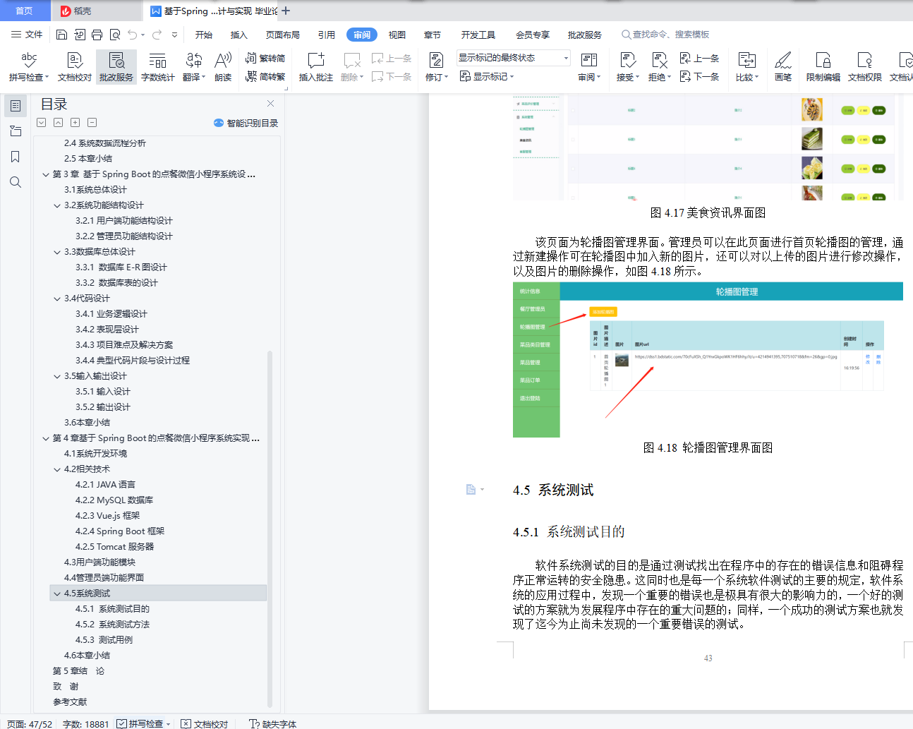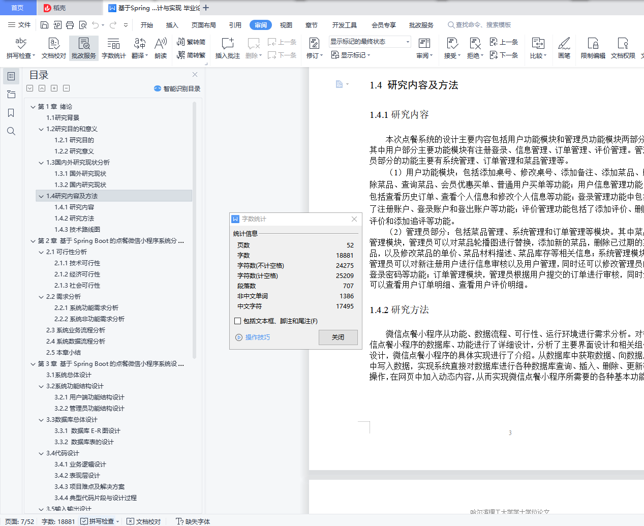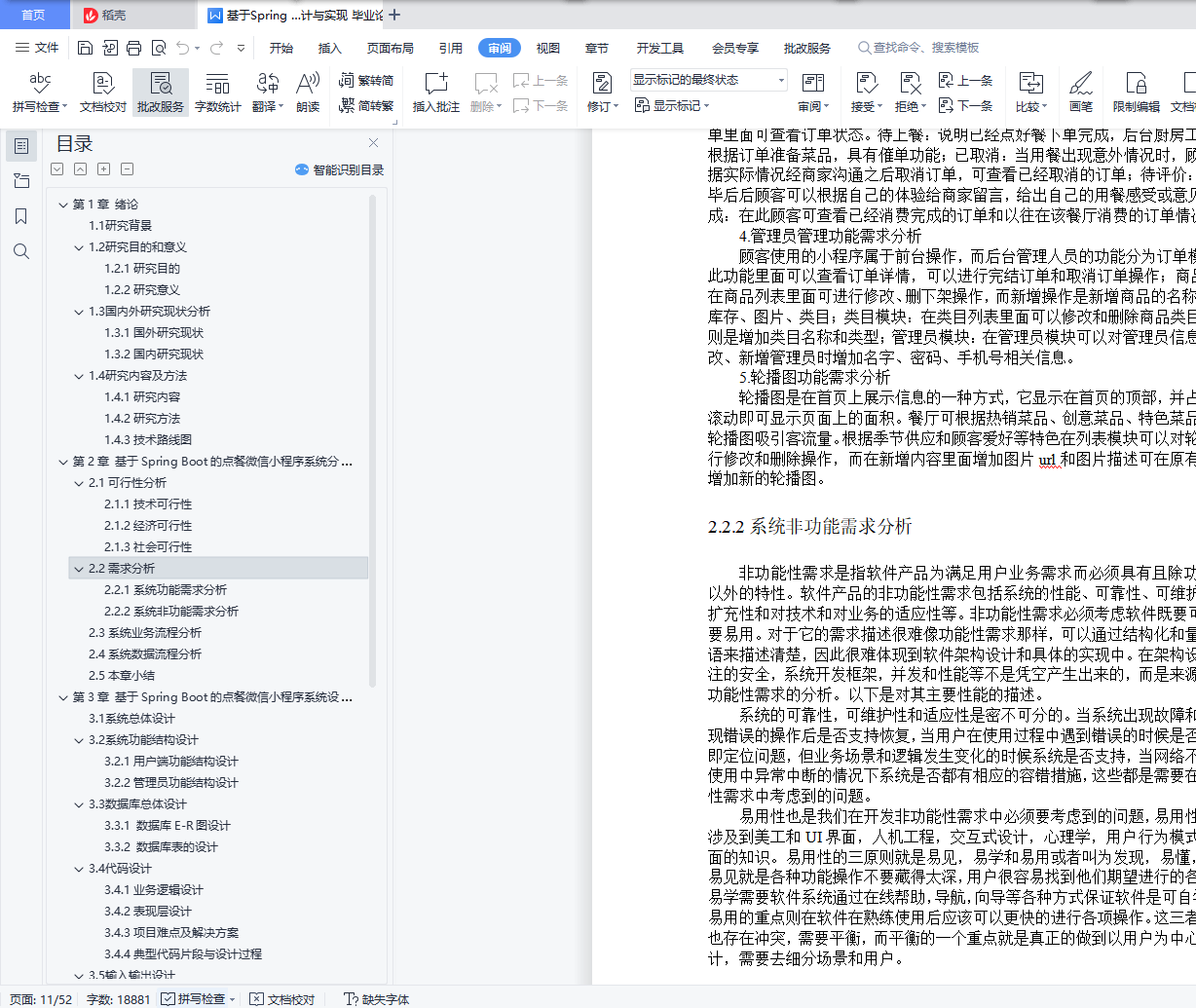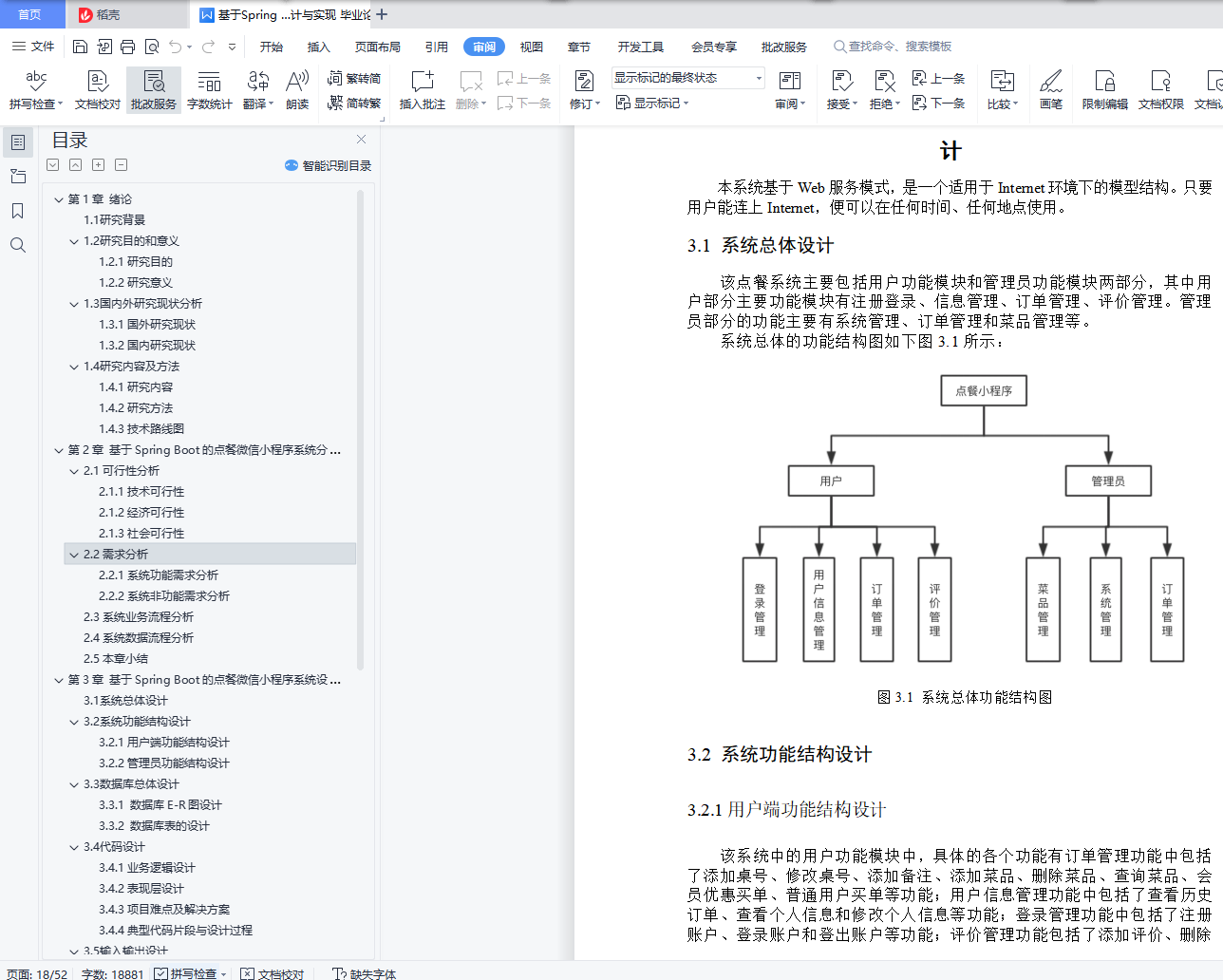 基于Spring Boot的点餐微信小程序设计与实现摘 要近年来,国民收入的提高各个行业都得到了长足发展,其中也带动着互联网行业飞速发展,许多传统行业开始与互联网结合并通过数字化的改造、转型与升级创造出新的发展生态。尤其在国人最关注的“吃”的方面,餐饮行业通过将点餐、结算等一系列的服务流程从线下搬运到线上,使得顾客使用移动设备即可享受到更加个性化的服务。大量的需求是技术发展创新的动力,互联网和计算机技术在微信小程序上的结合使用让传统复杂的点餐程序更加方便快捷。本次课题则是针对就餐高峰期人员拥堵,传统人工处理就餐流程效率低下等问题,设计实现了微信点餐小程序。该小程序采用Spring Boot框架,使用微信开发工具等技术,而后台使用MySQL数据库技术统一管理数据。该小程序的使用能在一定程度上缓解用户就餐效率低、高峰期用餐拥堵等问题。结合商家和消费者的需求设计以低成本高效率为原则,设计一个餐饮公司微信点餐小程序系统能够效地提高餐饮业的工作效率以及规范服务体系,提高整体服务质量和管理水平,并为规模化经营提供坚实的技术基础。关键词 点餐系统;微信小程序;数据库;Spring Boot框架Design and implementation of ordering wechat small program based on Spring BootAbstractIn recent years, the improvement of national income has made great progress, which has also led to the rapid development of the Internet industry. Many traditional industries have begun to combine with the Internet and create a new development ecology through digital transformation, transformation and upgrading.Especially in the aspect of "eating", which Chinese people are most concerned about, the catering industry can move a series of service processes from offline to online, so that customers can enjoy more personalized services by using mobile devices, ranging from offline to online.A large number of demands are the driving force for technological development and innovation. The combination of Internet and computer technology in wechat small programs makes the traditional and complex ordering programs more convenient and fast.This topic is aimed at the personnel congestion during the peak hour of meals, the traditional manual processing of the low efficiency of the dining process.The small program uses Spring Boot framework, uses wechat development tools and other technologies, while the background uses MySQL database technology to manage data uniformly.The use of this small program can partly alleviate the problems such as low dining efficiency and meal congestion in peak hours.Combined with the needs of businesses and consumers to design on the principle of low cost and high efficiency, design a catering company wechat ordering small program system can effectively improve the work efficiency of the catering industry and standardize the service system, improve the overall service quality and management level, and provide a solid technical foundation for large-scale operation.Keywords Ordering system; WeChat mini program; Database; Spring Boot framework目 录第1章 绪论 11.1 研究背景 11.2 研究目的和意义 11.2.1研究目的 11.2.2研究意义 11.3 国内外研究现状分析 21.3.1国外研究现状 21.3.2国内研究现状 21.4 研究内容及方法 31.4.1研究内容 31.4.2研究方法 31.4.3技术路线图 4第2章 基于Spring Boot的点餐微信小程序系统分析 52.1可行性分析 52.1.1技术可行性 52.1.2经济可行性 62.1.3社会可行性 62.2需求分析 62.2.1系统功能需求分析 62.2.2系统非功能需求分析 72.3系统业务流程分析 82.4系统数据流程分析 102.5本章小结 13第3章 基于Spring Boot的点餐微信小程序系统设计 143.1 系统总体设计 143.2 系统功能结构设计 143.2.1用户端功能结构设计 143.2.2管理员功能结构设计 173.3 数据库总体设计 203.3.1 数据库E-R图设计 203.3.2 数据库表的设计 213.4 代码设计 233.4.1业务逻辑设计 233.4.2表现层设计 233.4.3项目难点及解决方案 233.4.4典型代码片段与设计过程 233.5 输入输出设计 263.5.1输入设计 263.5.2输出设计 263.6 本章小结 26第4章 基于Spring Boot的点餐微信小程序系统实现与测试 274.1 系统开发环境 274.2 相关技术 274.2.1 JAVA语言 274.2.2 MySQL数据库 284.2.3 Vue.js框架 284.2.4 Spring Boot框架 294.2.5 Tomcat服务器 294.3 用户端功能模块 294.4 管理员端功能界面 394.5 系统测试 434.5.1 系统测试目的 434.5.2 系统测试方法 444.5.3 测试用例 444.6 本章小结 44第5章 结 论 46致 谢 47参考文献 48