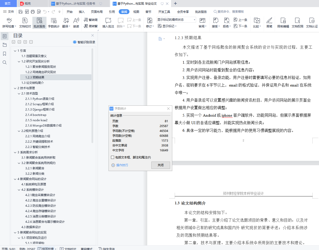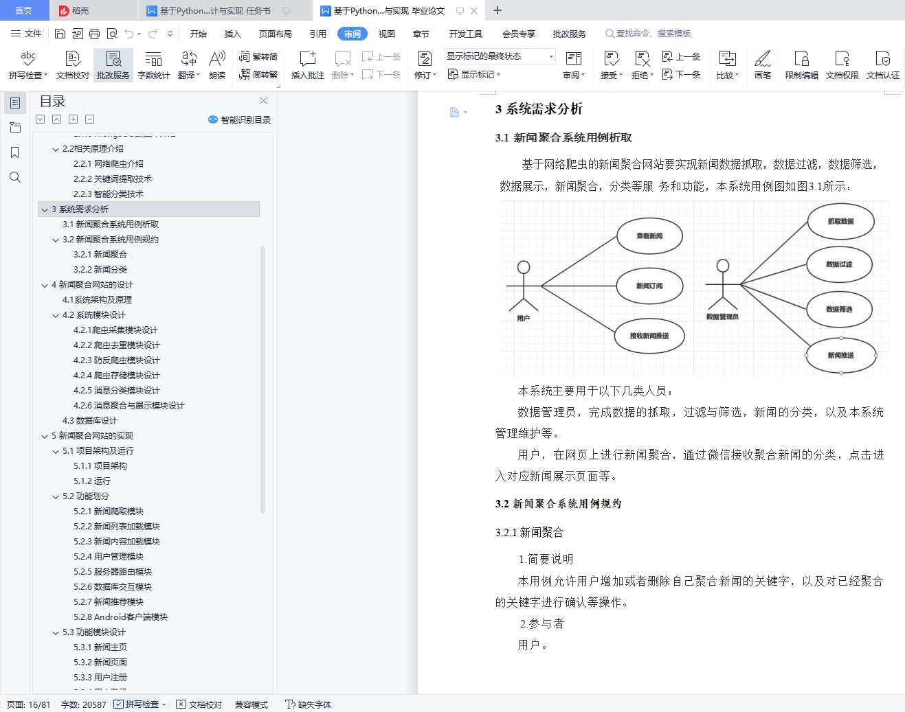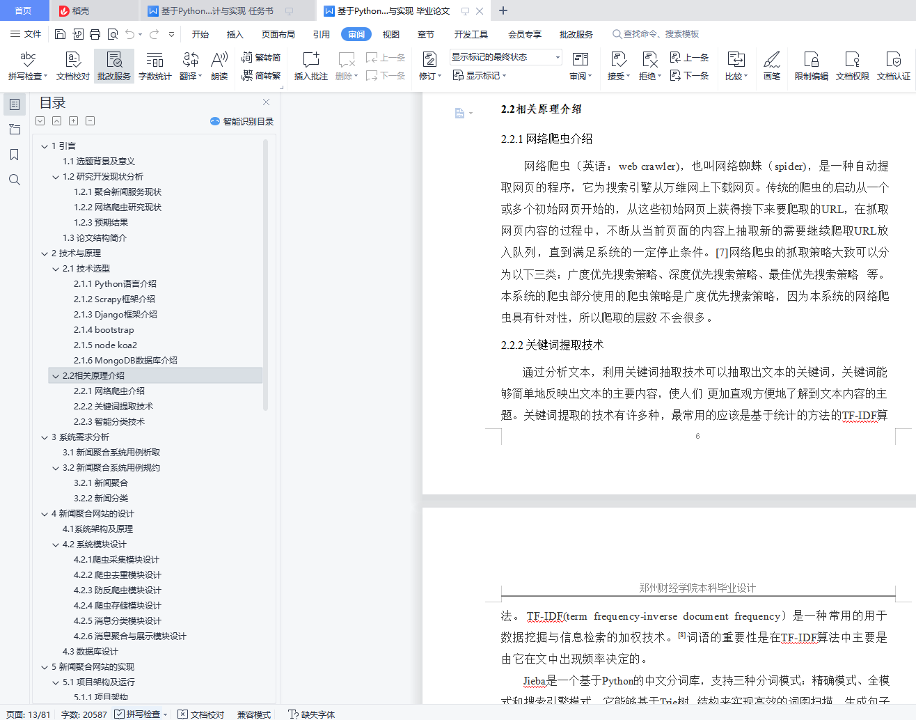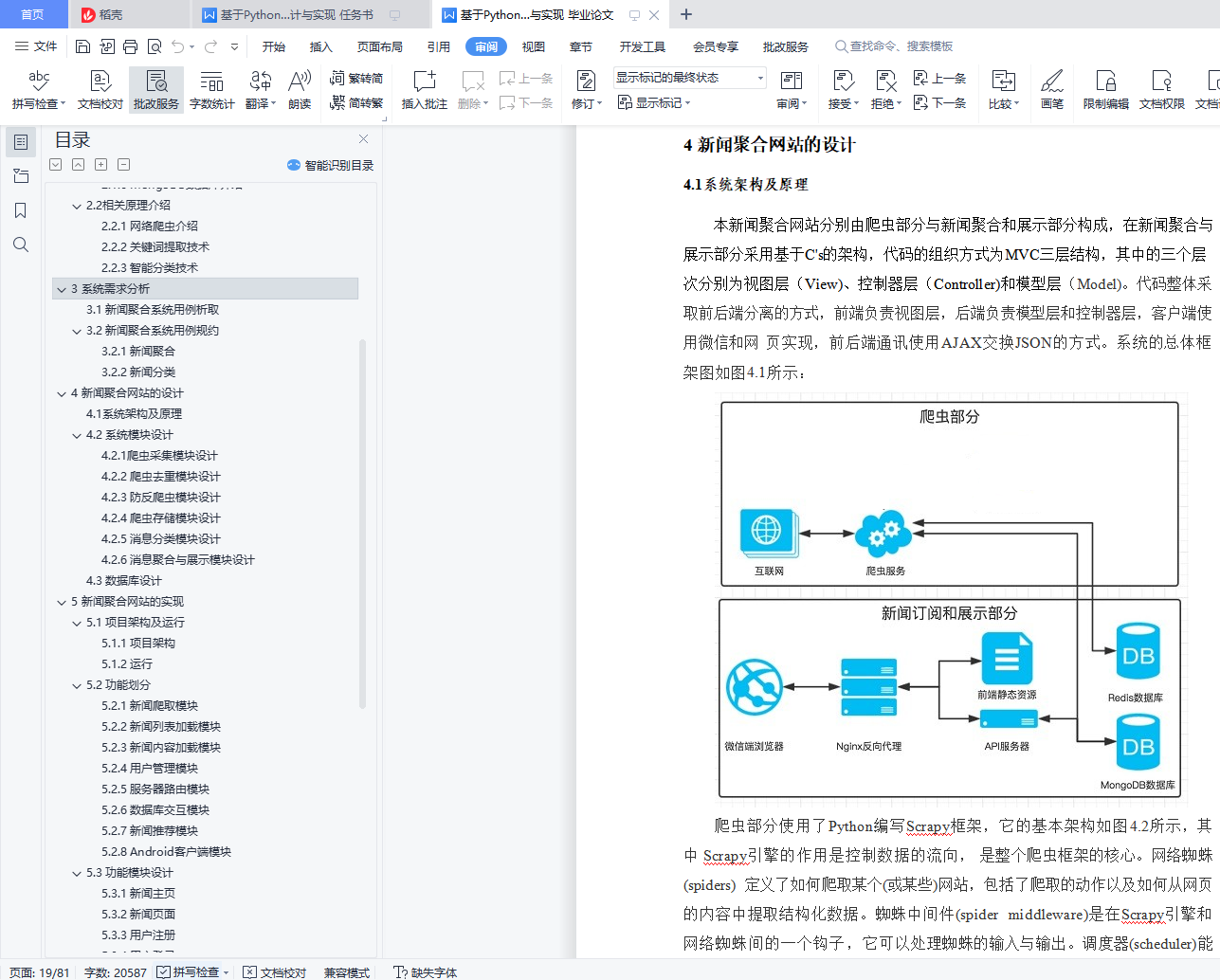 基于Python的新闻聚合网站设计与实现摘 要:本论文研究内容是基于Python的爬虫网络设计,利用Python的Scrapy的框架搭建爬虫网络,并设计一个全新的新闻网站,网站实现对新闻数据的分类,以及用户对新闻的分享、评论等,且本论题设计网页实现对新闻数据的可视化,让人们在面对海量新闻数据时不再花费更多的时间来获取有效的有价值的新闻信息。本系统利用网络爬虫我们可以做到对网络上的新闻网站进行定时定向的分析和采集,然后把采集到的数据进行去重,分类等操作后存入数据库,最后提供聚合的新闻聚合服务。考虑了如何应对网站的反爬虫策略,避免被网站封锁爬虫。具体实现新闻聚合网站技术,前端采用bootstrap,后端采用node koa2,数据库使用monogodb, 并可以通过浏览器或者android APP打开该网页。关键词:Python;爬虫;聚合新闻;新闻爬虫;可视化Design and implementation of the news aggregation website based on PythonAbstract: This paper research content is based on Python crawler network design, using the framework of Python Scrapy to build crawler network, and design a new news website, website to realize the classification of news data, and users to share news, comment, and this topic design web page to realize the visualization of news data, so that people in the face of massive news data no longer spend more time to obtain effective valuable news information.This system uses the network crawler. We can do regularly targeted analysis and collection of news websites on the network, and then replay the collected data, classify and other operations into the database, and finally provide personalized news subscription service.Consider how to deal with the website's anti-crawler strategy to avoid being blocked by the website crawler.Specifically, the news aggregation website technology adopts bootstrap at the front end, the back end uses node koa2, the database uses monogodb, and the web page can be opened through the browser or android APP.Key words: Python; crawler; aggregated news; news crawler; visualization目 录摘 要 IAbstract II1 引言 11.1 选题背景及意义 11.2 研究开发现状分析 11.2.1 聚合新闻服务现状 11.2.2 网络爬虫研究现状 21.2.3 预期结果 21.3 论文结构简介 22 技术与原理 42.1 技术选型 42.1.1 Python语言介绍 42.1.2 Scrapy框架介绍 42.1.3 Django框架介绍 42.1.4 bootstrap 52.1.5 node koa2 52.1.6 MongoDB数据库介绍 62.2相关原理介绍 62.2.1 网络爬虫介绍 62.2.2 关键词提取技术 62.2.3 智能分类技术 73 系统需求分析 93.1 新闻聚合系统用例析取 93.2 新闻聚合系统用例规约 93.2.1 新闻聚合 93.2.2 新闻分类 104 新闻聚合网站的设计 124.1系统架构及原理 124.2 系统模块设计 134.2.1爬虫采集模块设计 134.2.2 爬虫去重模块设计 144.2.3 防反爬虫模块设计 154.2.4 爬虫存储模块设计 154.2.5 消息分类模块设计 164.2.6 消息聚合与展示模块设计 164.3 数据库设计 165 新闻聚合网站的实现 185.1 项目架构及运行 185.1.1 项目架构 185.1.2 运行 185.2 功能划分 185.2.1 新闻爬取模块 185.2.2 新闻列表加载模块 195.2.3 新闻内容加载模块 195.2.4 用户管理模块 195.2.5 服务器路由模块 195.2.6 数据库交互模块 195.2.7 新闻推荐模块 205.2.8 Android客户端模块 205.3 功能模块设计 205.3.1 新闻主页 205.3.2 新闻页面 225.3.3 用户注册 235.3.4 用户登录 255.3.5 用户修改信息 265.3.6 用户个人主页 275.3.7 新闻个性推荐 285.3.8 移动端新闻推送 296 系统部署 306.1 部署机器概述 306.2 配置环境 306.3 系统运行 307 结论 31参考文献 32致 谢 34附录:代码架构及实现 351工程代码架构 352新闻爬取模块 351)相应主题对应新闻页面链接的爬取 352)新闻页面内容的爬取(主要是凤凰新闻网) 373)python连接mongodb数据库 403导航栏实现 414 新闻列表的加载 435 新闻内容页面的显示 526 用户注册 577 用户登录 618 新闻推荐模块 63