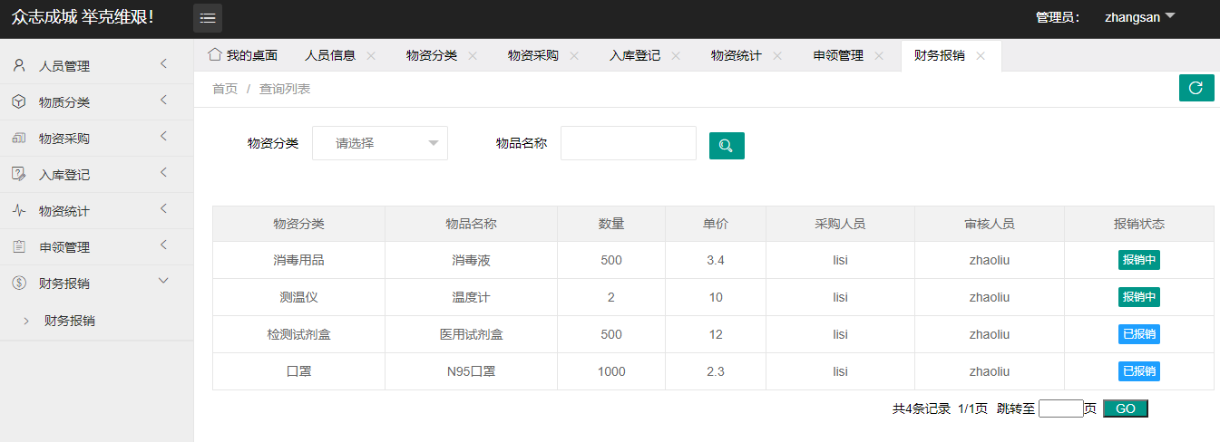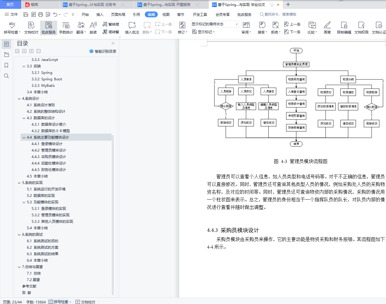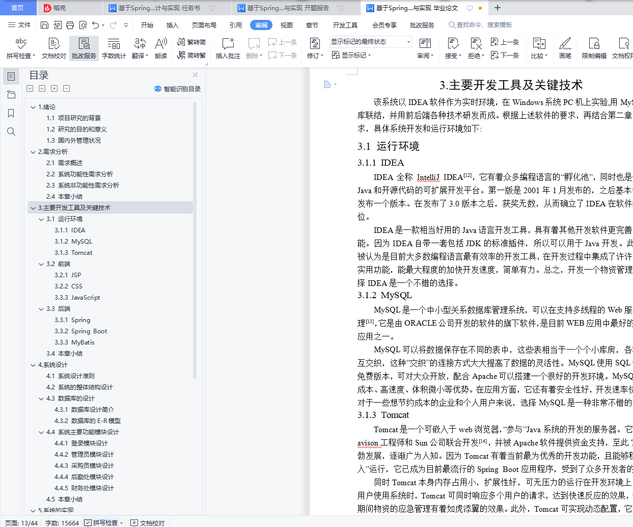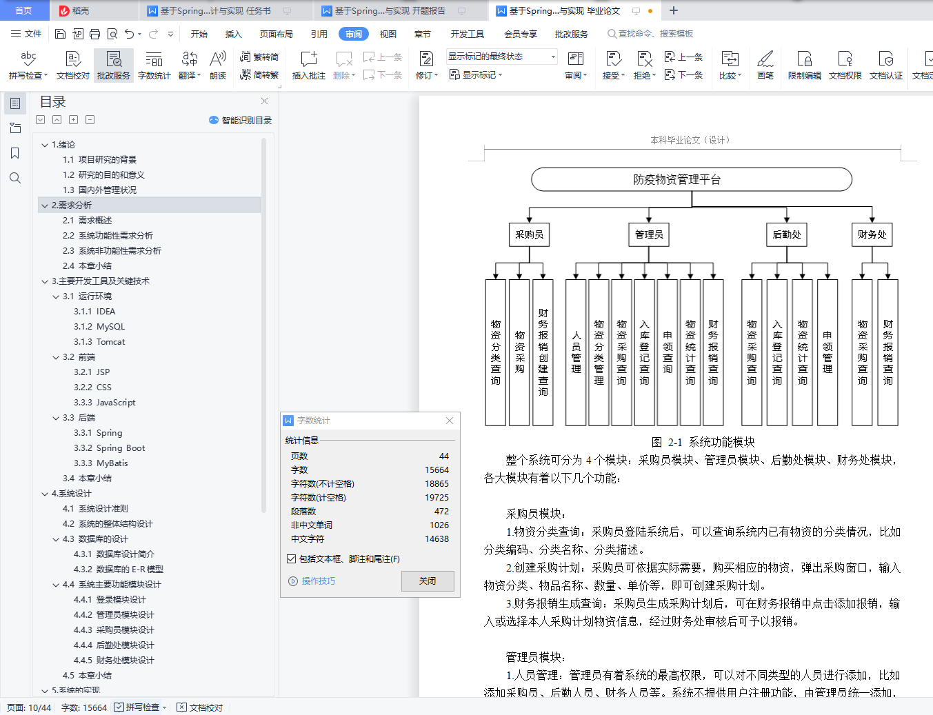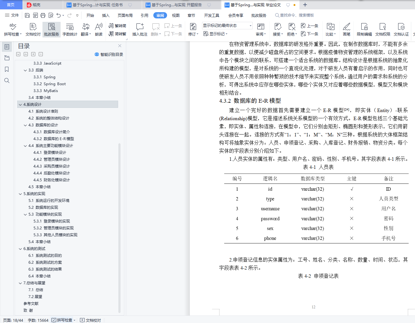 摘 要物资的运营及分配是每一个可持续化发展区域的必备要素。例如医院,它每天都需要准备额外的物品,以此来弥补应急状态下物资短缺的情况。尤其是在新冠疫情背景下国家的“封城”处理,更加需要时时刻刻跟进防疫设备的使用量,以保证医院内防疫物资的管理。目前大部分医院采用传统的人工记账的方式进行物资管理,这种手写登记入库会出现物资记录不精确、人员分配混乱等问题。此种迹象说明目前的防疫物资管理的需要一定的改善,研发一个能解决当前物资管理问题的线上系统尤为重要。利用互联网技术的非接触性和便携性,本文基于Spring Boot的框架,构建一个一体化、系统化、线上线下相结合的防疫物资管理系统,提高医院在面临重大突发疫情时物资管理的运营效率和应对能力,以筑牢抗疫的防线。关键词:防疫管理;防疫物资;物资管理;管理平台;Spring BootAbstractThe operation and distribution of materials are the essential elements for every sustainable development area.Hospitals, for example, need to prepare extra items every day to make up for material shortages in emergency situations.Especially in the context of COVID-19, the "lockdown", it is necessary to follow up the use of epidemic prevention equipment all the time to ensure the management of epidemic prevention materials in hospitals.At present, most hospitals use the traditional manual bookkeeping method for material management, such handwritten registration and warehousing will appear inaccurate material records, chaotic personnel allocation and other problems.Such signs indicate that the current management of epidemic prevention materials needs to be improved, and it is particularly important to develop an online system that can solve the current material management problems.Using the non-contact and portability of Internet technology, this paper builds an integrated, systematic and combined online and offline epidemic prevention materials management system based on the framework of Spring Boot, so as to improve the operation efficiency and response capacity of hospital material management in the face of major emergencies, so as to build a strong defense line against the epidemic.Key words: epidemic prevention management; epidemic prevention materials; material management; management platform; Spring Boot目 录1.绪论 11.1 项目研究的背景 11.2 研究的目的和意义 11.3 国内外管理状况 12.需求分析 32.1 需求概述 32.2 系统功能性需求分析 32.3 系统非功能性需求分析 52.4 本章小结 63.主要开发工具及关键技术 73.1 运行环境 73.1.1 IDEA 73.1.2 MySQL 73.1.3 Tomcat 73.2 前端 83.2.1 JSP 83.2.2 CSS 83.3.3 JavaScript 83.3 后端 93.3.1 Spring 93.3.2 Spring Boot 93.3.3 MyBatis 93.4 本章小结 94.系统设计 104.1 系统设计准则 104.2 系统的整体结构设计 104.3 数据库的设计 114.3.1 数据库设计简介 114.3.2 数据库的E-R模型 124.4 系统主要功能模块设计 154.4.1 登录模块设计 154.4.2 管理员模块设计 164.4.3 采购员模块设计 174.4.4 后勤处模块设计 184.4.5 财务处模块设计 194.5 本章小结 205.系统的实现 215.1 系统运行的开发环境 215.2 数据库的实现 215.3 功能模块的实现 245.3.1 登录模块的实现 245.3.2 管理员模块的实现 255.3.3 其他人员模块的实现 315.4 本章小结 326.系统的测试 336.1 系统测试的目的 336.2 系统测试的方案 336.3 系统测试的结果 346.4 本章小结 347.总结与展望 357.1 总结 357.2展望 35参考文献 36致 谢 38