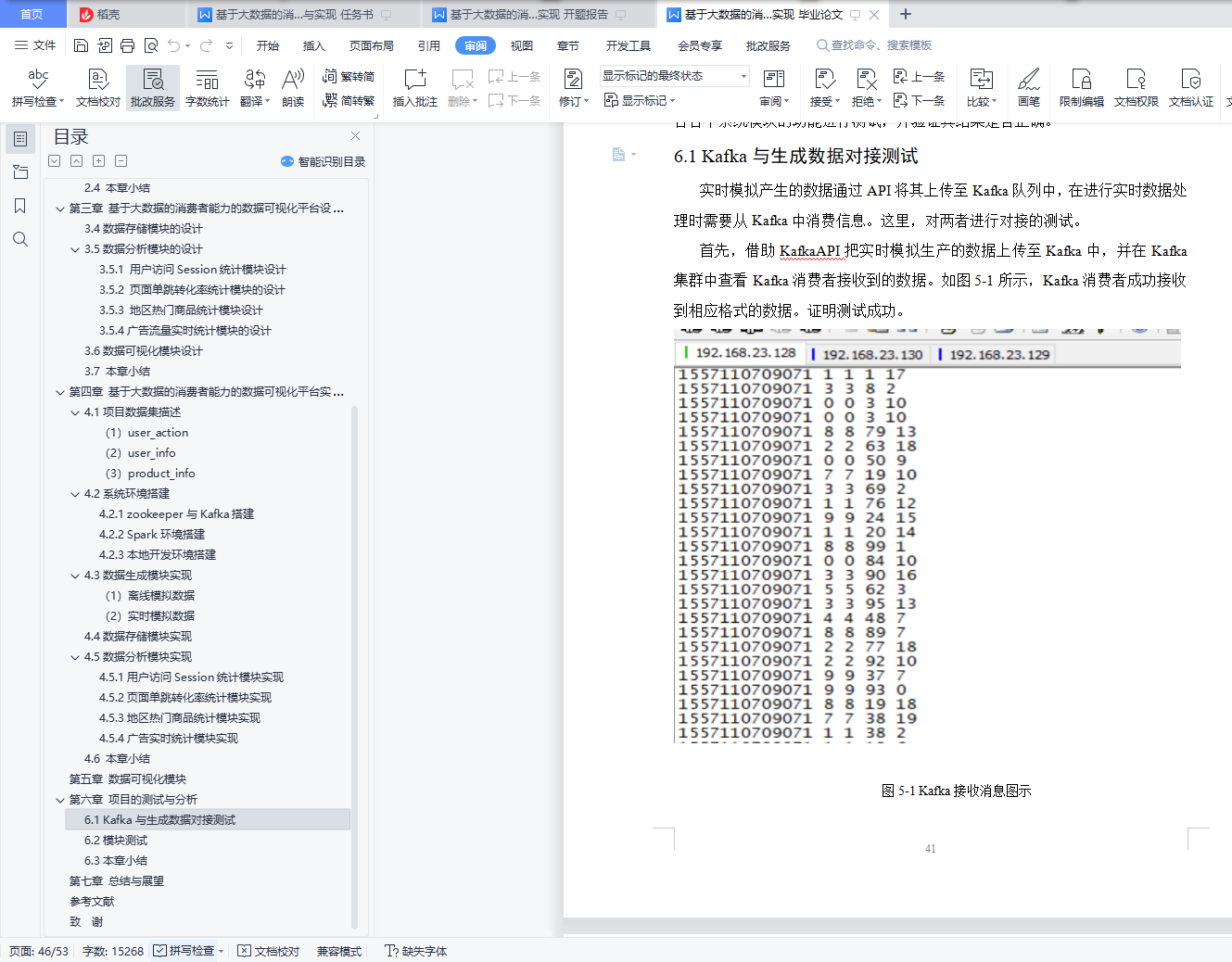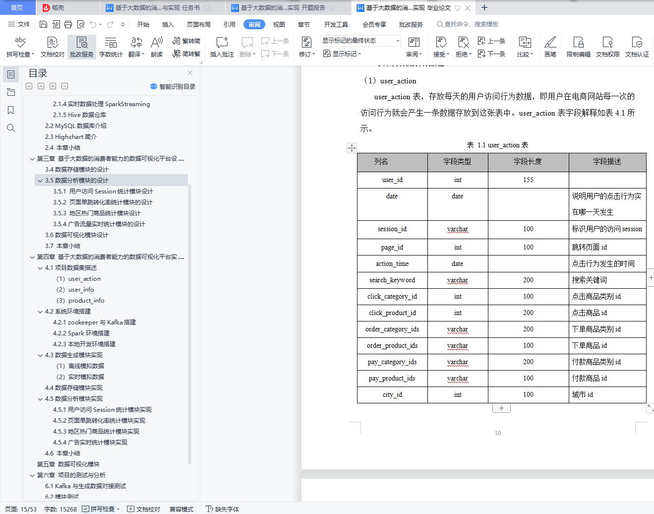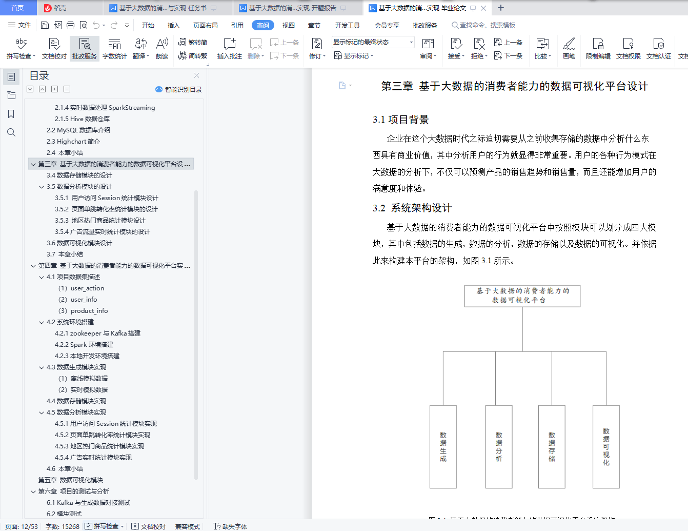 基于大数据的消费者能力的数据可视化平台设计与实现摘 要大数据时代的来临,为了提高企业核心竞争力,首先需要解决电子商务大数据领域中,本设计主要为解决商家无法找到精准客户的问题,通过科学的方式对目标市场中形态各异的消费者进行精细的划分,根据每个用户不同的消费习惯以及行为特征等信息,采用现代信息技术的手段和方法,指向明确的营销策略,实现对目标市场中不同消费者群体更加精准高效的营销方式。通过开发设计大数据可视化平台,实现商品对消费者的精准推荐,主要是对用户购买商品的记录做采集,用户当然是越多推荐结果也就越准确。然后我们对数据做数据挖掘,自己写推荐算法,找出商品与商品之间的亲密度,等用户再次登录的时候,会根据他购买过的商品,为他做出推荐,为他推荐出他可能喜欢的商品。消费者能力的数据可视化平台采用SparkCore+SparkSQL+SparkStreaming的大数据分析技术,并用MySQL作为数据库存储数据。本平台主要包括数据生成、数据分析、数据存储和数据可视化四个模块。通过电商数据平台对海量数据的分析,筛选出具有商业价值的数据,并利用可视化网站直观地呈现数据,辅助企业调整战略和业务,促进企业的发展。关键词:大数据;电商;消费者;数据分析;可视化Design and implementation of a data visualization platform for consumer capabilities based on big dataAbstractBig data era, in order to improve the core competitiveness, first need to solve the field of e-commerce big data, this design mainly to solve the problem of merchants cannot find accurate customers, through the scientific way of different consumers, according to each user's different consumption habits and behavior characteristics of information, using modern information technology means and methods, pointing to a clear marketing strategy, to achieve different consumer groups in the target market more accurate and efficient marketing methods.Through the development and design of a big data visualization platform, the accurate recommendation of goods to consumers is mainly to collect the records of users' goods purchases. Of course, the more users recommend, the more accurate the recommendation results are.Then we do data mining on the data, write the recommendation algorithm by ourselves, and find out the affinity between the goods. When the user will log in again, we will make recommendations for him according to the goods he has bought, and recommend the goods he may like for him.The consumer power data visualization platform uses the big data analysis technology of SparkCore + SparkSQL + SparkStreaming, and stores the data with MySQL as a database.The platform mainly includes four modules: data generation, data analysis, data storage and data visualization.Through the analysis of massive data by the e-commerce data platform, the data with commercial value is selected, and the visual website is used to visually present the data to assist enterprises to adjust their strategy and business and promote the development of enterprises.Key words: big data; e-commerce; consumer; data analysis; visualization目 录摘 要 IAbstract II第一章 绪论 11.1项目背景和意义 11.2项目研究内容 11.3论文组织架构 2第二章 相关技术介绍 32.1大数据技术介绍 32.1.1 Spark简介 32.1.2 弹性分布式数据集RDD 32.1.3数据处理模块SparkSQL 42.1.4实时数据处理SparkStreaming 42.1.5 Hive数据仓库 52.2 MySQL数据库介绍 52.3 Highchart简介 62.4 本章小结 6第三章 基于大数据的消费者能力的数据可视化平台设计 73.1项目背景 73.2 系统架构设计 73.3 数据生成模块的设计 83.4数据存储模块的设计 83.5数据分析模块的设计 83.5.1 用户访问Session统计模块设计 83.5.2 页面单跳转化率统计模块的设计 83.5.3 地区热门商品统计模块设计 93.5.4广告流量实时统计模块的设计 93.6数据可视化模块设计 93.7 本章小结 9第四章 基于大数据的消费者能力的数据可视化平台实现 104.1项目数据集描述 10(1)user_action 10(2)user_info 11(3)product_info 114.2系统环境搭建 124.2.1 zookeeper与Kafka搭建 124.2.2 Spark环境搭建 134.2.3本地开发环境搭建 144.3数据生成模块实现 14(1) 离线模拟数据 14(2)实时模拟数据 144.4数据存储模块实现 144.5数据分析模块实现 184.5.1用户访问Session统计模块实现 184.5.2页面单跳转化率统计模块实现 224.5.3地区热门商品统计模块实现 234.5.4广告实时统计模块实现 244.6 本章小结 29第五章 数据可视化模块 30第六章 项目的测试与分析 416.1 Kafka与生成数据对接测试 416.2模块测试 426.3本章小结 44第七章 总结与展望 45参考文献 46致 谢 48