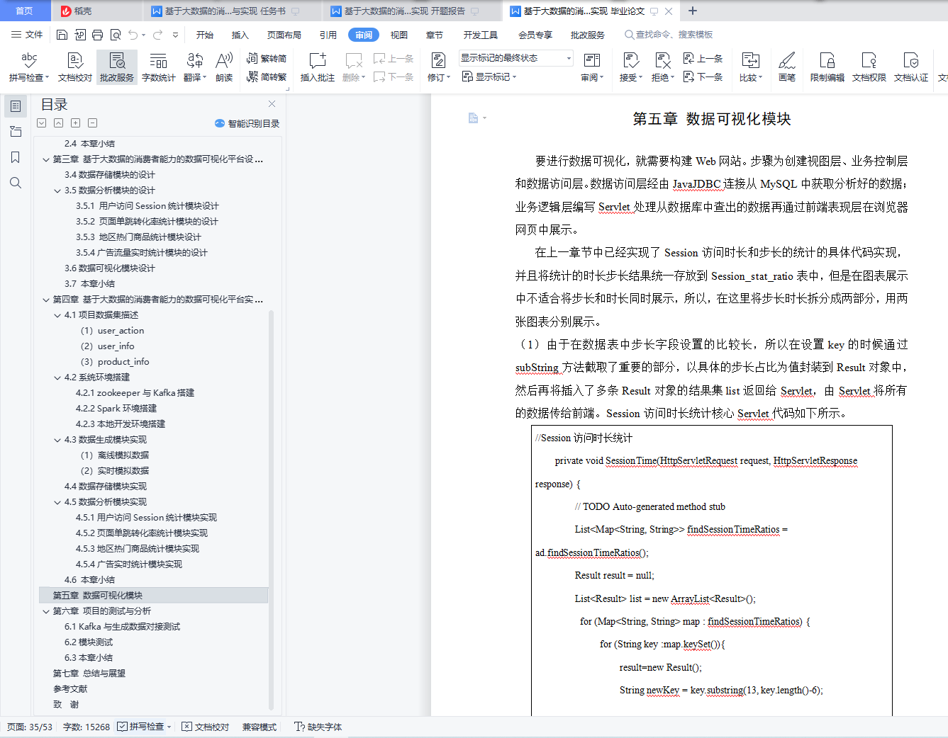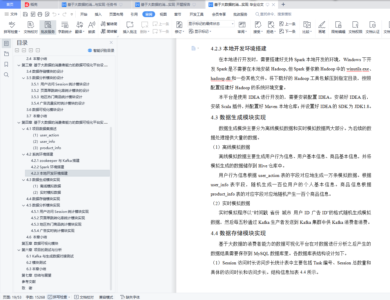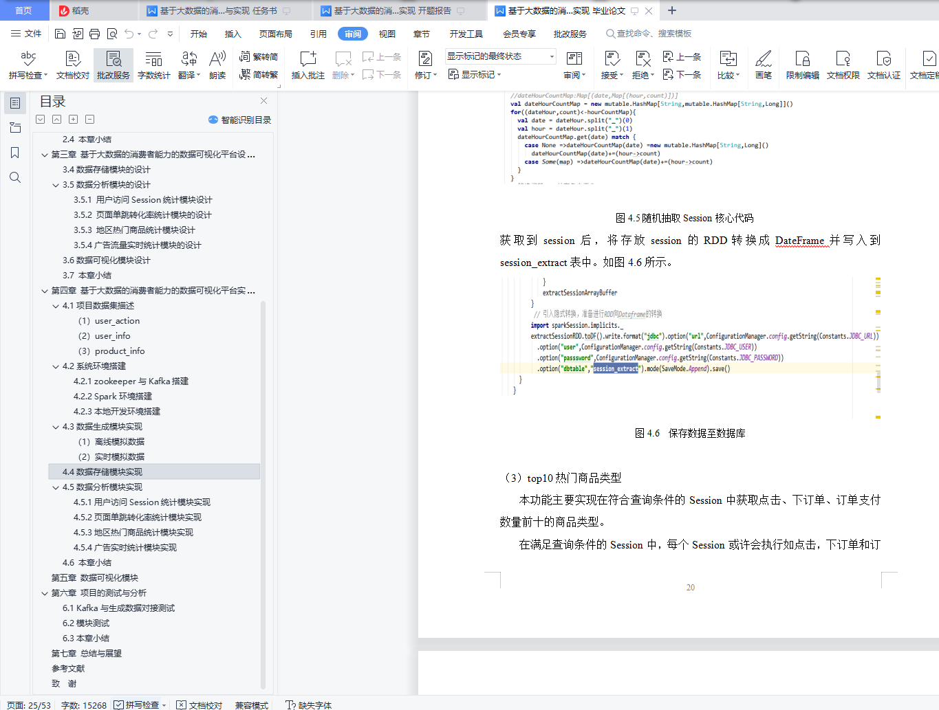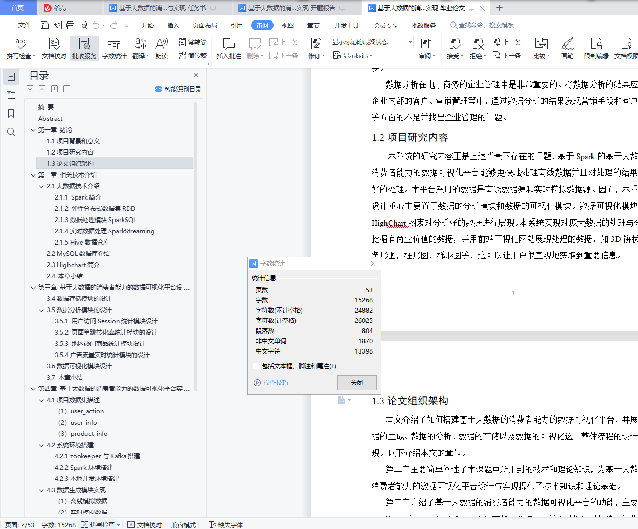 基于大数据的消费者能力的数据可视化平台设计与实现摘 要大数据时代的来临,为了提高企业核心竞争力,首先需要解决电子商务大数据领域中,本设计主要为解决商家无法找到精准客户的问题,通过科学的方式对目标市场中形态各异的消费者进行精细的划分,根据每个用户不同的消费习惯以及行为特征等信息,采用现代信息技术的手段和方法,指向明确的营销策略,实现对目标市场中不同消费者群体更加精准高效的营销方式。通过开发设计大数据可视化平台,实现商品对消费者的精准推荐,主要是对用户购买商品的记录做采集,用户当然是越多推荐结果也就越准确。然后我们对数据做数据挖掘,自己写推荐算法,找出商品与商品之间的亲密度,等用户再次登录的时候,会根据他购买过的商品,为他做出推荐,为他推荐出他可能喜欢的商品。消费者能力的数据可视化平台采用SparkCore+SparkSQL+SparkStreaming的大数据分析技术,并用MySQL作为数据库存储数据。本平台主要包括数据生成、数据分析、数据存储和数据可视化四个模块。通过电商数据平台对海量数据的分析,筛选出具有商业价值的数据,并利用可视化网站直观地呈现数据,辅助企业调整战略和业务,促进企业的发展。关键词:大数据;电商;消费者;数据分析;可视化Design and implementation of a data visualization platform for consumer capabilities based on big dataAbstractBig data era, in order to improve the core competitiveness, first need to solve the field of e-commerce big data, this design mainly to solve the problem of merchants cannot find accurate customers, through the scientific way of different consumers, according to each user's different consumption habits and behavior characteristics of information, using modern information technology means and methods, pointing to a clear marketing strategy, to achieve different consumer groups in the target market more accurate and efficient marketing methods.Through the development and design of a big data visualization platform, the accurate recommendation of goods to consumers is mainly to collect the records of users' goods purchases. Of course, the more users recommend, the more accurate the recommendation results are.Then we do data mining on the data, write the recommendation algorithm by ourselves, and find out the affinity between the goods. When the user will log in again, we will make recommendations for him according to the goods he has bought, and recommend the goods he may like for him.The consumer power data visualization platform uses the big data analysis technology of SparkCore + SparkSQL + SparkStreaming, and stores the data with MySQL as a database.The platform mainly includes four modules: data generation, data analysis, data storage and data visualization.Through the analysis of massive data by the e-commerce data platform, the data with commercial value is selected, and the visual website is used to visually present the data to assist enterprises to adjust their strategy and business and promote the development of enterprises.Key words: big data; e-commerce; consumer; data analysis; visualization目 录摘 要 IAbstract II第一章 绪论 11.1项目背景和意义 11.2项目研究内容 11.3论文组织架构 2第二章 相关技术介绍 32.1大数据技术介绍 32.1.1 Spark简介 32.1.2 弹性分布式数据集RDD 32.1.3数据处理模块SparkSQL 42.1.4实时数据处理SparkStreaming 42.1.5 Hive数据仓库 52.2 MySQL数据库介绍 52.3 Highchart简介 62.4 本章小结 6第三章 基于大数据的消费者能力的数据可视化平台设计 73.1项目背景 73.2 系统架构设计 73.3 数据生成模块的设计 83.4数据存储模块的设计 83.5数据分析模块的设计 83.5.1 用户访问Session统计模块设计 83.5.2 页面单跳转化率统计模块的设计 83.5.3 地区热门商品统计模块设计 93.5.4广告流量实时统计模块的设计 93.6数据可视化模块设计 93.7 本章小结 9第四章 基于大数据的消费者能力的数据可视化平台实现 104.1项目数据集描述 10(1)user_action 10(2)user_info 11(3)product_info 114.2系统环境搭建 124.2.1 zookeeper与Kafka搭建 124.2.2 Spark环境搭建 134.2.3本地开发环境搭建 144.3数据生成模块实现 14(1) 离线模拟数据 14(2)实时模拟数据 144.4数据存储模块实现 144.5数据分析模块实现 184.5.1用户访问Session统计模块实现 184.5.2页面单跳转化率统计模块实现 224.5.3地区热门商品统计模块实现 234.5.4广告实时统计模块实现 244.6 本章小结 29第五章 数据可视化模块 30第六章 项目的测试与分析 416.1 Kafka与生成数据对接测试 416.2模块测试 426.3本章小结 44第七章 总结与展望 45参考文献 46致 谢 48