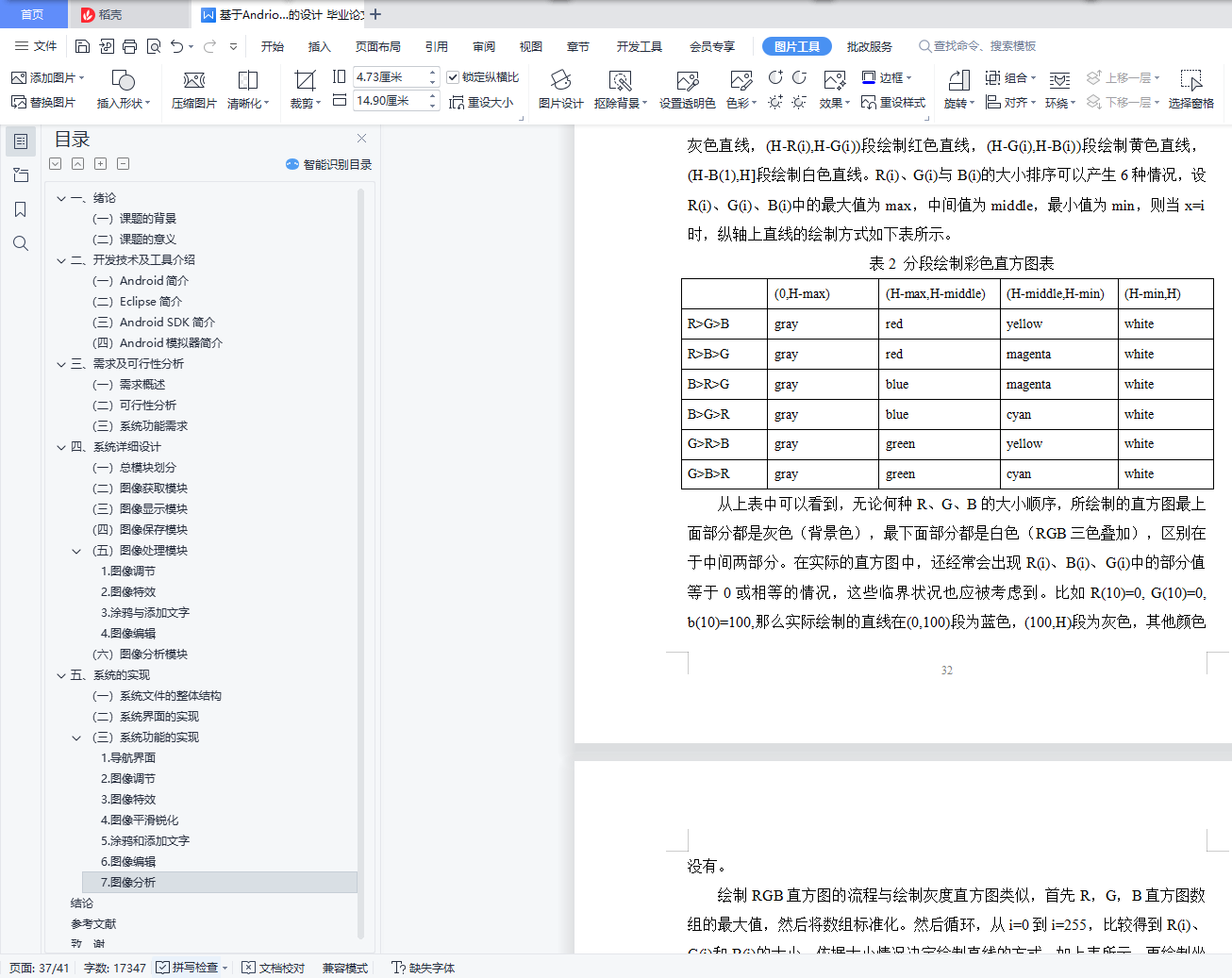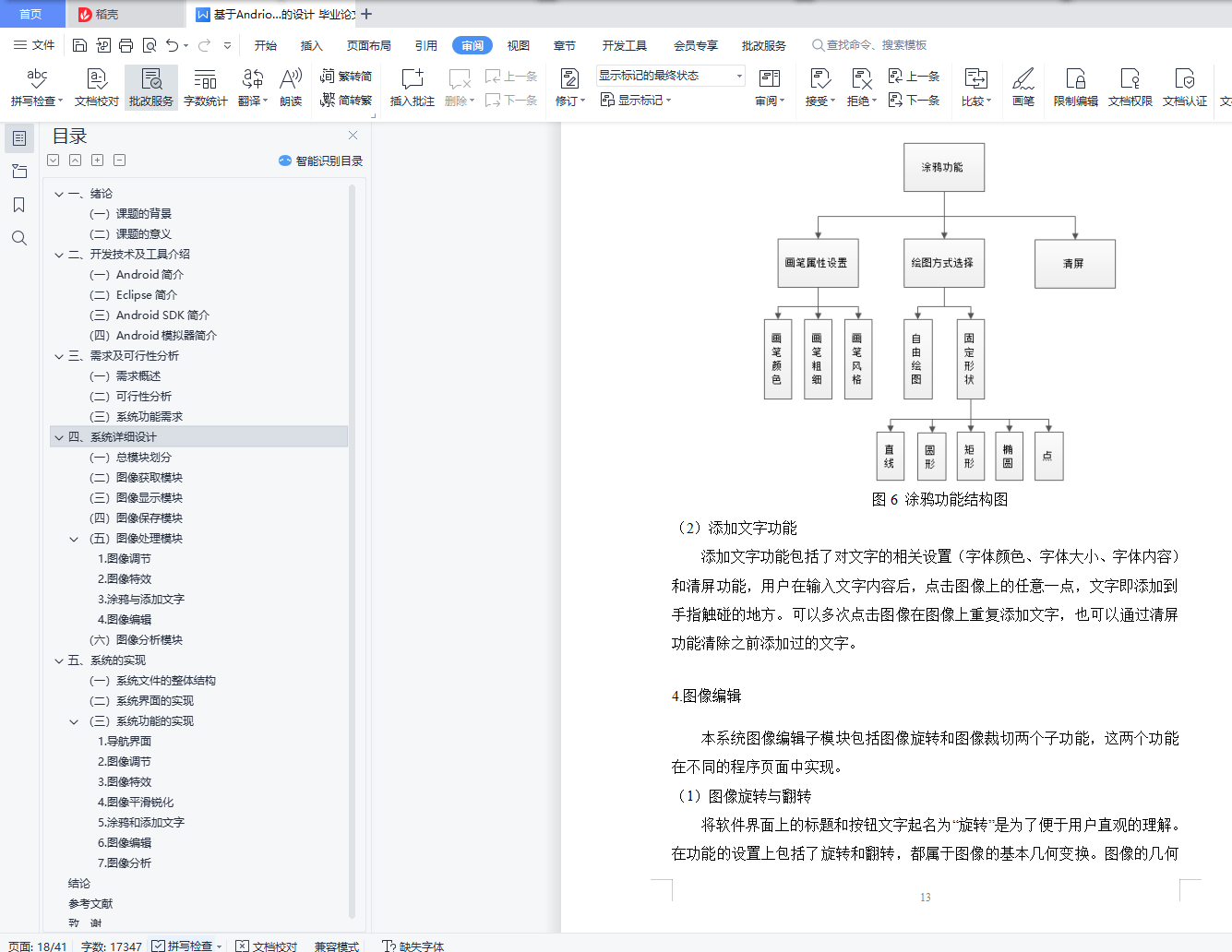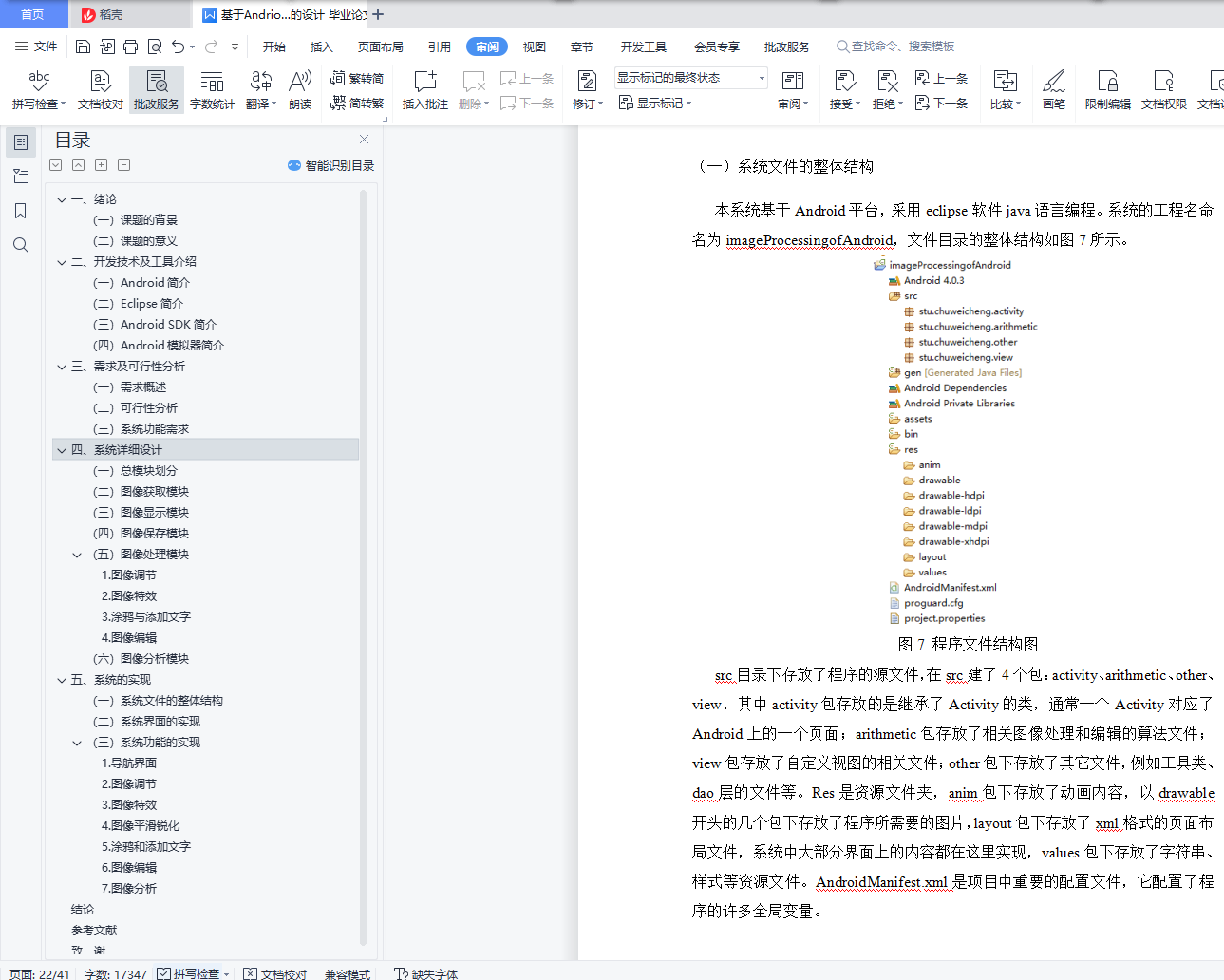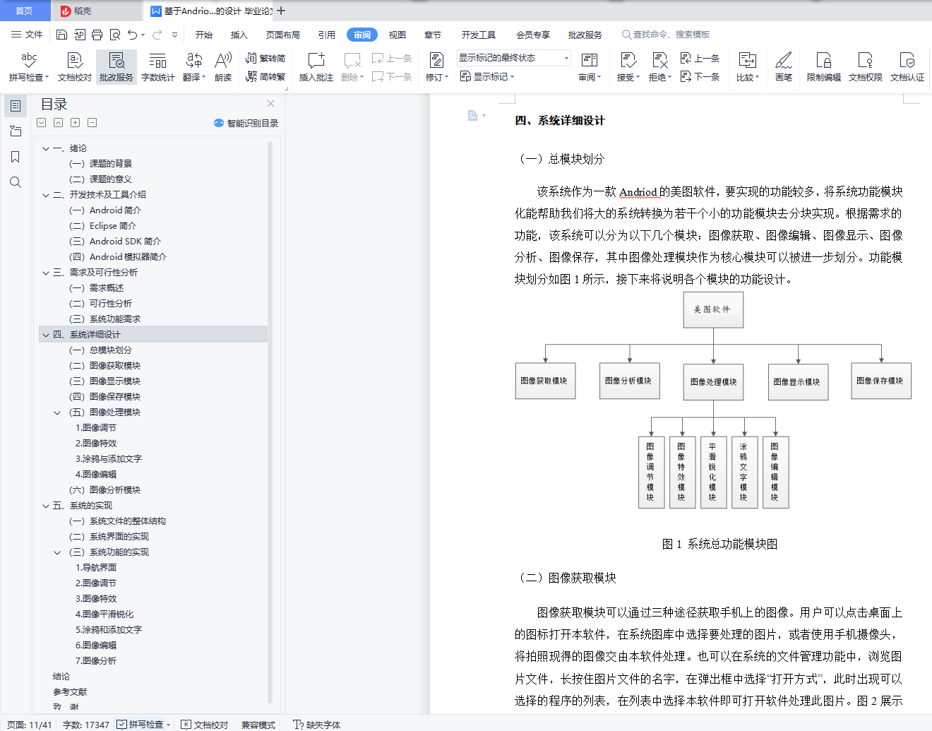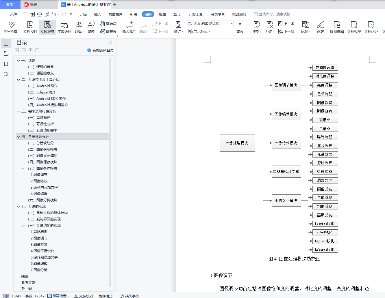 内容提要智能终端在我们的生活中扮演着越来越重要的角色,目前应用最广泛的智能终端平台是谷歌推出的Android,帮助治疗。本文基于Android平台设计开发美图软件。本次设计使用Eclipse作为我的开发工具使用Java 语言开发了一个系统。本系统实现了图像编辑处理的基本功能,包括图像调整、图像特效、平滑锐化、图像编辑等功能。完成的系统操作简单方便,功能更加实用,在安卓手机上也能流畅运行。关键字:Android;图像处理;Eclipse;Java;APPAbstractSmart terminals play an increasingly important role in our lives, and currently the most widely used smart terminal platform is Google launched Android, to help treat.This paper designs and develops Meitu software based on the Android platform.This design uses Eclipse as my development tool and developed a system using the Java language.The system implements the basic functions of image editing processing, including image adjustment, image special effects, smooth sharpening, image editing and other functions.The system is simple and convenient to operate, more practical, and can run smoothly on Android phones.Keywords: Android; image beautification; Eclipse; Java; APP目 录一、绪论 1(一)课题的背景 1(二)课题的意义 1二、开发技术及工具介绍 2(一)Android简介 2(二)Eclipse简介 2(三)Android SDK简介 2(四)Android模拟器简介 3三、需求及可行性分析 4(一)需求概述 4(二)可行性分析 4(三)系统功能需求 5四、系统详细设计 6(一)总模块划分 6(二)图像获取模块 6(三)图像显示模块 7(四)图像保存模块 9(五)图像处理模块 91.图像调节 102.图像特效 113.涂鸦与添加文字 124.图像编辑 13(六)图像分析模块 15(1)图像参数显示 15(2)图像的直方图显示 15五、系统的实现 17(一)系统文件的整体结构 17(二)系统界面的实现 18(三)系统功能的实现 181.导航界面 182.图像调节 193.图像特效 214.图像平滑锐化 225.涂鸦和添加文字 236.图像编辑 257.图像分析 29结论 34参考文献 35致 谢 36