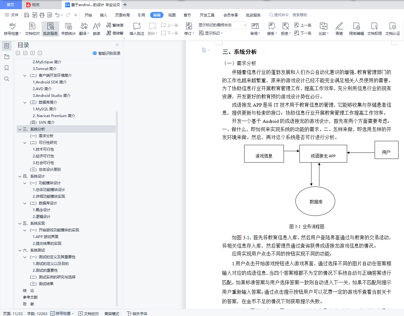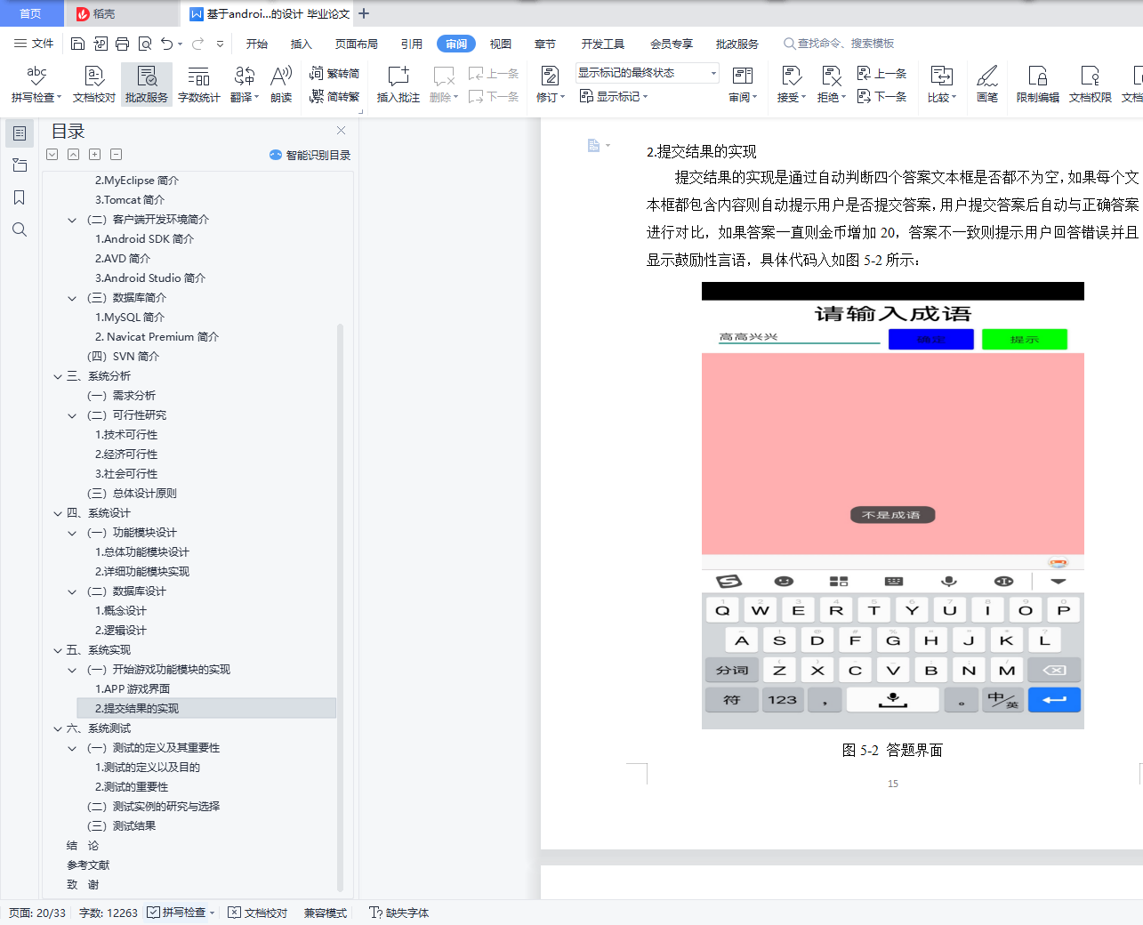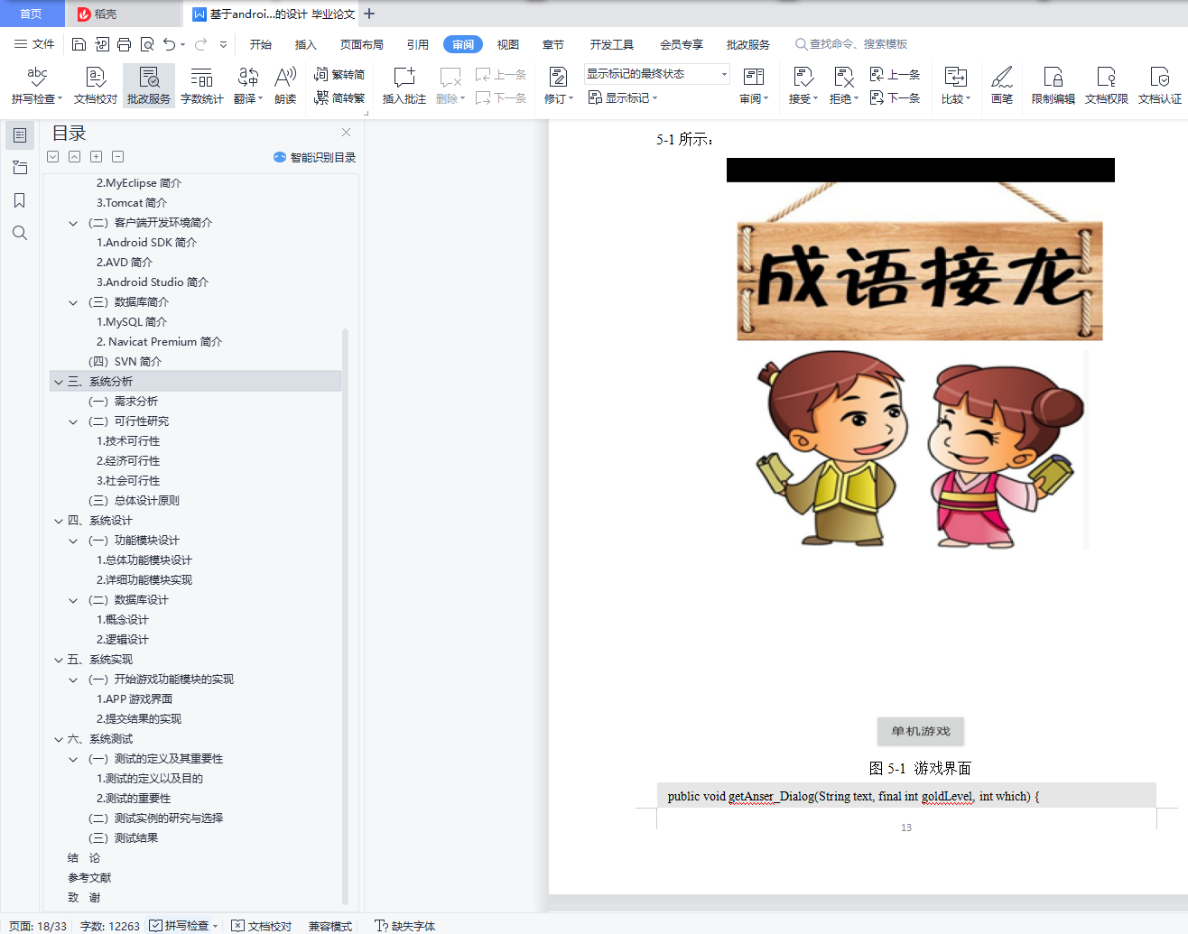 内容提要成语是博大精深的汉语中非常重要的一种语言形式。简单的四字成语中常带有中国古代的历史故事,及富有哲学意义,成语接龙游戏作为益智类游戏被人们所熟悉,而成语接龙的加入使得Android手机的娱乐功能如虎添翼。随着计算机技术的迅猛发展,相关的各行各业也获得了迅猛的发展,教育游戏行业也不例外,以其独有的魅力迅速在教育领域占据了一席之地,其凸显的教育价值将在教育领域有着巨大的发展空间。此次毕业设计的初衷就是想设计出一个能够在任何环境任何时间都能够放松心情和娱乐心身的单机游戏,只要通过简单和易操作的Android游戏帮助手机用户在打发他们闲暇时间的同时,增加成语词汇量并娱乐心身和放松心情。本系统前端采用Android进行开发,后端利用Java的WEB框架以及MySQL数据库来实现。运行结果表明该APP具有良好的稳定性和可扩展性,这对于方便用户玩游戏,提升游戏体验有着重要的意义。[关键词]:游戏;猜成语;成语接龙;Java;MySQLAbstractIdiom is a very important language form in the extensive and profound Chinese language.Simple four-character idioms often contain ancient Chinese historical stories and philosophical significance. idiom solitaire game is familiar as a puzzle game, and the addition of idiom solitaire makes the entertainment function of Android mobile phone add wings.With the rapid development of computer technology, the industries related to all walks of life have also achieved rapid development, and the education game industry is no exception. With its unique charm, it quickly occupies a place in the field of education, and its prominent educational value will have a huge space for development in the education field.The original intention of the graduation design is to design a stand-alone game that can relax and entertain mind at any time in any environment. As long as the simple and easy to operate Android games help mobile phone users to increase their idiom vocabulary and entertain their mind and relax while killing their spare time.The front end of this system is developed by Android, and the back end uses Java's WEB framework and MySQL database.The operation results show that the APP has good stability and scalability, which is of great significance for facilitating users to play games and improve the game experience.[Key words]: Game; guess idioms; idiom solitaire; Java; MySQL目 录一、绪论 1(一)研究背景 1(二)国内外研究现状 11.国内研究现状 12.国外研究现状 2(三)论文组织结构 3二、开发环境简介 4(一)服务端开发环境简介 41. JDK简介 42.MyEclipse简介 43.Tomcat简介 4(二)客户端开发环境简介 41.Android SDK简介 42.AVD简介 53.Android Studio简介 5(三)数据库简介 51.MySQL简介 52. Navicat Premium简介 5(四)SVN简介 5三、系统分析 6(一)需求分析 6(二)可行性研究 71.技术可行性 72.经济可行性 73.社会可行性 7(三)总体设计原则 8四、系统设计 9(一)功能模块设计 91.总体功能模块设计 92.详细功能模块实现 9(二)数据库设计 101.概念设计 102.逻辑设计 11五、系统实现 13(一)开始游戏功能模块的实现 131.APP游戏界面 132.提交结果的实现 15六、系统测试 21(一)测试的定义及其重要性 211.测试的定义以及目的 212.测试的重要性 21(二)测试实例的研究与选择 22(三)测试结果 25结 论 26参考文献 27致 谢 28