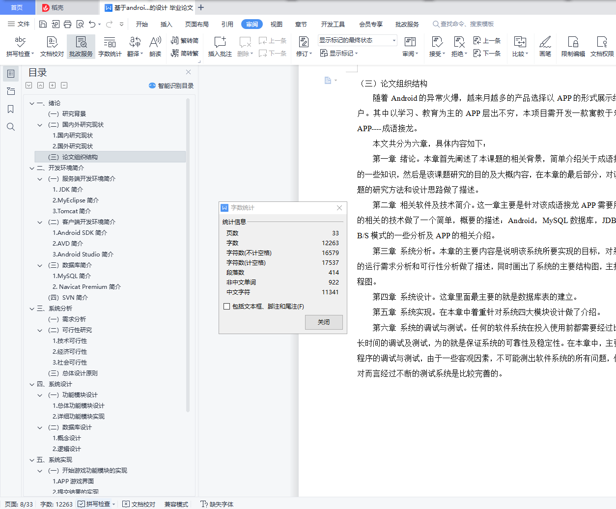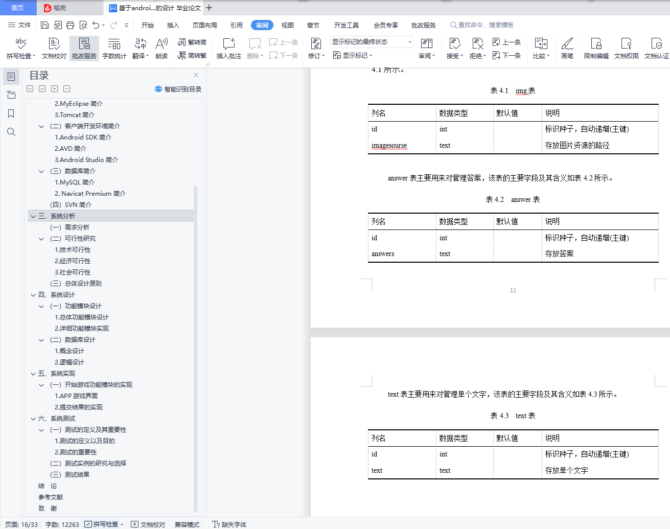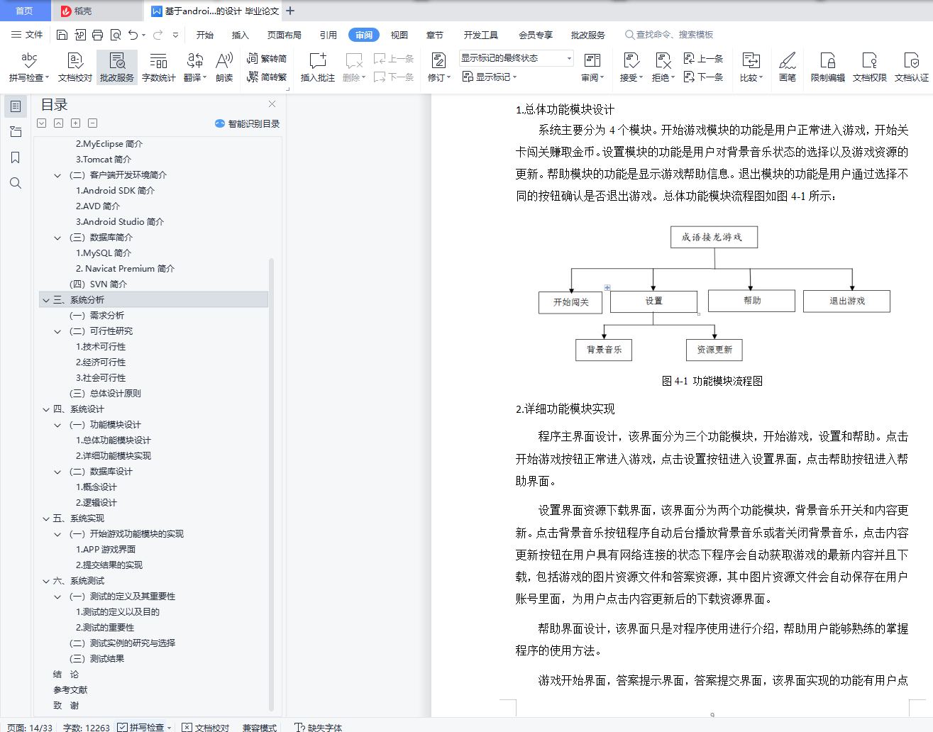 内容提要成语是博大精深的汉语中非常重要的一种语言形式。简单的四字成语中常带有中国古代的历史故事,及富有哲学意义,成语接龙游戏作为益智类游戏被人们所熟悉,而成语接龙的加入使得Android手机的娱乐功能如虎添翼。随着计算机技术的迅猛发展,相关的各行各业也获得了迅猛的发展,教育游戏行业也不例外,以其独有的魅力迅速在教育领域占据了一席之地,其凸显的教育价值将在教育领域有着巨大的发展空间。此次毕业设计的初衷就是想设计出一个能够在任何环境任何时间都能够放松心情和娱乐心身的单机游戏,只要通过简单和易操作的Android游戏帮助手机用户在打发他们闲暇时间的同时,增加成语词汇量并娱乐心身和放松心情。本系统前端采用Android进行开发,后端利用Java的WEB框架以及MySQL数据库来实现。运行结果表明该APP具有良好的稳定性和可扩展性,这对于方便用户玩游戏,提升游戏体验有着重要的意义。[关键词]:游戏;猜成语;成语接龙;Java;MySQLAbstractIdiom is a very important language form in the extensive and profound Chinese language.Simple four-character idioms often contain ancient Chinese historical stories and philosophical significance. idiom solitaire game is familiar as a puzzle game, and the addition of idiom solitaire makes the entertainment function of Android mobile phone add wings.With the rapid development of computer technology, the industries related to all walks of life have also achieved rapid development, and the education game industry is no exception. With its unique charm, it quickly occupies a place in the field of education, and its prominent educational value will have a huge space for development in the education field.The original intention of the graduation design is to design a stand-alone game that can relax and entertain mind at any time in any environment. As long as the simple and easy to operate Android games help mobile phone users to increase their idiom vocabulary and entertain their mind and relax while killing their spare time.The front end of this system is developed by Android, and the back end uses Java's WEB framework and MySQL database.The operation results show that the APP has good stability and scalability, which is of great significance for facilitating users to play games and improve the game experience.[Key words]: Game; guess idioms; idiom solitaire; Java; MySQL目 录一、绪论 1(一)研究背景 1(二)国内外研究现状 11.国内研究现状 12.国外研究现状 2(三)论文组织结构 3二、开发环境简介 4(一)服务端开发环境简介 41. JDK简介 42.MyEclipse简介 43.Tomcat简介 4(二)客户端开发环境简介 41.Android SDK简介 42.AVD简介 53.Android Studio简介 5(三)数据库简介 51.MySQL简介 52. Navicat Premium简介 5(四)SVN简介 5三、系统分析 6(一)需求分析 6(二)可行性研究 71.技术可行性 72.经济可行性 73.社会可行性 7(三)总体设计原则 8四、系统设计 9(一)功能模块设计 91.总体功能模块设计 92.详细功能模块实现 9(二)数据库设计 101.概念设计 102.逻辑设计 11五、系统实现 13(一)开始游戏功能模块的实现 131.APP游戏界面 132.提交结果的实现 15六、系统测试 21(一)测试的定义及其重要性 211.测试的定义以及目的 212.测试的重要性 21(二)测试实例的研究与选择 22(三)测试结果 25结 论 26参考文献 27致 谢 28