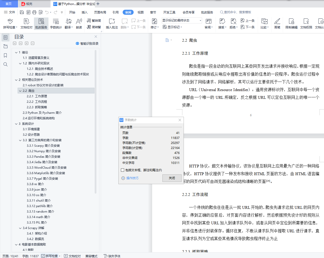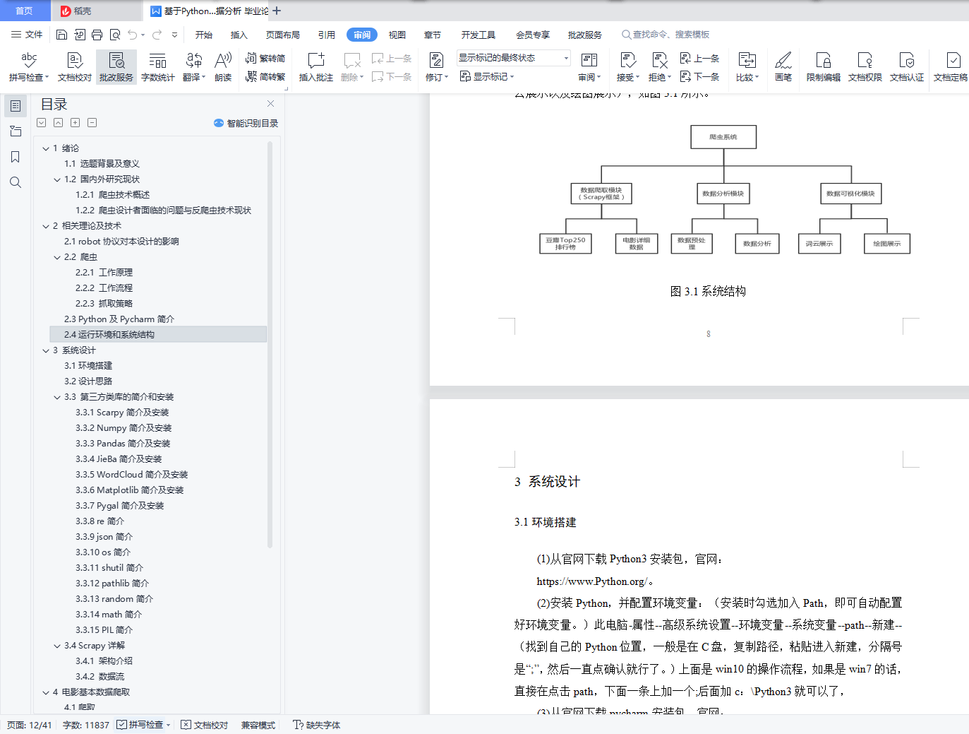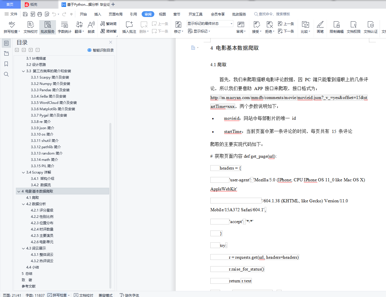 基于Python的影片数据爬取与数据分析XXXX(XXXXXXXXXX,XX XXXXXX)摘 要数据分析与可视化是当今数据分析的发展方向。大数据时代,数据资源具有海量特征。数据分析和可视化主要通过Python数据分析来实现。基于Python的数据分析可视化和技术实现是目前Python数据分析的主要目的,Python可以为数据分析可视化提供思路,在体现数据价值方面发挥着重要作用。因此,在研究数据分析、可视化的过程中,我们可以看到Python具有重要的应用价值。BeautifulSoup 基于Python 的设计让您可以快速高效地抓取网站数据,Pandas 工具提供简单灵活的数据清理和分析,Python Matplotlib 工具包可以轻松将数据分析结果以图形方式可视化。在本文中,您将阅读Python中功能齐全的标准库,一个强大的第三方库请求,以编程方式使用Beautiful Soup和正则表达式从film.csv文件中读取电影信息数据,对读取的数据进行清理和组织,并使用Bar函数对节目电影的周平均票房输出(周平均票房代表该文件所包含的所有城市的整体周平均票房),Y轴代表以万元为单位的票房收入。 X 轴代表电影名称。通过Matplotlib 图形库,将数据结果以图形方式展示并分析得出相关结论。本论文的研究为培养学生的数据处理能力和可视化分析能力奠定了基础。关键词:Python;爬虫;电影数据;数据分析;可视化Movie data crawl and data analysis based on PythonXXXX(XXXXXXXXXX,XX XXXXXX)AbstractData analysis and visualization is the development direction of data analysis today.In the era of big data, data resources have massive characteristics.Data analysis and visualization are achieved primarily through Python data analysis.Python-based data analysis visualization and technical implementation are the main purpose of Python data analysis. Python can provide ideas for data analysis visualization and play an important role in reflecting the value of data.Therefore, in the process of studying data analysis and visualization, we can see that Python has an important application value.BeautifulSoup's Python-based design allows you to quickly and efficiently grab website data, Pandas tools provide simple and flexible data cleaning and analysis, and the Python Matplotlib toolkit can easily visualize data analysis results graphically.In this article, you will read the fully functional standard library in Python, a powerful third-party library request, programmatically read movie information from film.csv files using Beautiful Soup and regular expressions, clean and organize the read data, and use the Bar function to output the weekly average box office represents the overall weekly box office of all cities included in the file). The Y axis represents revenue in ten thousand yuan.The X-axis represents the movie name.Through the Matplotlib graphics library, the data results are graphically displayed and analyzed to draw relevant conclusions.The research in this paper lays the foundation for cultivating students' data processing ability and visual analysis ability.Key words: Python; crawler; movie data; data analysis; visualization目 录1绪论 11.1 选题背景及意义 11.2 国内外研究现状 11.2.1 爬虫技术概述 11.2.2 爬虫设计者面临的问题与反爬虫技术现状 32 相关理论及技术 62.1 robot协议对本设计的影响 62.2 爬虫 62.2.1 工作原理 62.2.2 工作流程 72.2.3 抓取策略 72.3 Python及Pycharm简介 82.4运行环境和系统结构 83 系统设计 93.1环境搭建 93.2设计思路 93.3 第三方类库的简介和安装 103.3.1 Scarpy简介及安装 103.3.2 Numpy简介及安装 113.3.3 Pandas简介及安装 113.3.4 JieBa简介及安装 123.3.5 WordCloud简介及安装 123.3.6 Matplotlib简介及安装 123.3.7 Pygal简介及安装 123.3.8 re简介 123.3.9 json简介 133.3.10 os简介 133.3.11 shutil简介 133.3.12 pathlib简介 133.3.13 random简介 133.3.14 math简介 143.3.15 PIL简介 143.4 Scrapy详解 143.4.1 架构介绍 143.4.2 数据流 154 电影基本数据爬取 174.1爬取 174.2数据分析 194.2.1评分星级 194.2.2性别比例 214.2.3位置分布 224.2.4时评数量 254.2.5主要演员 274.2.6电影单元 294.3词云展示 304.3.1整体词云 304.3.2热评词云 324.4小结 345 总结 35致 谢 36参考文献 37